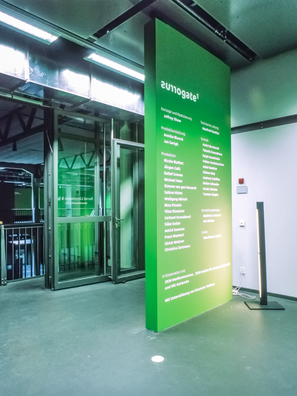 surrogate describes new forms of expression and unfamiliar spaces of experience: models of virtual worlds that require cooperation and coordinated interaction from several visitors. The viewers can either interact together on location or be joined via a network. Some exhibits link real and virtual object worlds, other works thematize societal reality and social processes. Especially these works show that today numerous artists are committed to moving beyond the aesthetic context and questioning technology's ambivalent influence and imprecise responsibility.