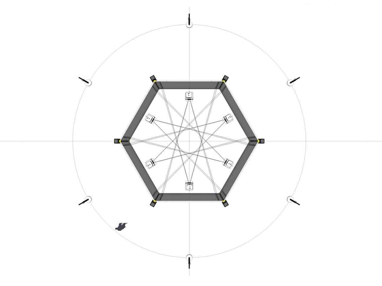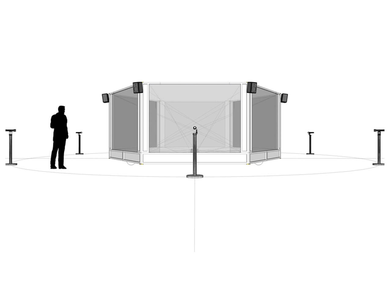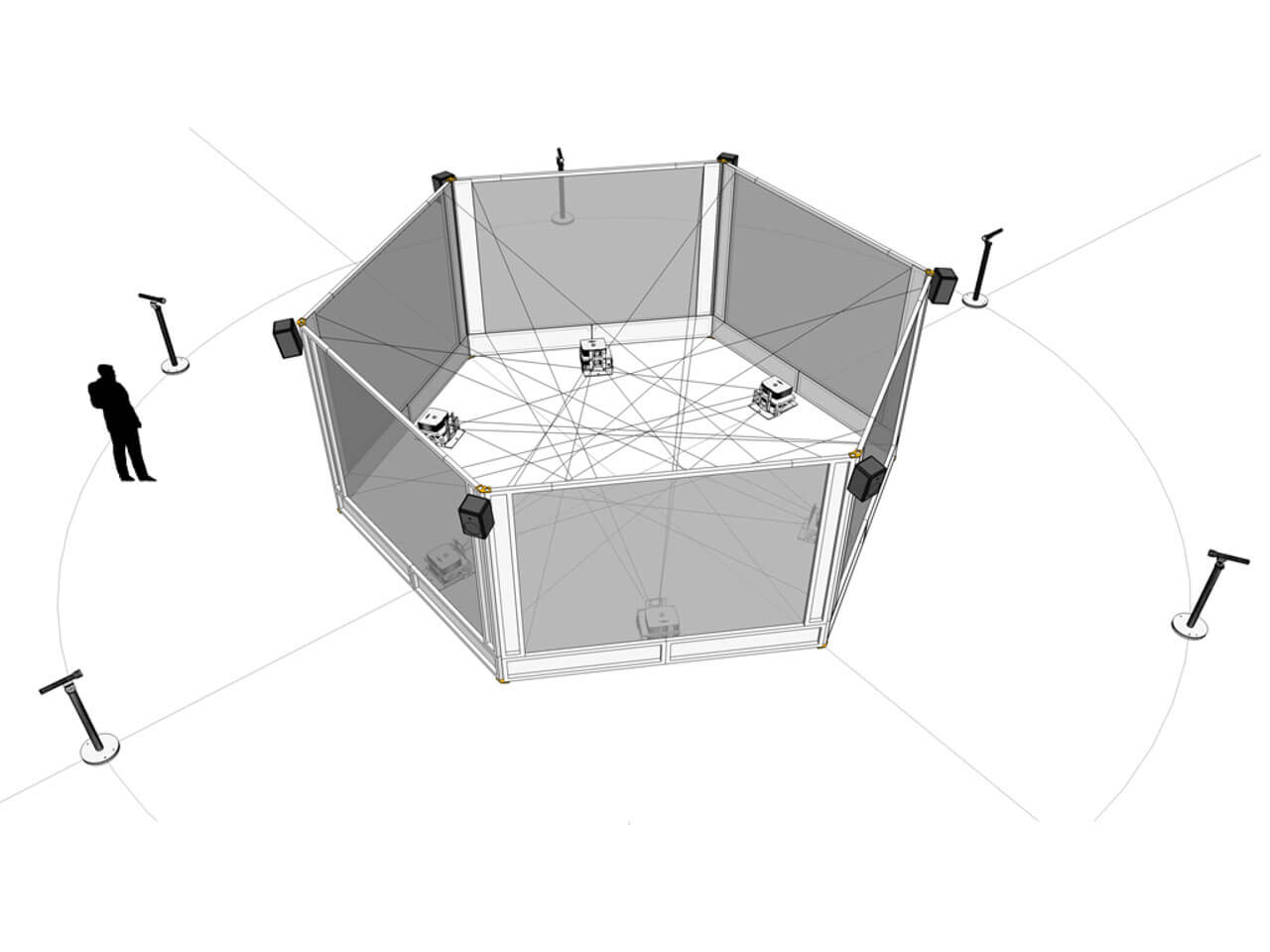Re-ACTOR derives from The Virtual Room originally developed at Museum Victoria by VROOM Inc. It is a hexagonal container whose six walls are passive stereoscopic back projection screens. Within the container are 12 projectors enabling passive back projection on each screen. Viewers stand outside the container, and moving around it are able to see a 3D virtual world from six distinct point of view. These virtual scenes can either be computer generated, or real world recordings with six stereo video cameras. Interaction interfaces and tracking devices can be added to this system.