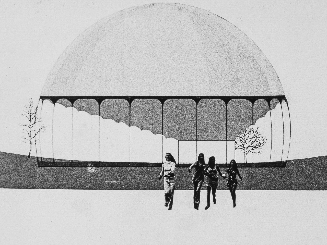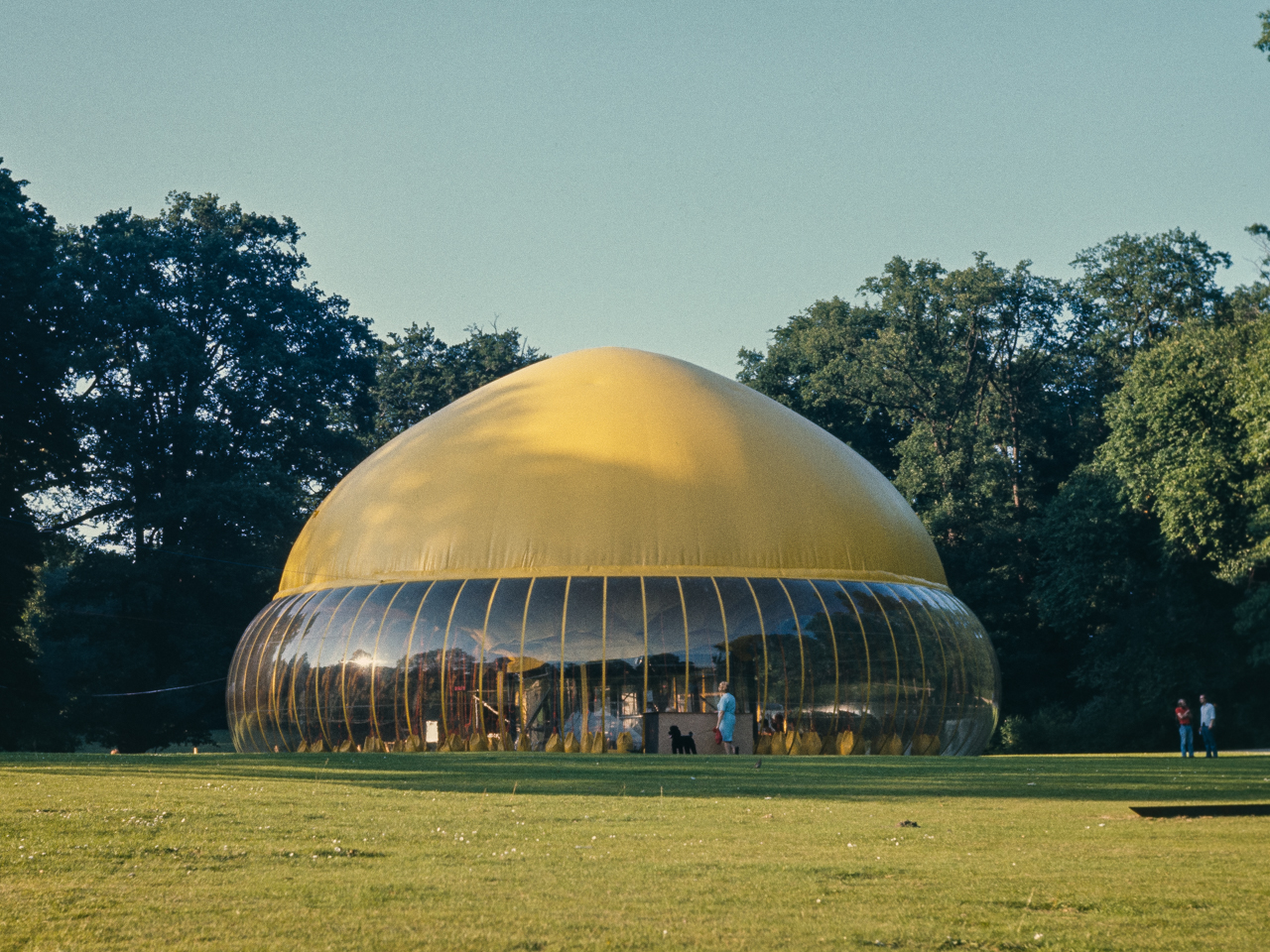The upper floor of this structure had a yellow, air-supported, dome-shaped roof that could be removed to create an open-air theatre. Its emergency exits were simply zips in the wall and rope ladders that could unfurl down the outside of the ground-floor cylinder.