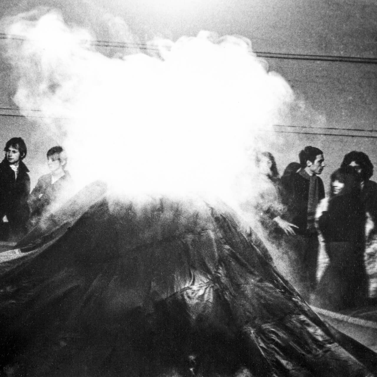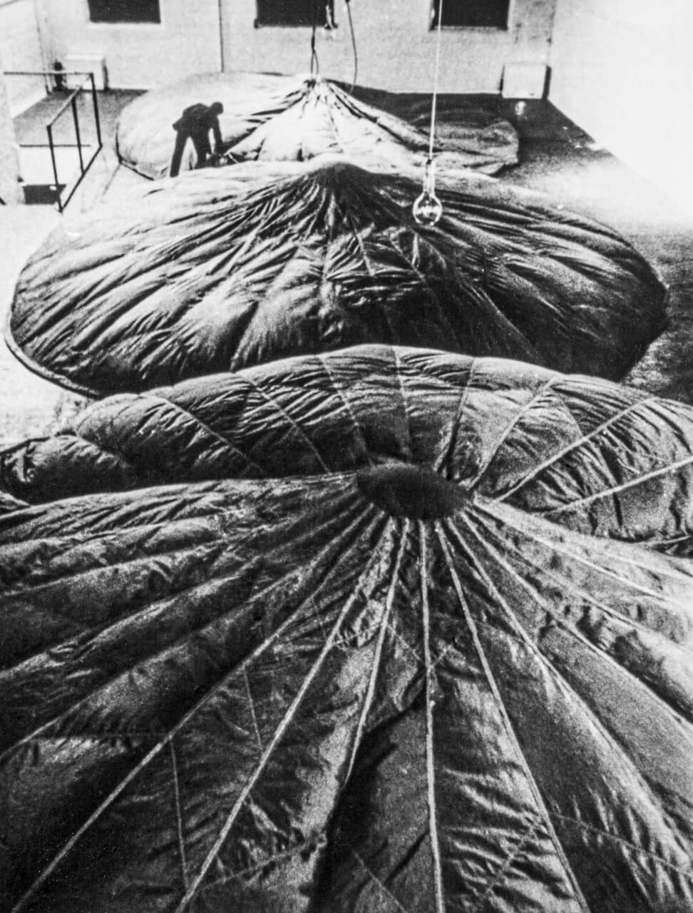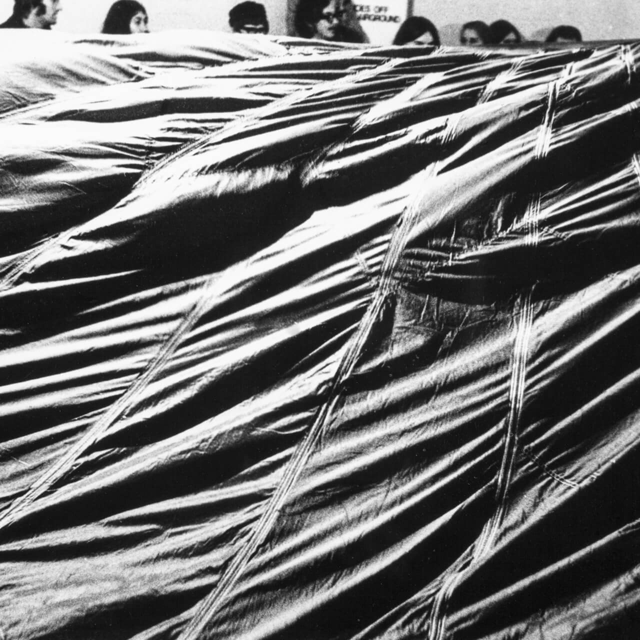 For Black Airground the artists positioned three black military surplus parachutes in a row on the floor of the gallery in the Oxford Museum of Art, entirely filling the exhibition space. Weighted around their rims with sand, these parachutes were continuously inflated with air so that their silk fabric delicately ballooned upwards into the room.