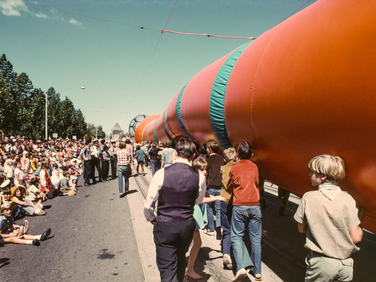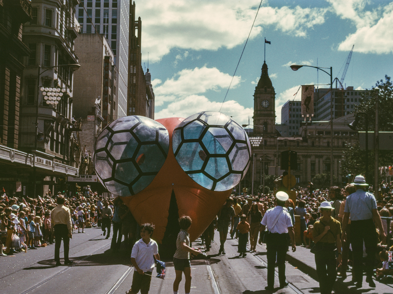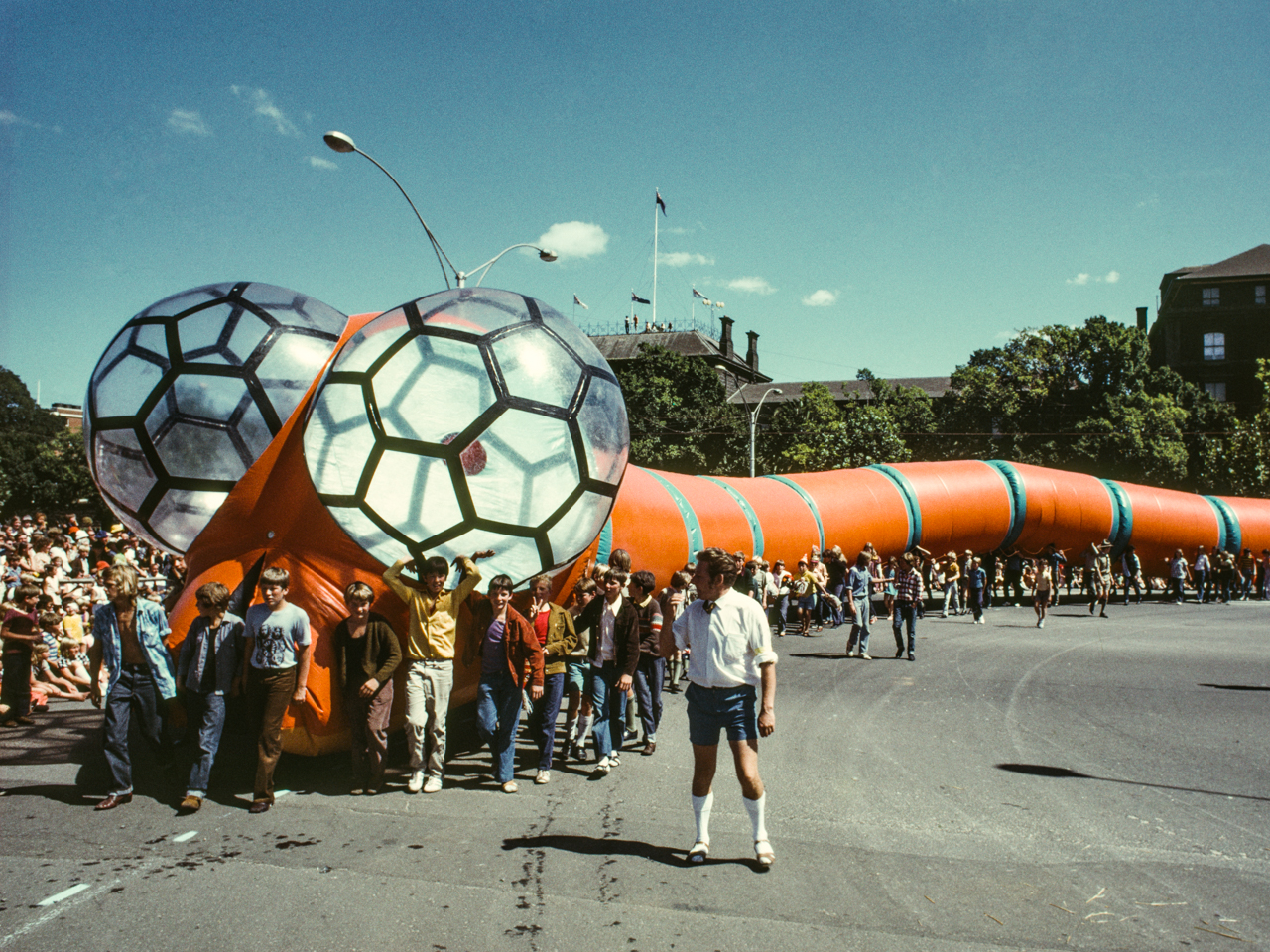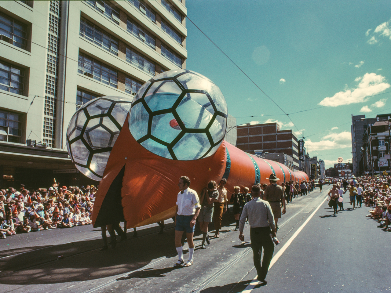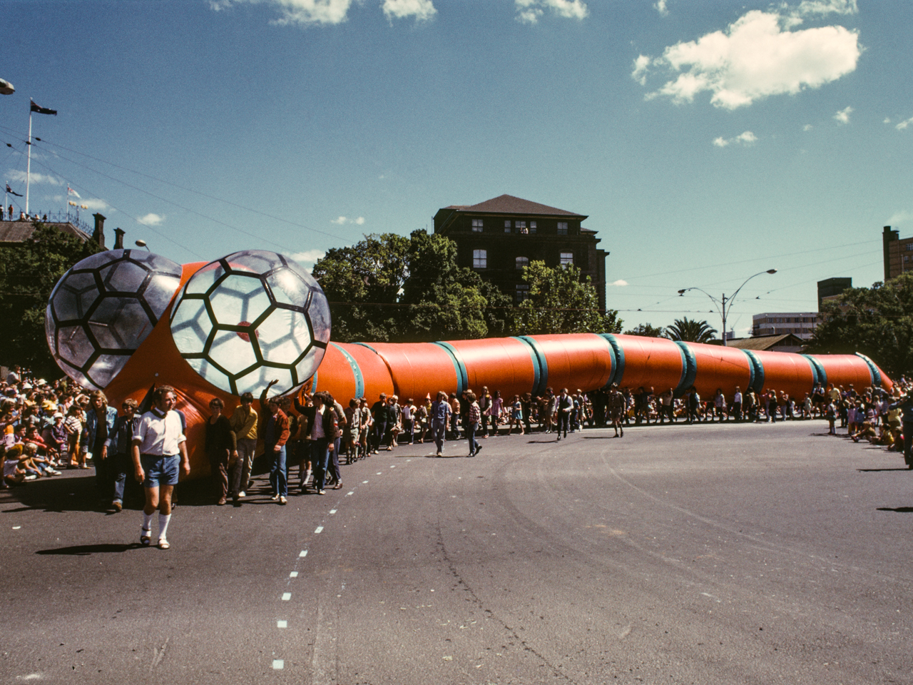 Made for the Moomba Festival in Melbourne, the Centipede was a large air-inflated parade creature whose ‘hundred feet’ were provided by people from the general public who spontaneously joined to carry it through the streets.