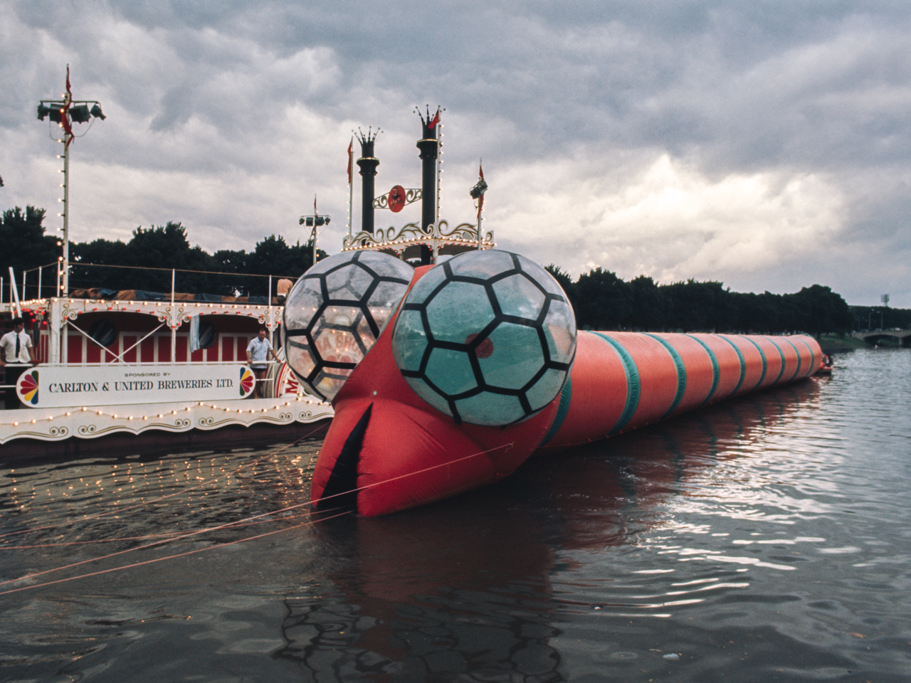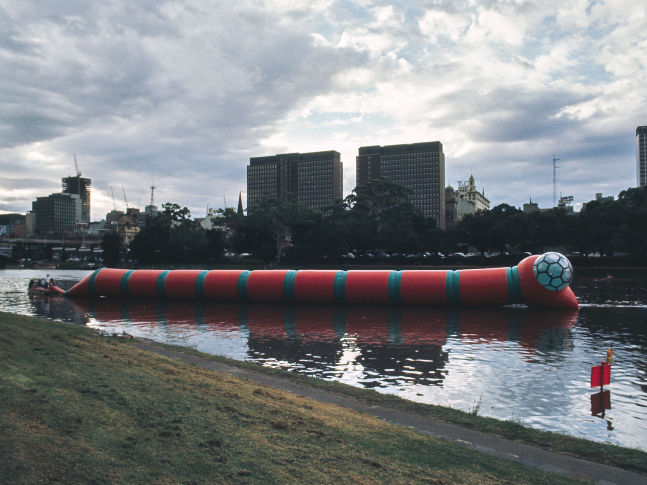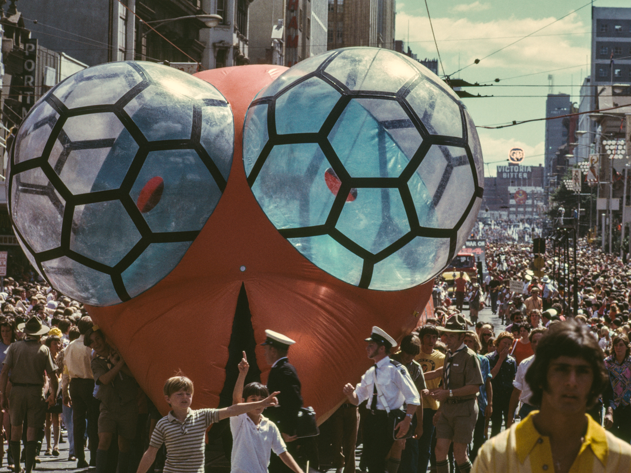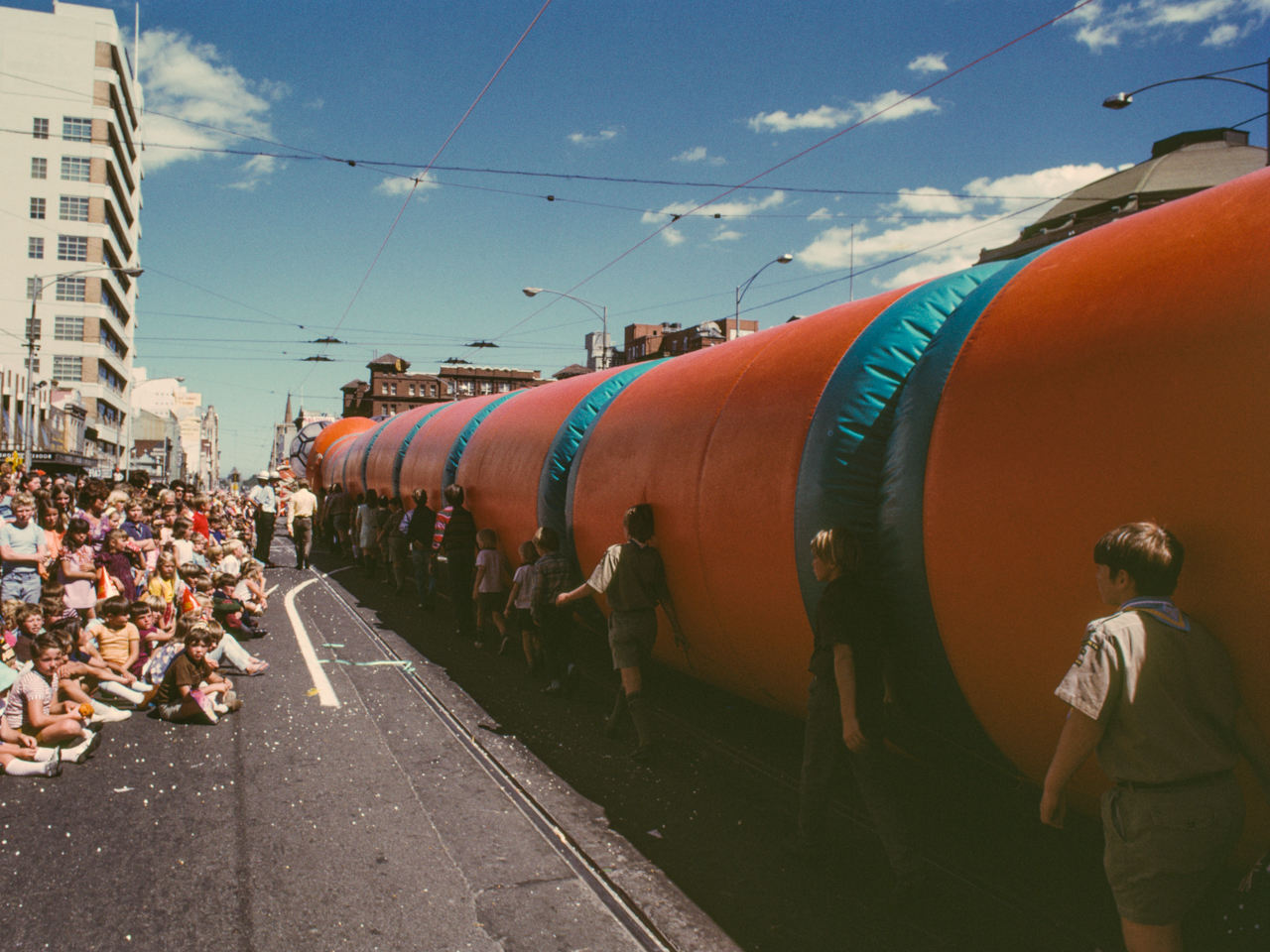 Made for the Moomba Festival in Melbourne, the Centipede was a large air-inflated parade creature whose ‘hundred feet’ were provided by people from the general public who spontaneously joined to carry it through the streets.
