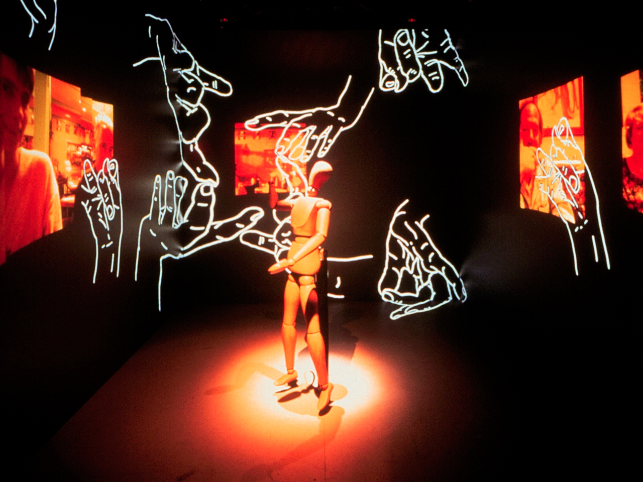 ASSOCIATION. Four spirals of line-drawn hands morph through a variety of gestures. A panoramic photographic background shows a group of convivial people (many of whom are media art personalities) sitting around a table in a bar. Moving the puppet’s hands and arms affects the movements of these animated hands. Folding the puppet’s arms inwards causes the hands and panoramic images to converge into the CAVE space. Putting the puppet’s hands together causes a virtual hand-shadow play to be performed on the CAVE's rear wall.
