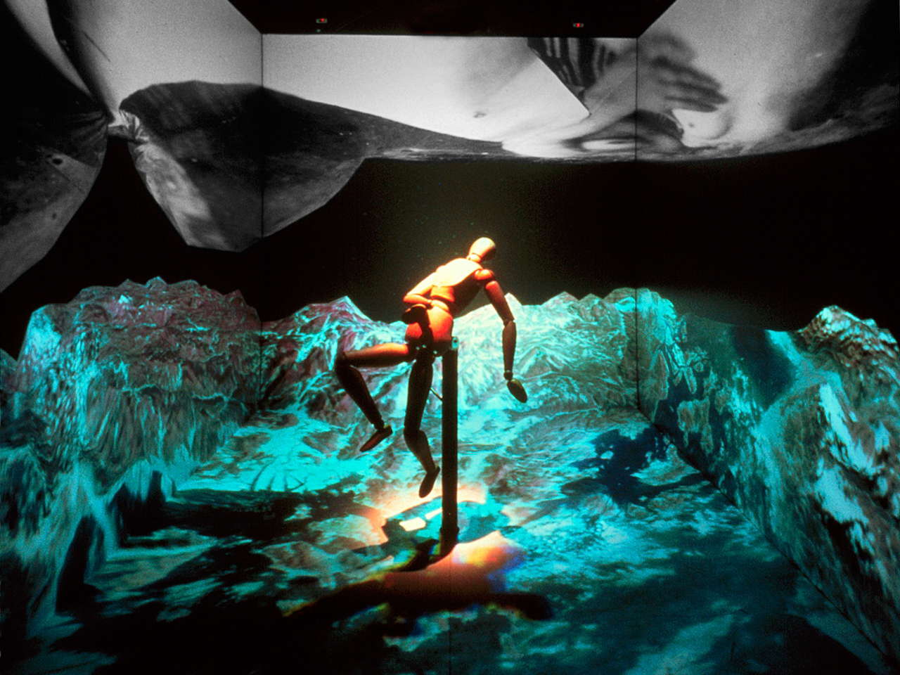 PERSON. In a fiery space evocative of an alchemical inferno, a mirror image of the wooden puppet stands in the CAVE, casting shadows on the walls and floor. The reflected and shadow puppets echo movements of the real puppet. Seven objects dance in the fire without ever being consumed—a candelabra, a compass, a camera, a gyroscope, a child’s wagon, a blue sponge and a cube on whose sides there are six symbolic representations of the human figure. When the puppet’s limbs are folded all these objects (except the sponge) converge with the mirrored puppet's body.