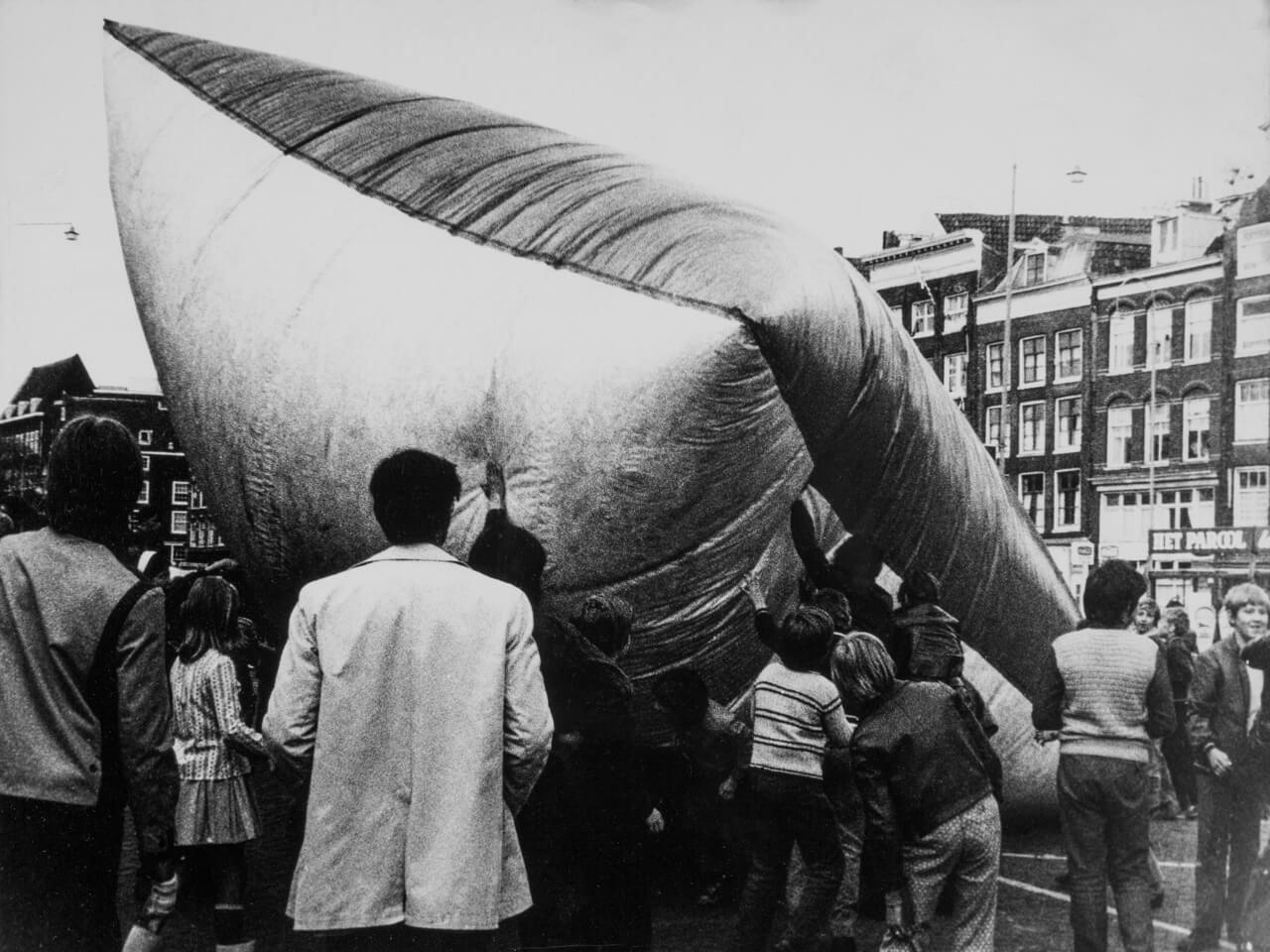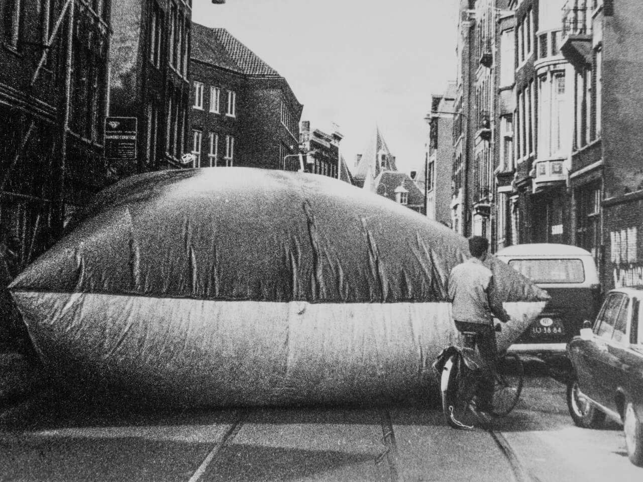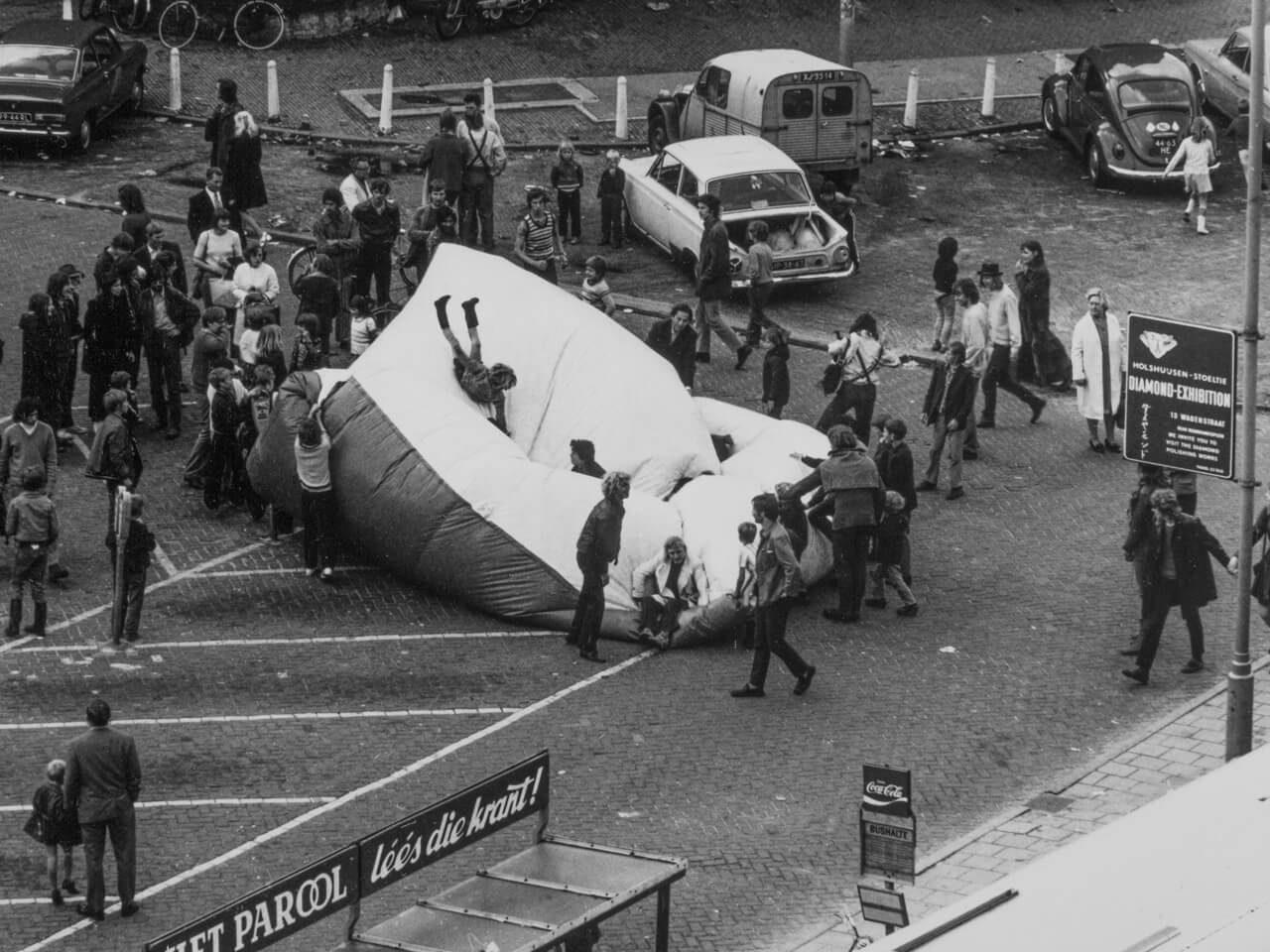 Placed on a street in Amsterdam, where it blocked traffic, this gigantic, soft pillow provided both a ludic spectacle and inducement for the onlookers to participate. Such an artwork is not so much about the making of an object, but more the shaping of an event and a public ‘situation of opportunity’.