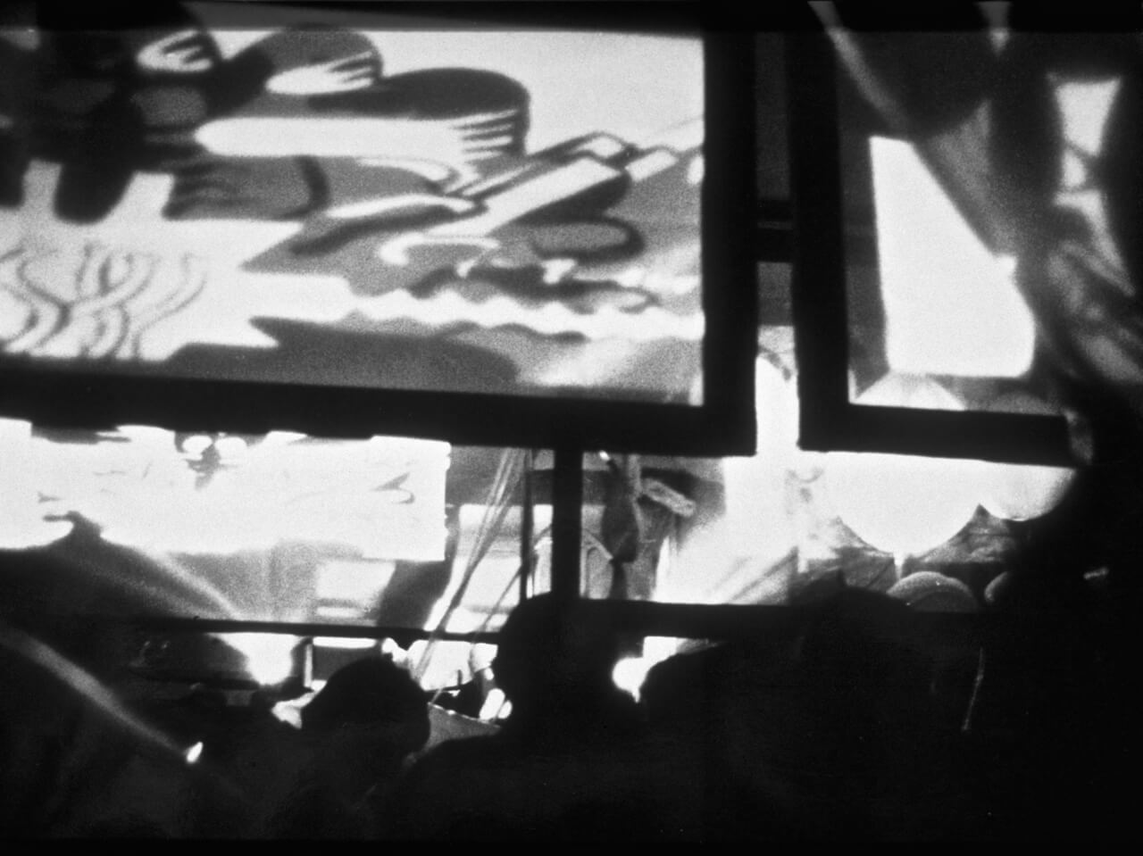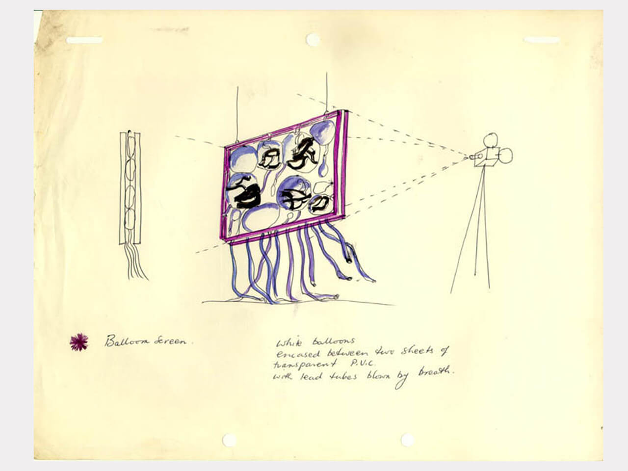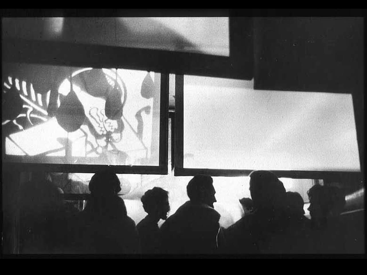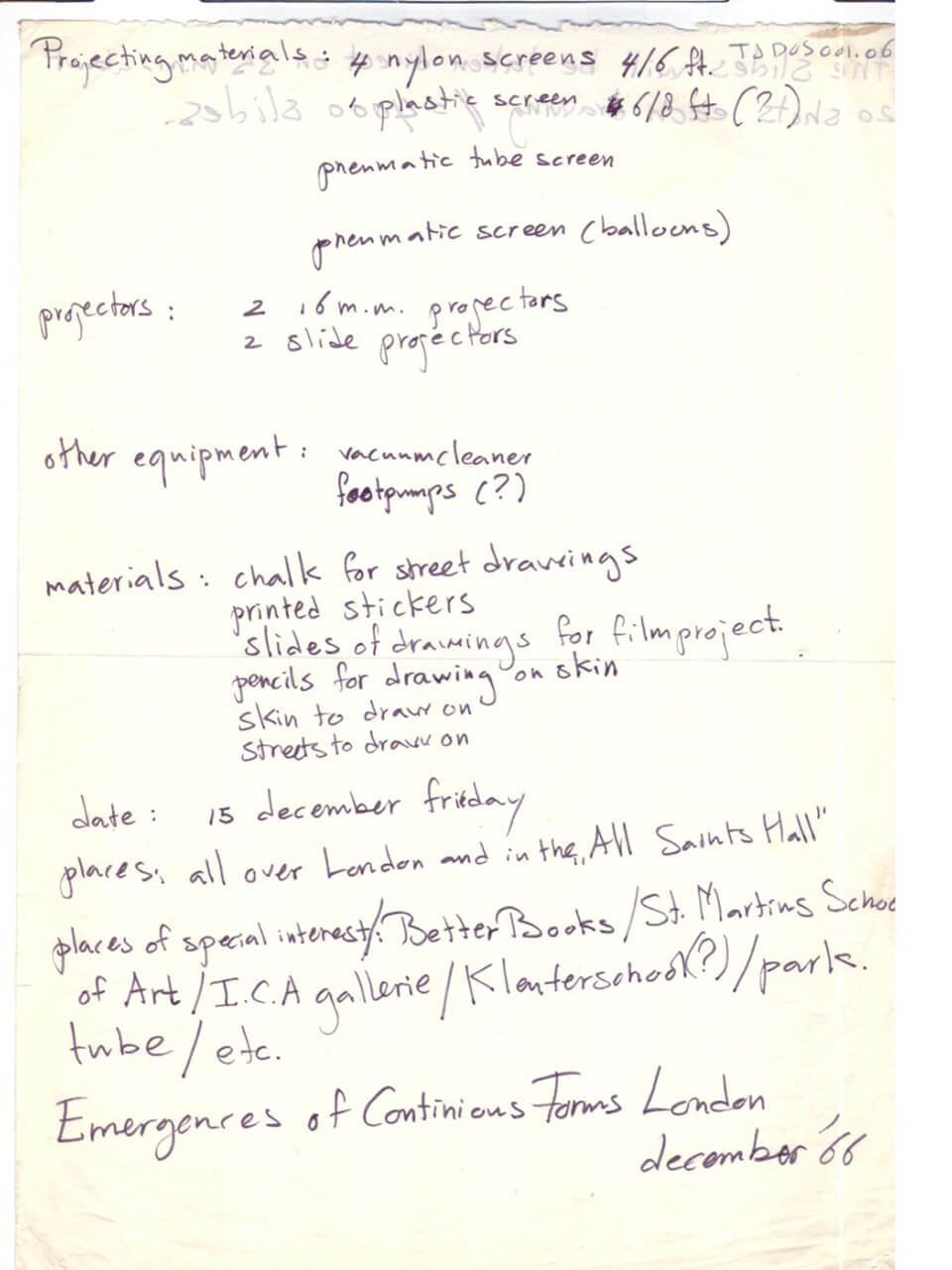 Emergences of Continuous Forms was one of a series of performances and installations in this period which explored various methods of extending the cinematic image into the space of the viewers and of provoking the viewer's physical interactivity in the cinematic experience. Initiated by Tjebbe van Tijen and located in the basement ‘happenings’ space of Better Books in London, multiple semi-transparent projection screens hung in two rows over the length of the gallery, thereby producing a spatial materialization of the film images. One of these screens had a transparent compartment filled with white balloons—tubes coming out of the screen allowed the public to inflate these balloons and so control the shape of the projection surface. Smoke was also used to create another three-dimensional continuum for the projected image as it passed from one screen surface to another. Tjebbe van Tijen extended this installation out into the streets of London with a procession of costumed performers and musicians.