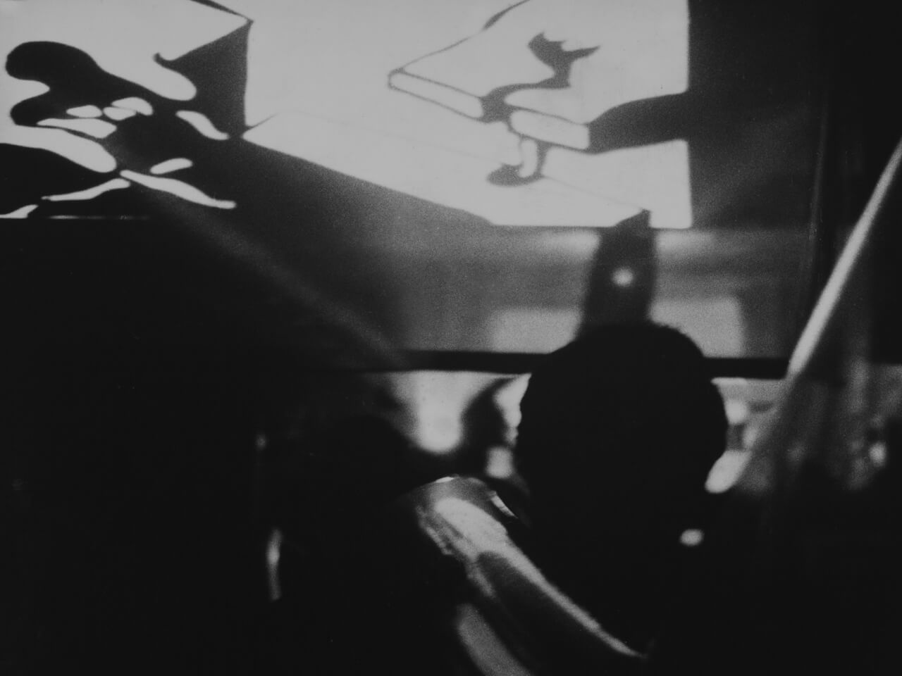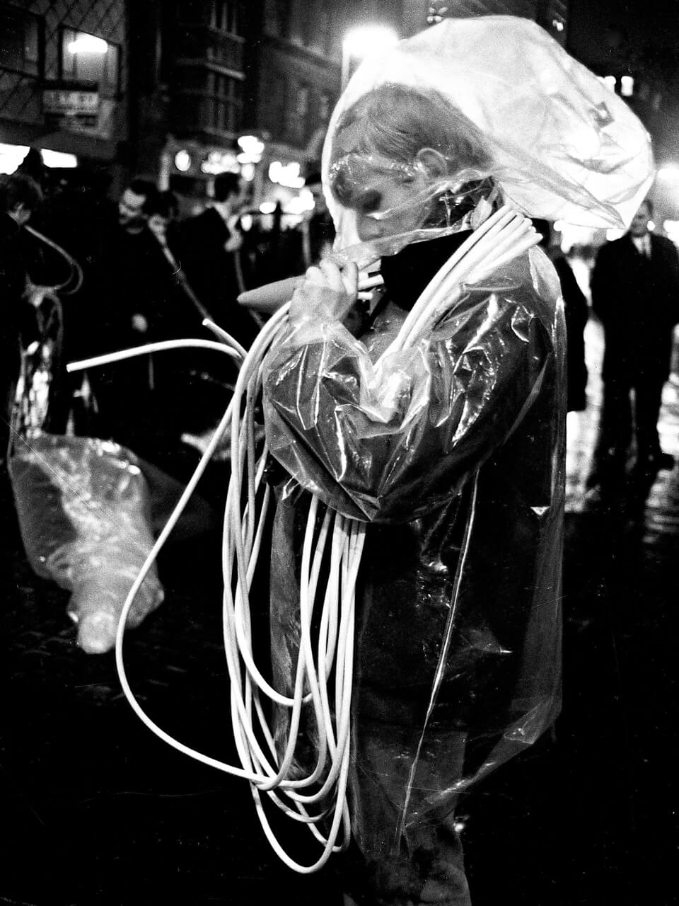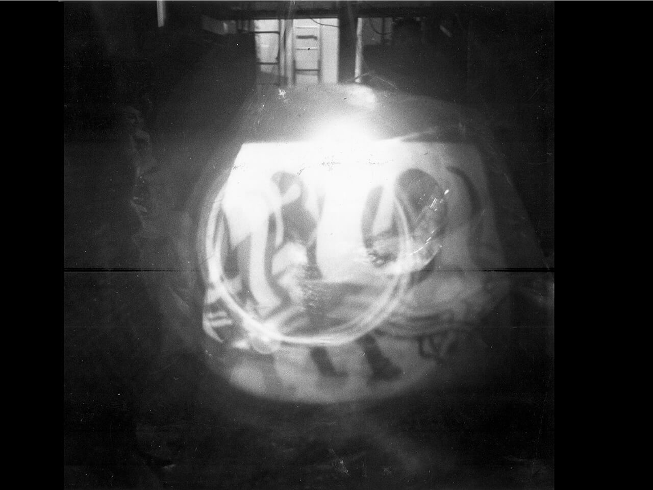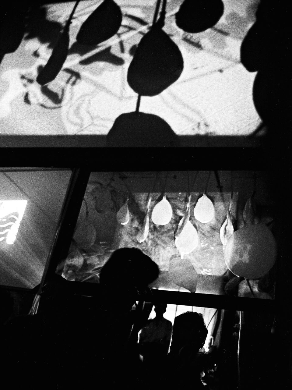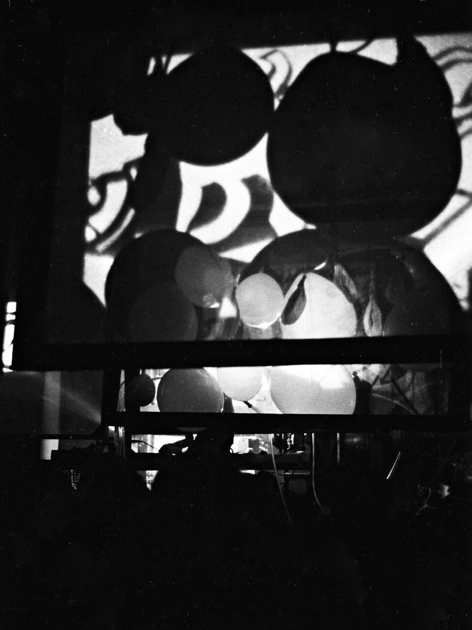 Emergences of Continuous Forms was one of a series of performances and installations in this period which explored various methods of extending the cinematic image into the space of the viewers and of provoking the viewer's physical interactivity in the cinematic experience. Initiated by Tjebbe van Tijen and located in the basement ‘happenings’ space of Better Books in London, multiple semi-transparent projection screens hung in two rows over the length of the gallery, thereby producing a spatial materialization of the film images. One of these screens had a transparent compartment filled with white balloons—tubes coming out of the screen allowed the public to inflate these balloons and so control the shape of the projection surface. Smoke was also used to create another three-dimensional continuum for the projected image as it passed from one screen surface to another. Tjebbe van Tijen extended this installation out into the streets of London with a procession of costumed performers and musicians.