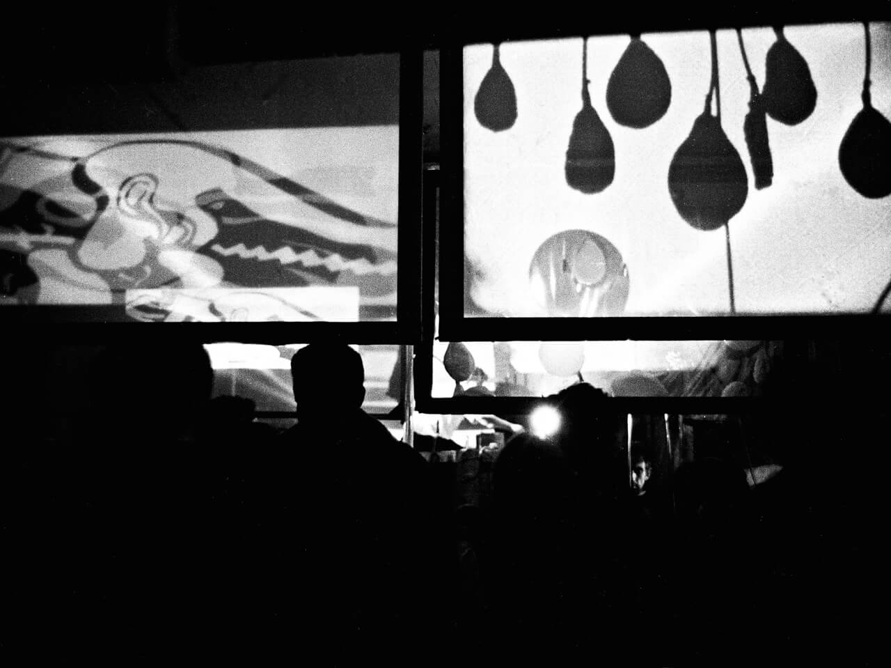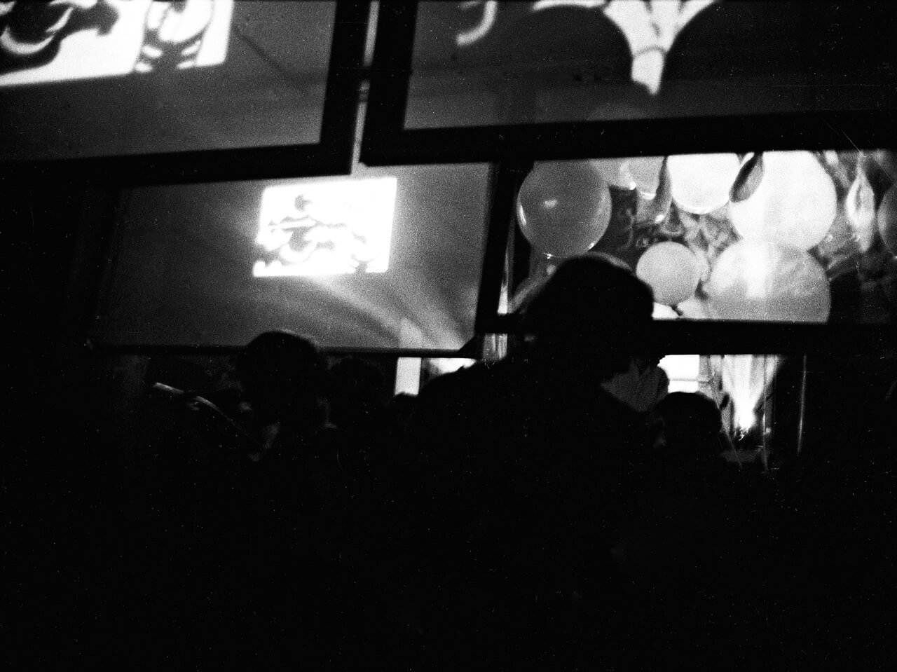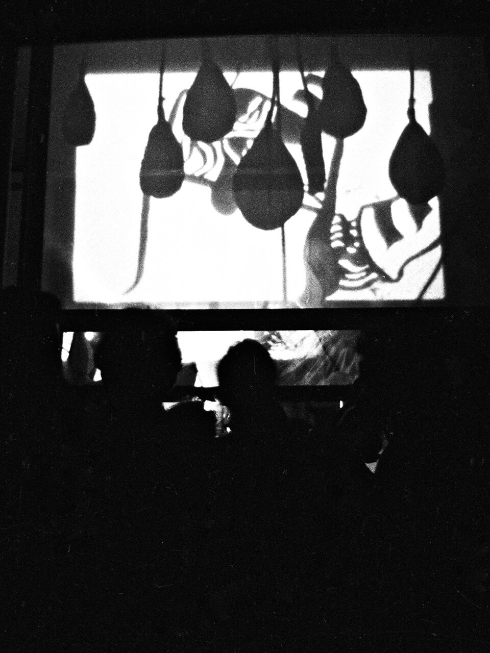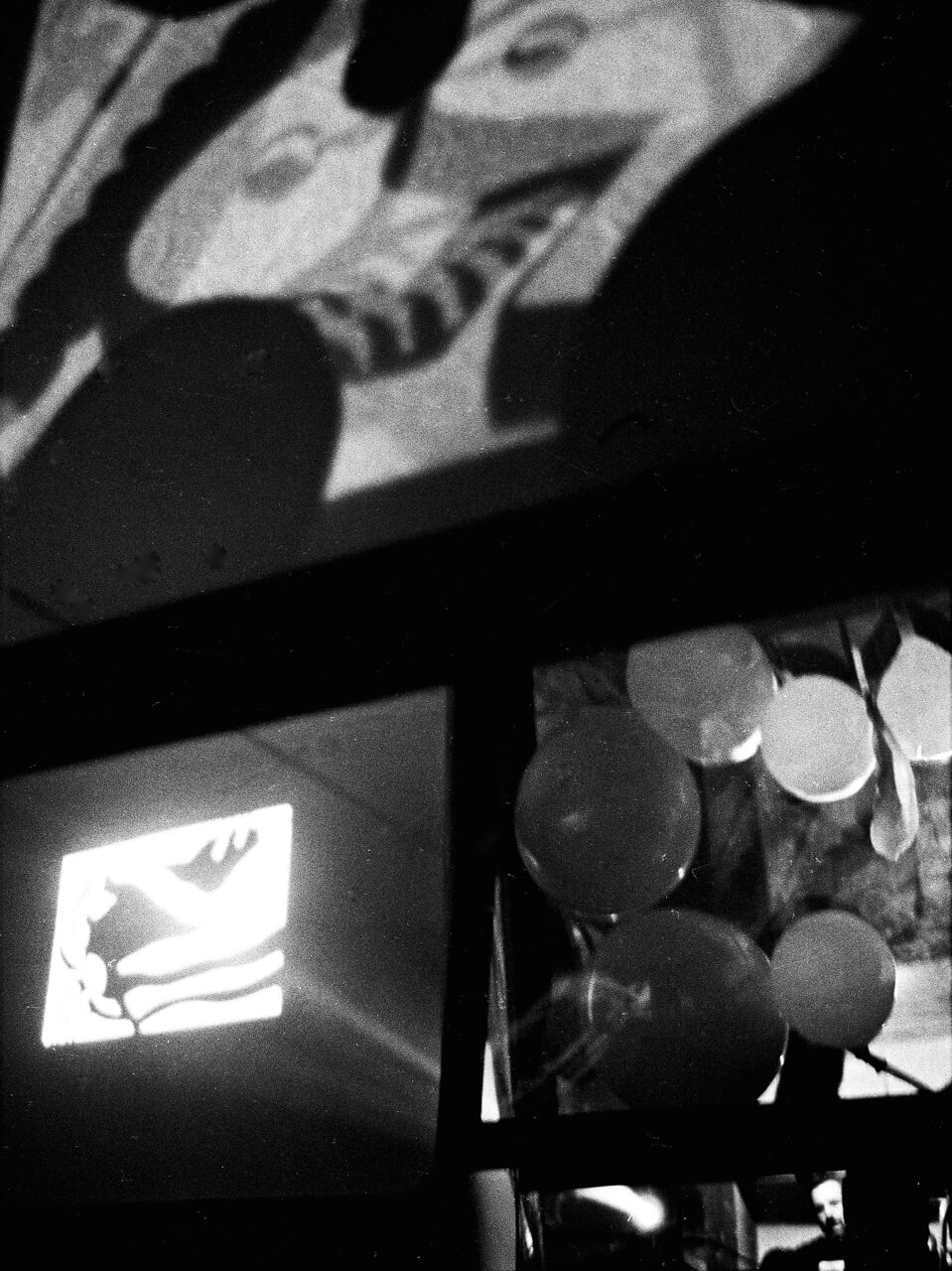 Emergences of Continuous Forms was one of a series of performances and installations in this period which explored various methods of extending the cinematic image into the space of the viewers and of provoking the viewer's physical interactivity in the cinematic experience. Initiated by Tjebbe van Tijen and located in the basement ‘happenings’ space of Better Books in London, multiple semi-transparent projection screens hung in two rows over the length of the gallery, thereby producing a spatial materialization of the film images. One of these screens had a transparent compartment filled with white balloons—tubes coming out of the screen allowed the public to inflate these balloons and so control the shape of the projection surface. Smoke was also used to create another three-dimensional continuum for the projected image as it passed from one screen surface to another. Tjebbe van Tijen extended this installation out into the streets of London with a procession of costumed performers and musicians.