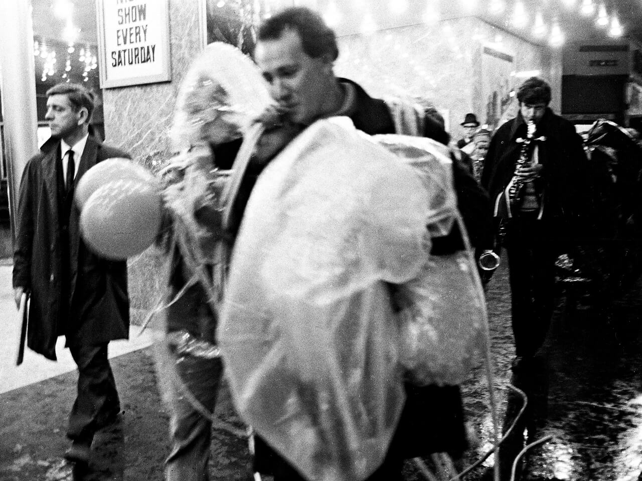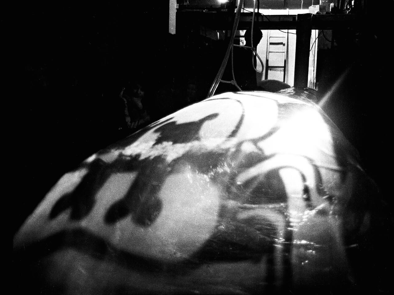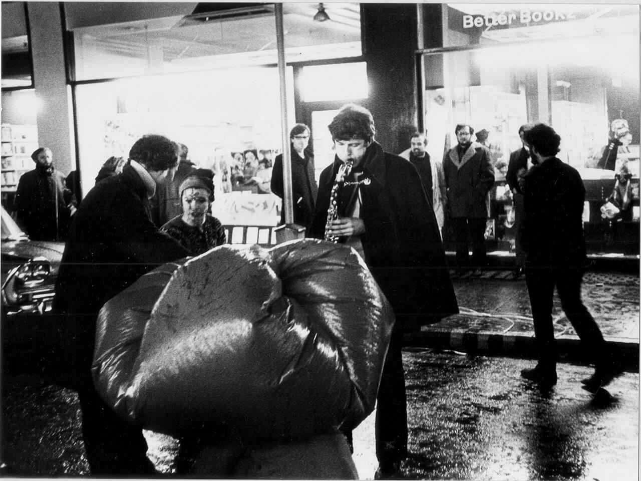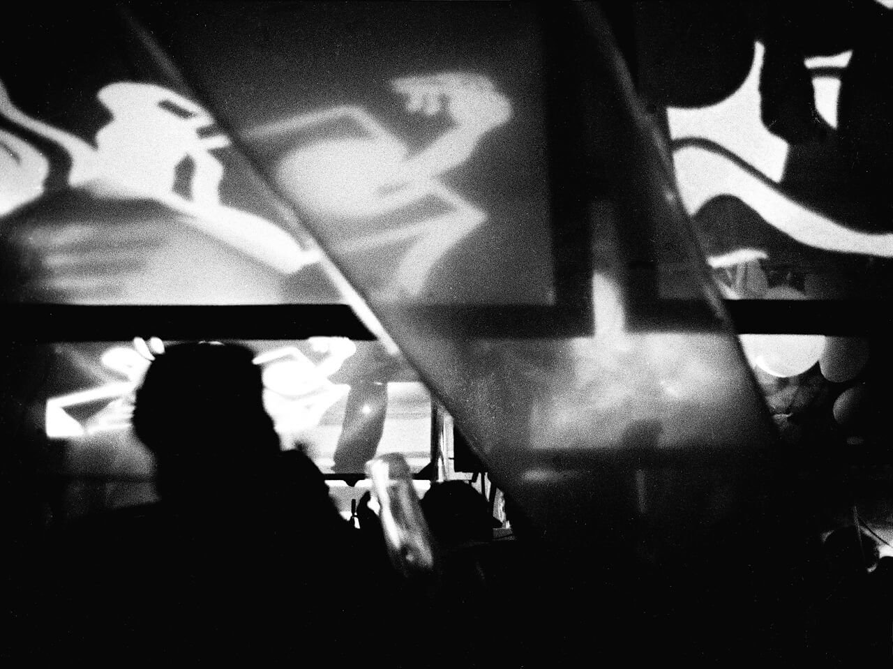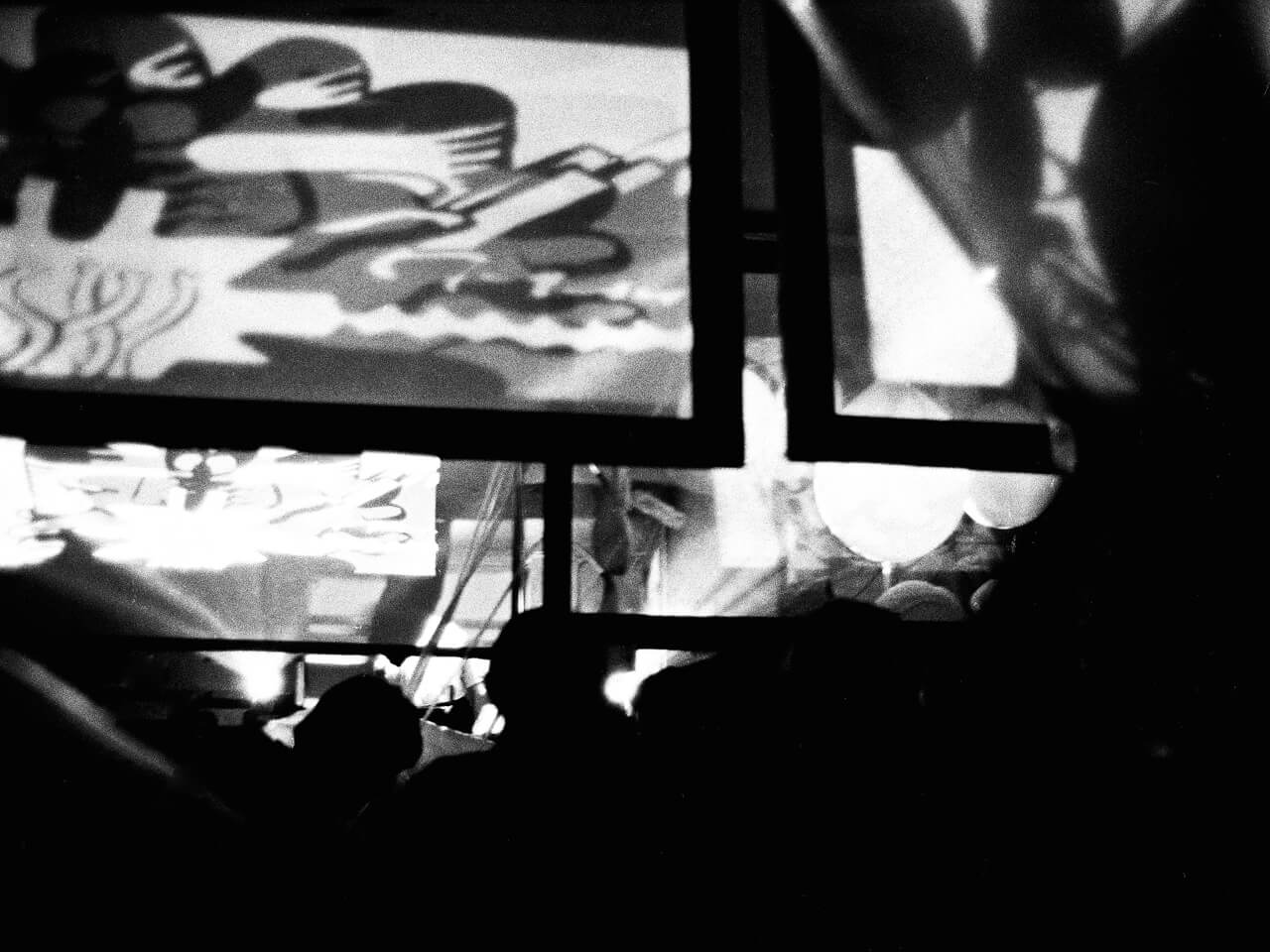 Emergences of Continuous Forms was one of a series of performances and installations in this period which explored various methods of extending the cinematic image into the space of the viewers and of provoking the viewer's physical interactivity in the cinematic experience. Initiated by Tjebbe van Tijen and located in the basement ‘happenings’ space of Better Books in London, multiple semi-transparent projection screens hung in two rows over the length of the gallery, thereby producing a spatial materialization of the film images. One of these screens had a transparent compartment filled with white balloons—tubes coming out of the screen allowed the public to inflate these balloons and so control the shape of the projection surface. Smoke was also used to create another three-dimensional continuum for the projected image as it passed from one screen surface to another. Tjebbe van Tijen extended this installation out into the streets of London with a procession of costumed performers and musicians.