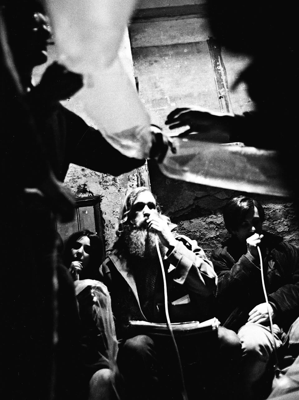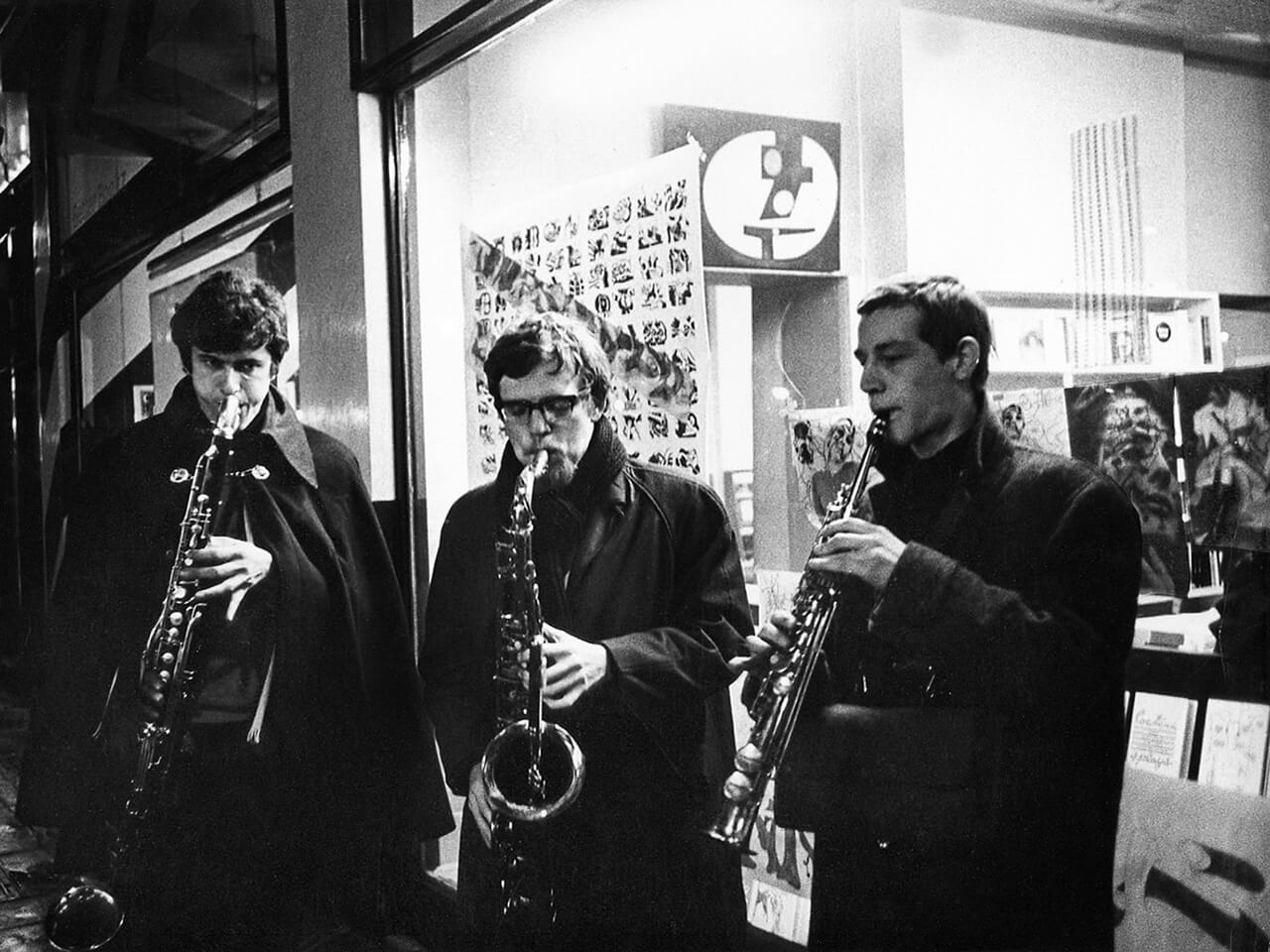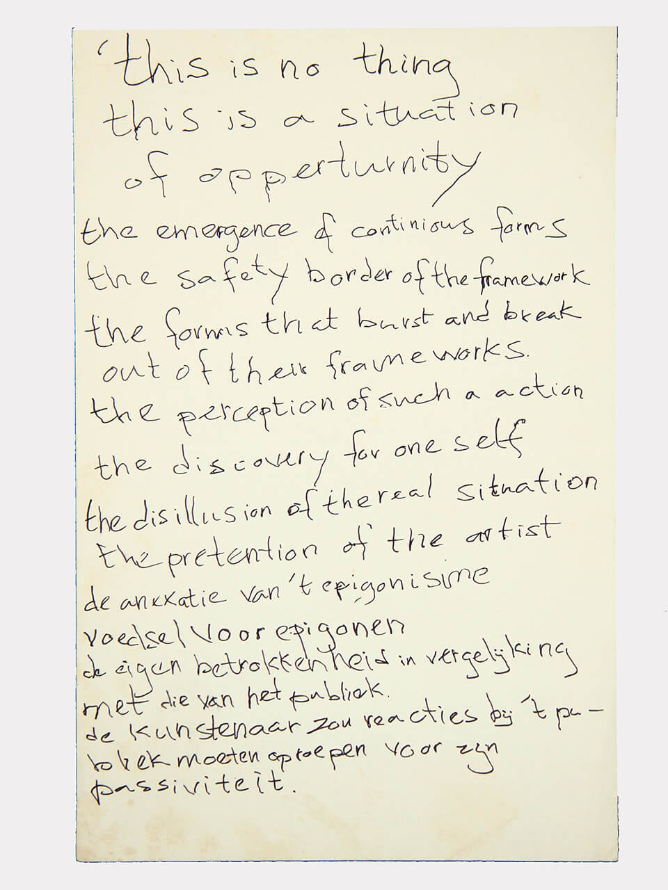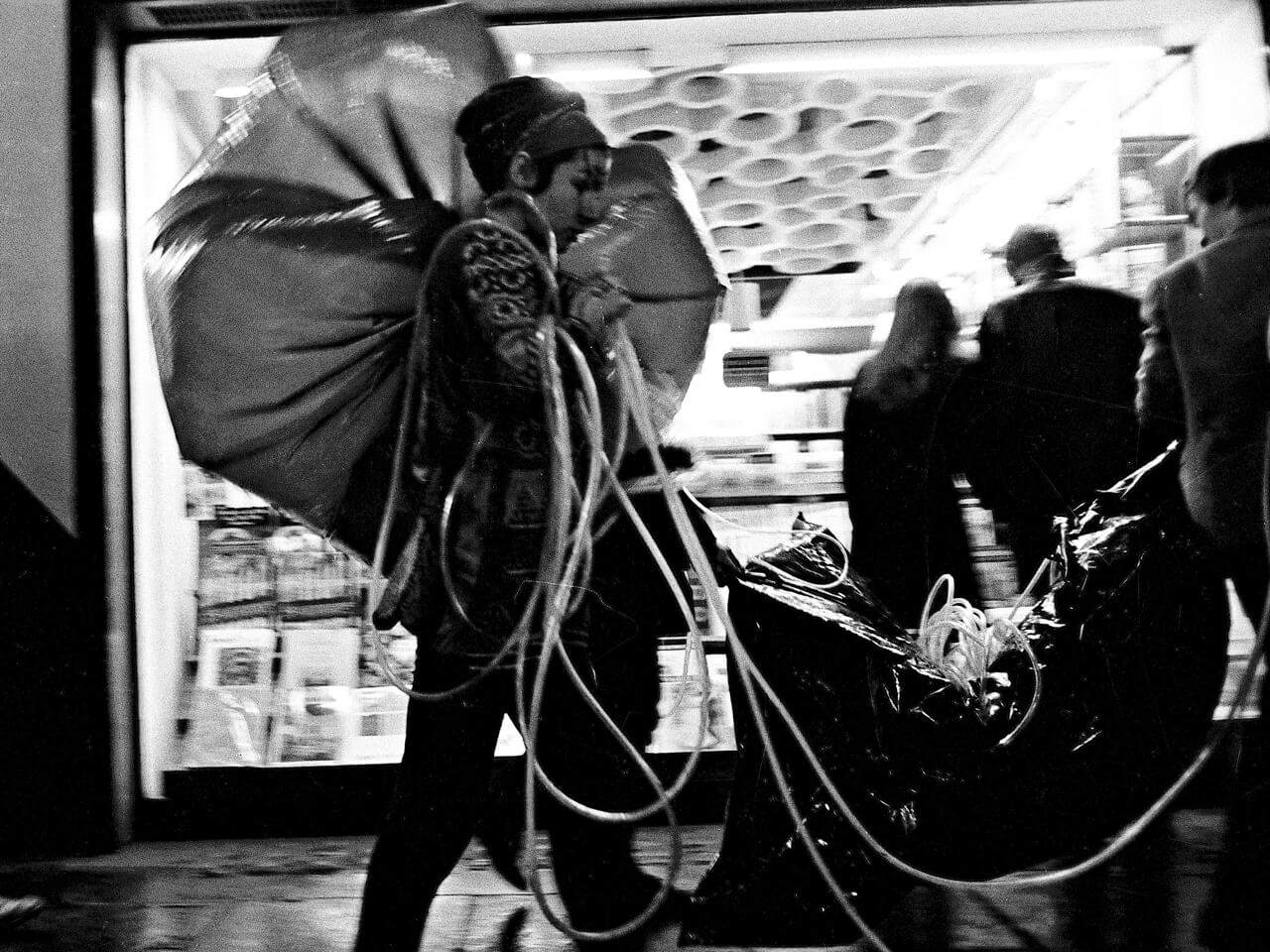Emergences of Continuous Forms was one of a series of performances and installations in this period which explored various methods of extending the cinematic image into the space of the viewers and of provoking the viewer's physical interactivity in the cinematic experience. Initiated by Tjebbe van Tijen and located in the basement ‘happenings’ space of Better Books in London, multiple semi-transparent projection screens hung in two rows over the length of the gallery, thereby producing a spatial materialization of the film images. One of these screens had a transparent compartment filled with white balloons—tubes coming out of the screen allowed the public to inflate these balloons and so control the shape of the projection surface. Smoke was also used to create another three-dimensional continuum for the projected image as it passed from one screen surface to another. Tjebbe van Tijen extended this installation out into the streets of London with a procession of costumed performers and musicians.