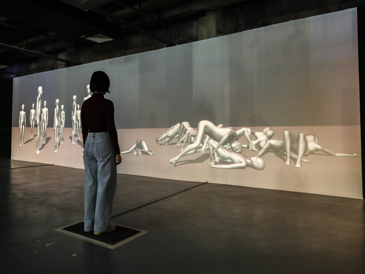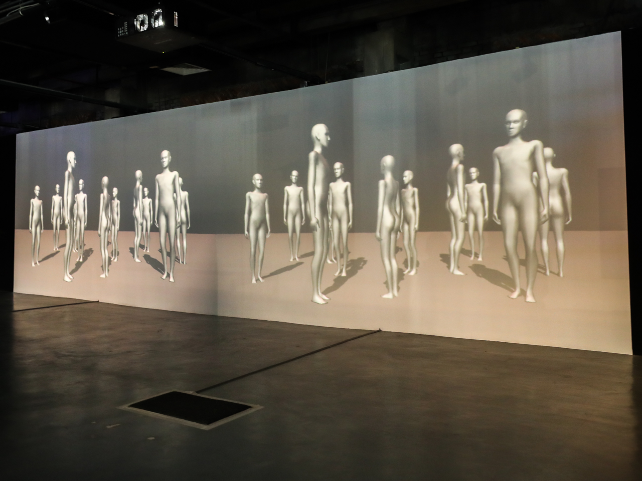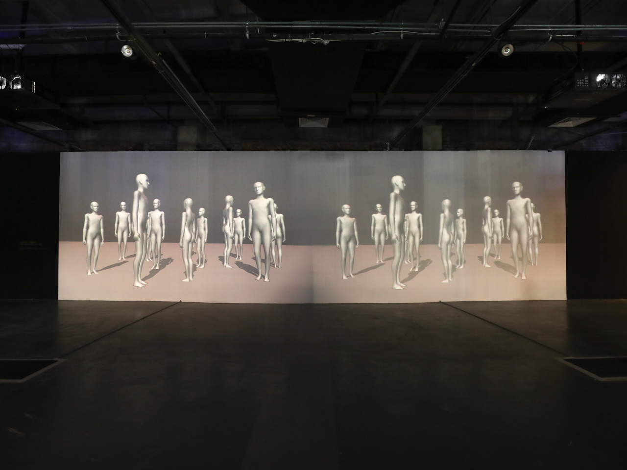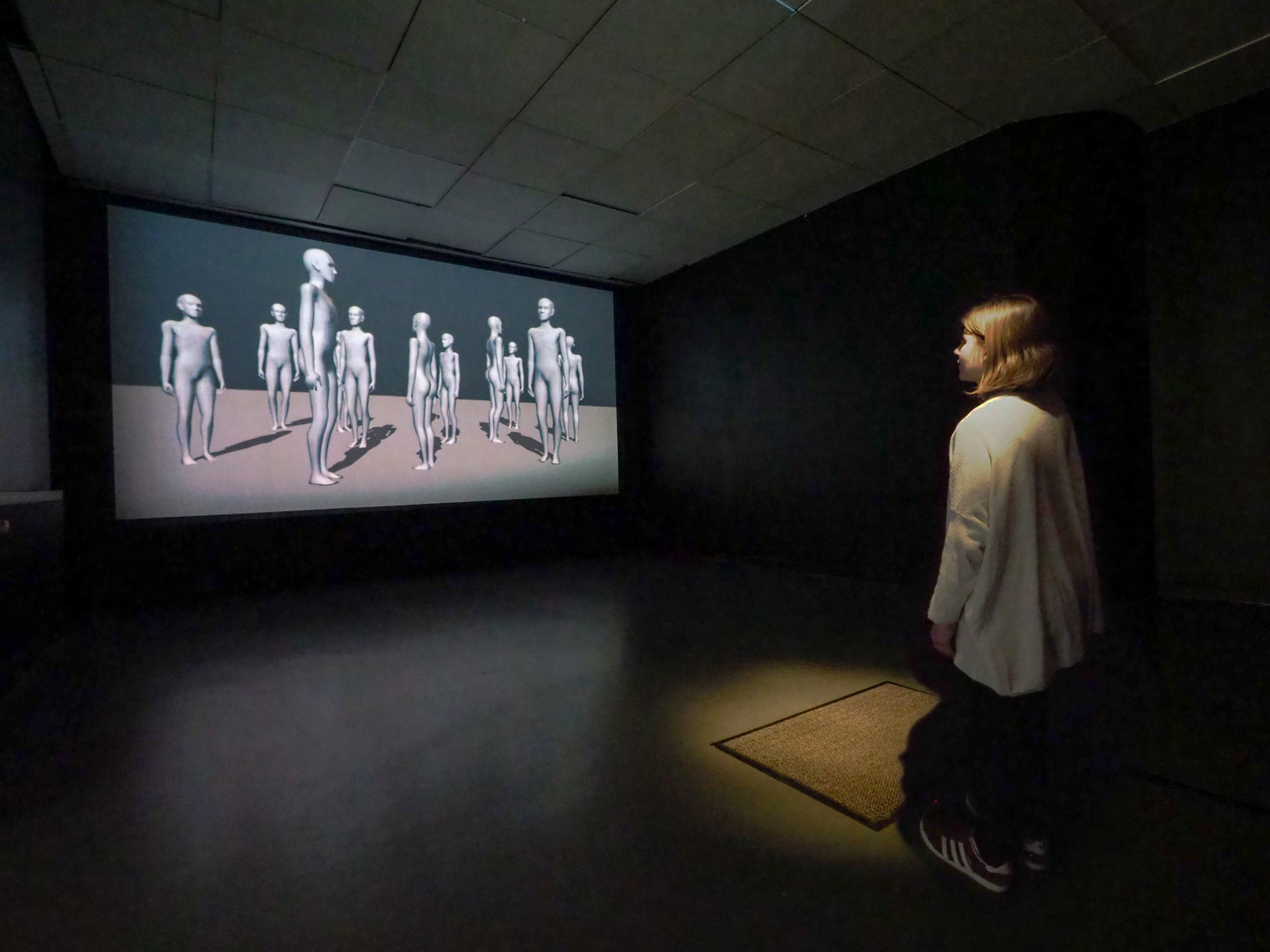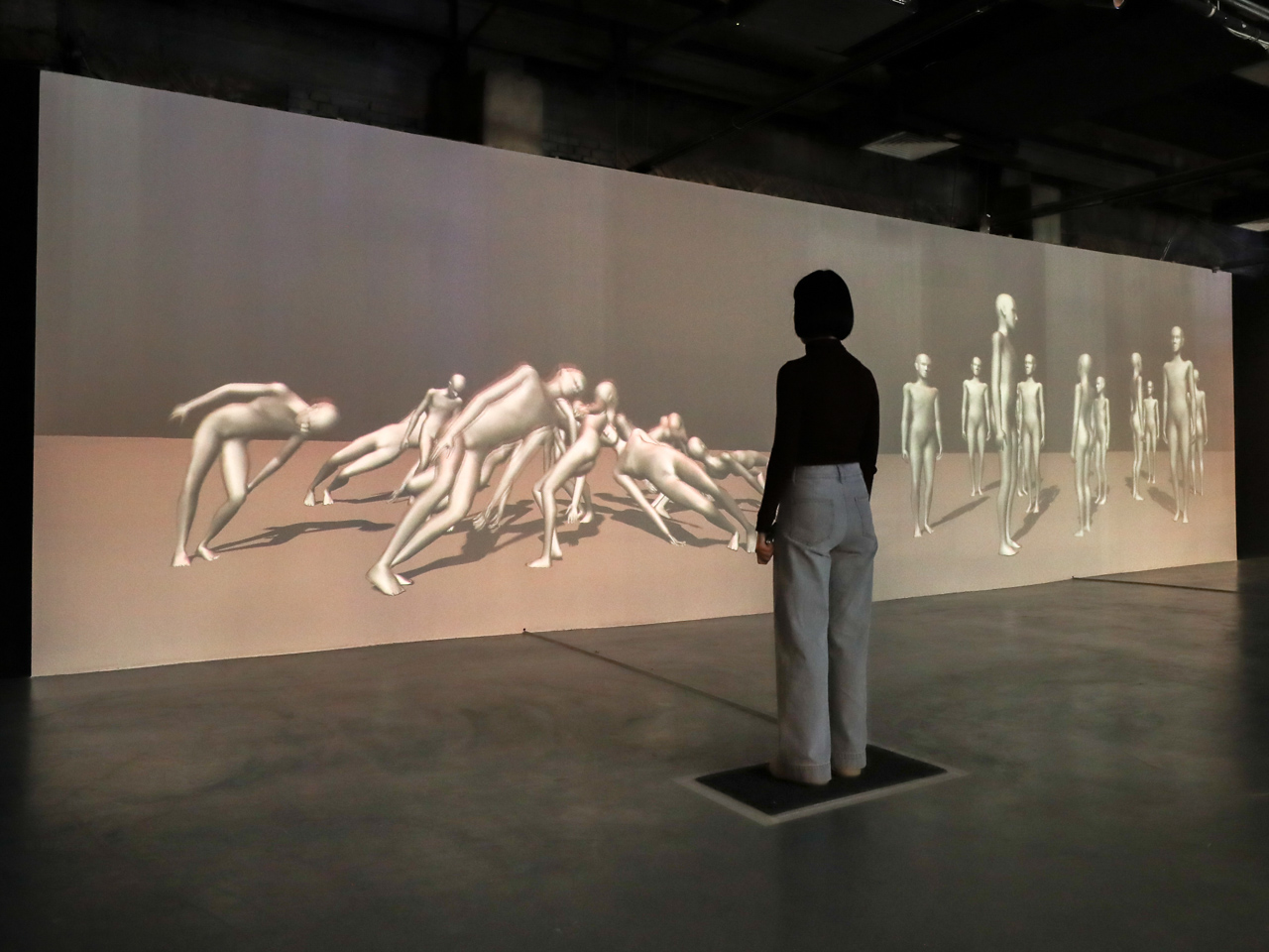 In the Fall Again, Fall Better #2 installation, a group of computer-modelled human figures is presented on the screen and, when stepping on the pressure-sensitive floor mat, the viewer causes these people to fall and then stand up again.