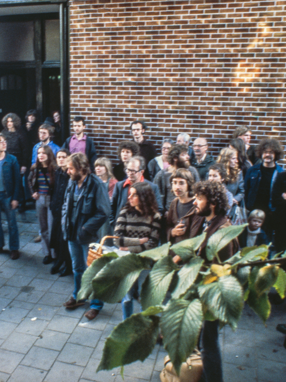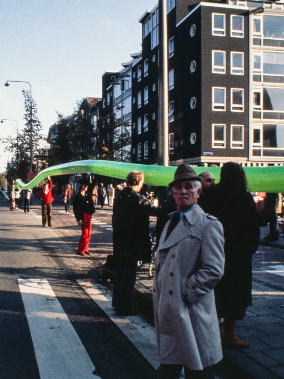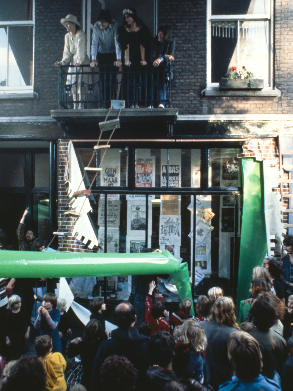 The Fort van Sjakoo is an international activist bookshop operated by a collective of volunteers, located in the centre of Amsterdam. A ‘disillusionary’ event was orchestrated for its opening. Initially the entire windowed facade of the shop was covered with brick-printed wallpaper, behind which some hundred metres of green polythene tubing was hidden. The performance began with a ‘Romeo’ climbing up to the shop’s first-floor balcony to meet his ‘Juliet.’ Then the hidden tubing was inflated, bursting through the brick-wall veneer and out onto the pavement, into the hands of the onlookers, who then dragged it down the street. In this way the shop became physically and narratively ‘opened’ to the public, with a performance that also referenced the then-recent times of squatter confrontations and building demolitions in this neighborhood.