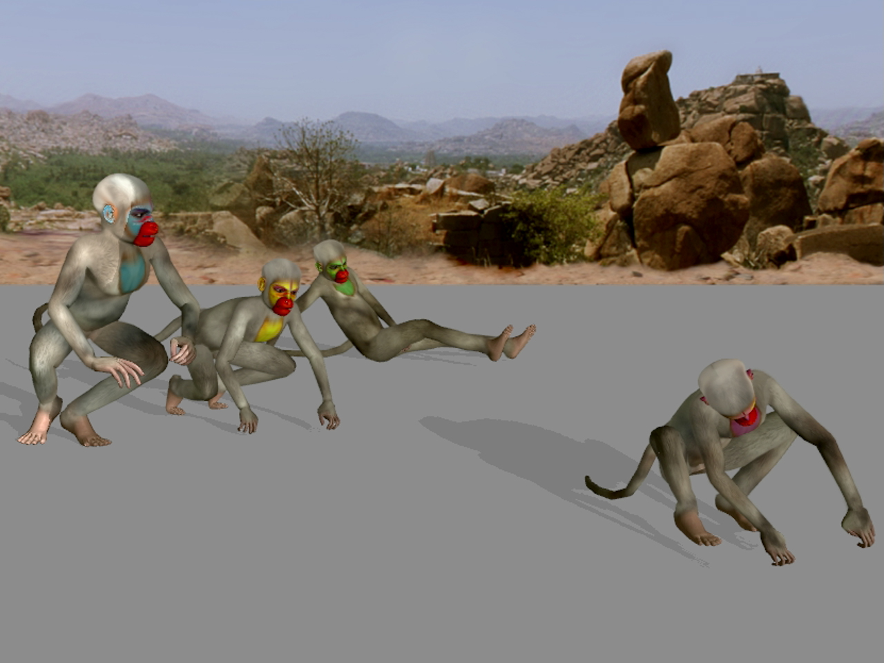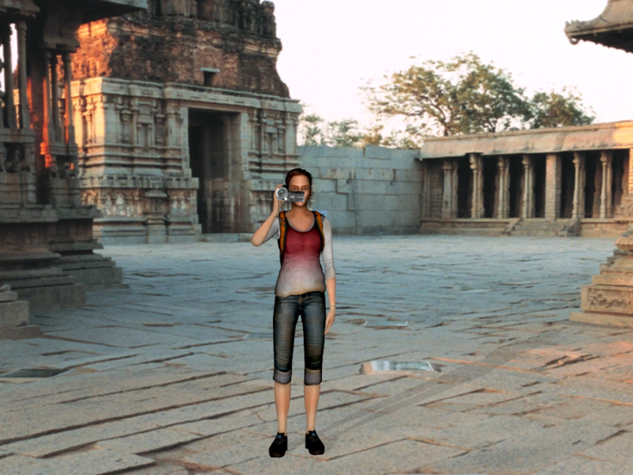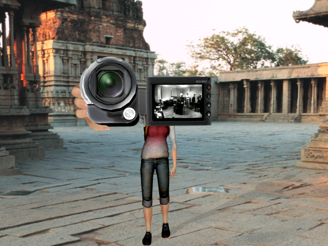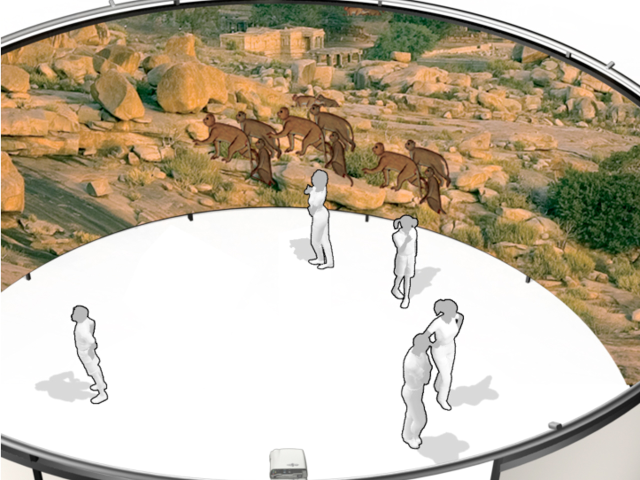 This experimental research results in two scenarios that exploit camera tracking as an interface. In scenario one, animated monkeys representing Hampi’s identification as Kishkindha from the Ramayana virtually inhabit the various panoramas. The monkeys ‘sense’ (i.e., ‘look’ into) the real world using information from the camera tracking system, ‘seeing’ the participants inside AVIE and responding according to certain dynamics exhibited by the visiting crowd. For example, when people are close to the screen the monkeys may move to the other side. The monkeys approach motionless people by exhibiting curiosity. The framework advanced in the research addresses a need articulated by virtual heritage scholars to treat the heritage object as an evolving and symmetrical experience in which the story told is not pre-rehearsed but emerges as an interactive dialogue between participants and machine agents. Combined with symbolic logic and cognitive programming of computer-generated characters, Hampi-Live co-evolves the narrative engagement between the intangible heritage of ‘place’ and the participants.
