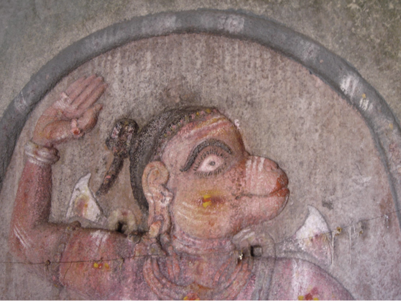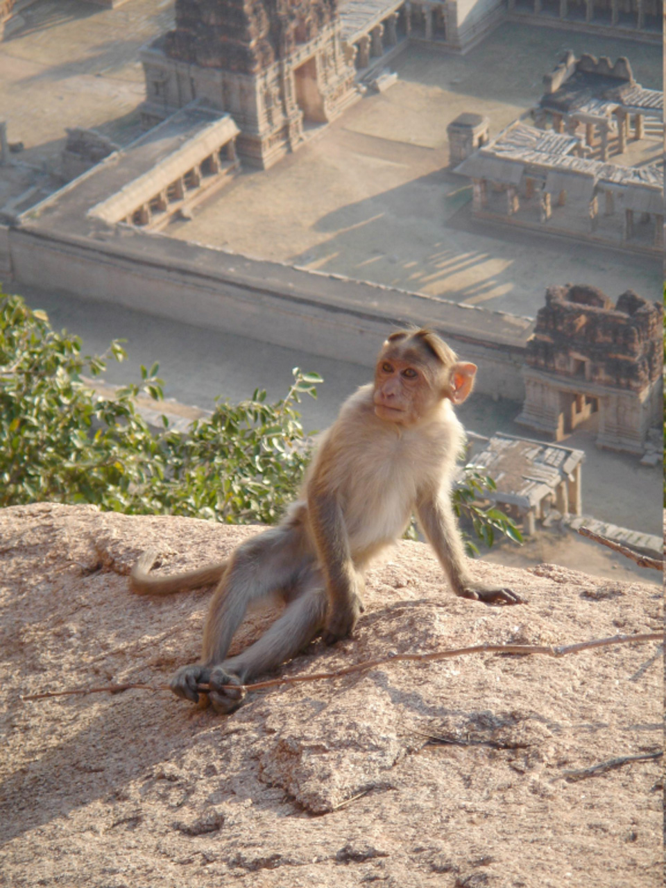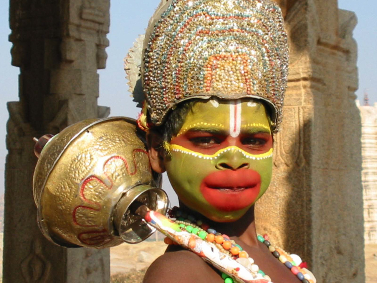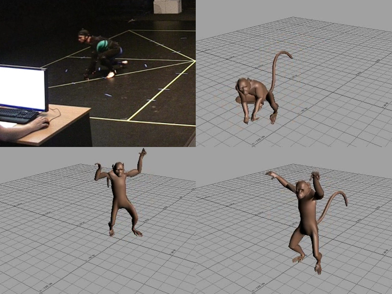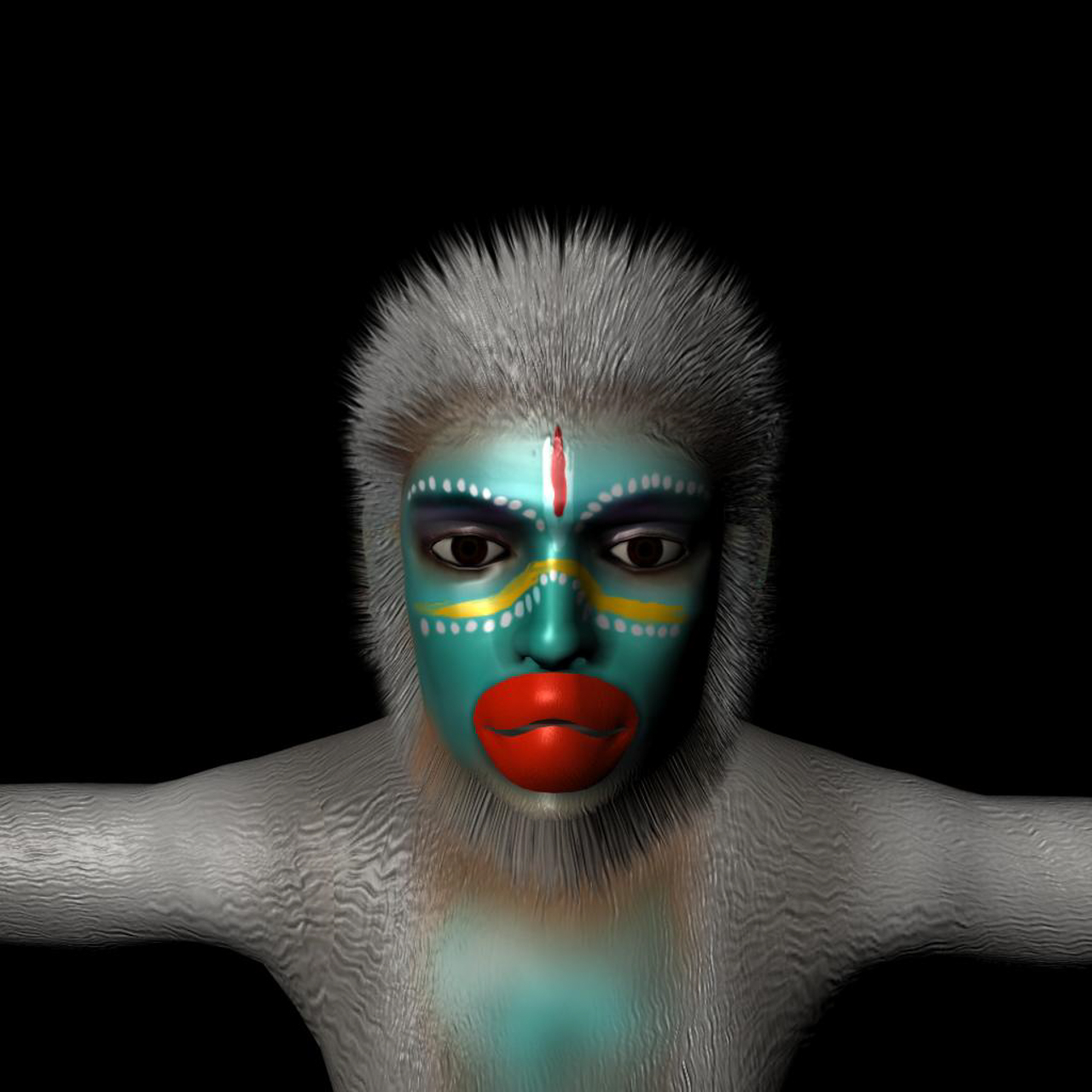 This experimental research results in two scenarios that exploit camera tracking as an interface. In scenario one, animated monkeys representing Hampi’s identification as Kishkindha from the Ramayana virtually inhabit the various panoramas. The monkeys ‘sense’ (i.e., ‘look’ into) the real world using information from the camera tracking system, ‘seeing’ the participants inside AVIE and responding according to certain dynamics exhibited by the visiting crowd. For example, when people are close to the screen the monkeys may move to the other side. The monkeys approach motionless people by exhibiting curiosity. The framework advanced in the research addresses a need articulated by virtual heritage scholars to treat the heritage object as an evolving and symmetrical experience in which the story told is not pre-rehearsed but emerges as an interactive dialogue between participants and machine agents. Combined with symbolic logic and cognitive programming of computer-generated characters, Hampi-Live co-evolves the narrative engagement between the intangible heritage of ‘place’ and the participants.