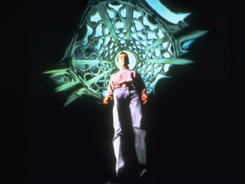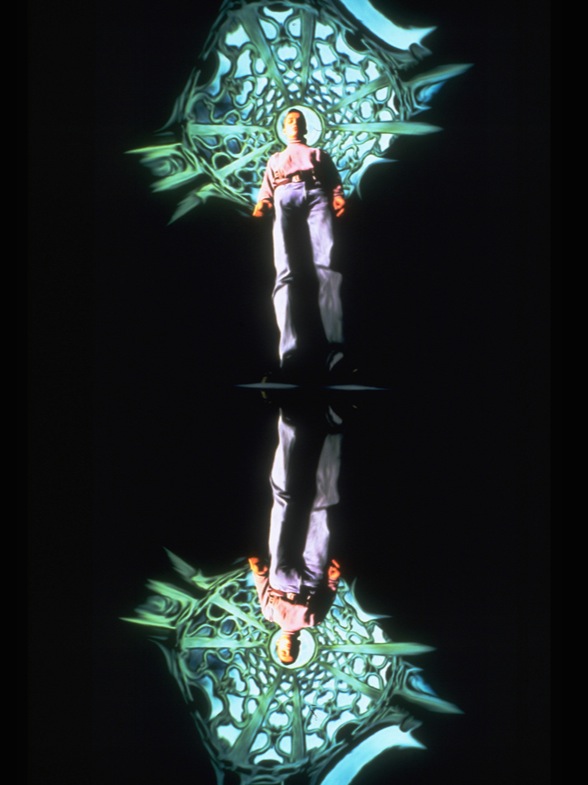 Heaven’s Gate is a video installation that was first shown in the stairwell of Felix Meritis in Amsterdam. In other venues the work usually occupies a specially constructed tall, dark room. The video image is projected high up onto a 3m x 4m screen on the ceiling, while on the floor beneath there is a same-sized mirror that can be walked on. Visitors standing on this mirror see both their own reflection and the reflection of the projected image on the ceiling. The otherwise total darkness of the space creates for the viewer a state of visual suspension between the two image planes. It is an immersive and embodied construct that draws the spectator into the virtual space of the imagery and dissolves the boundary between material and immaterial identity.