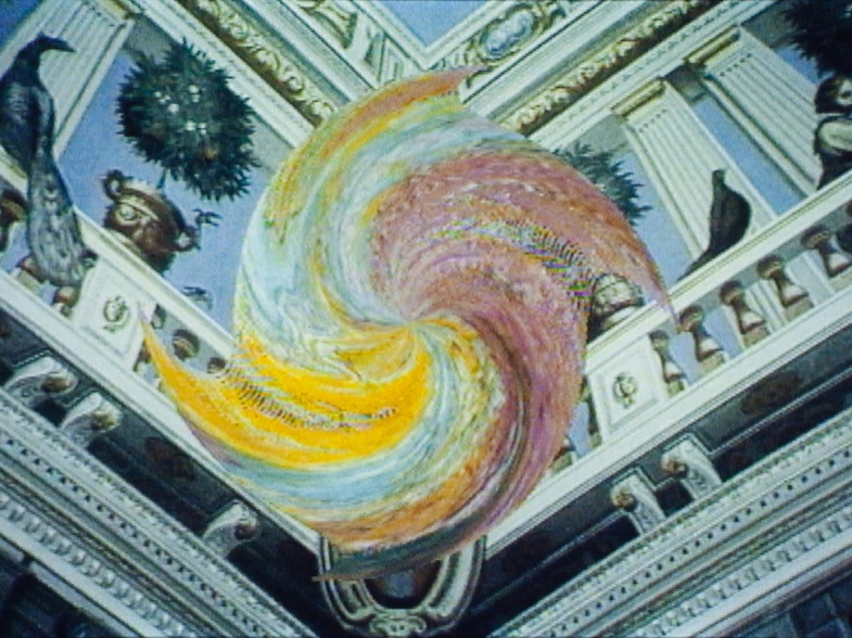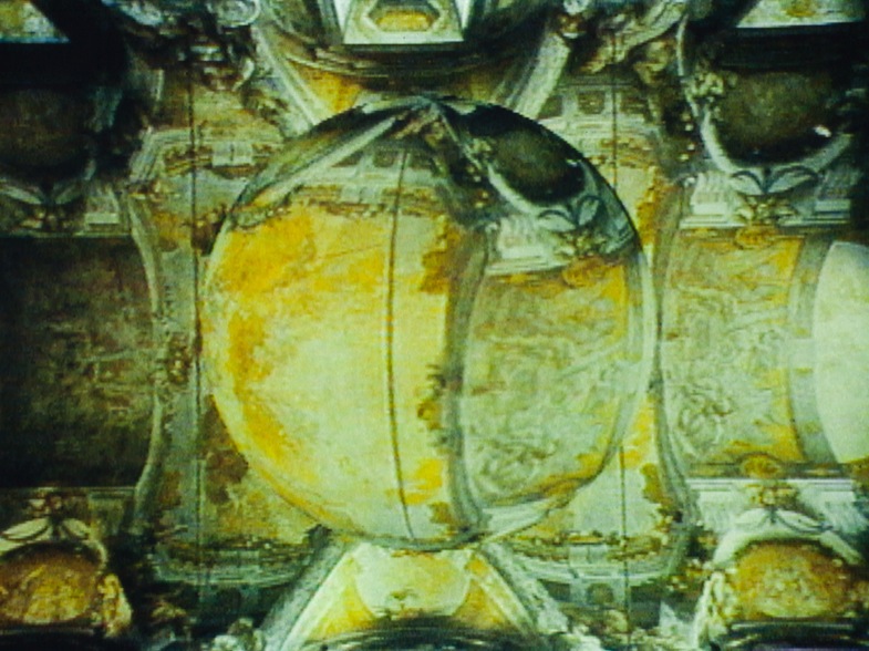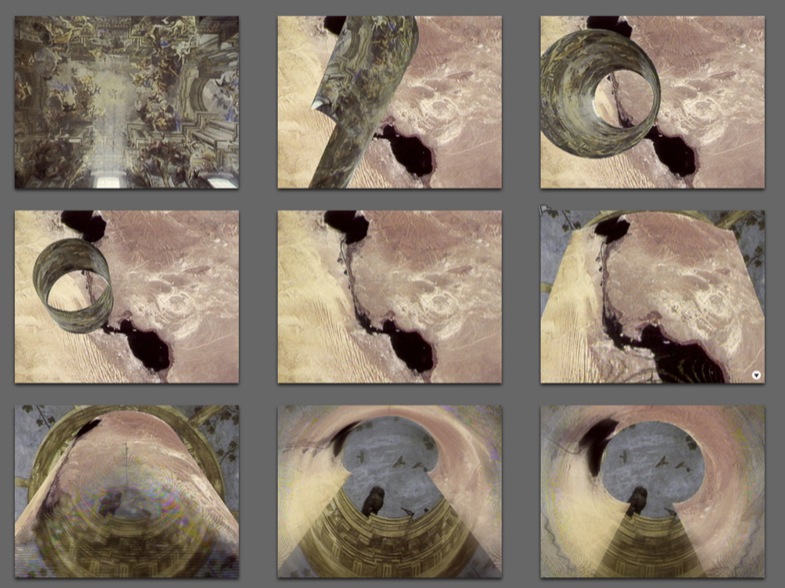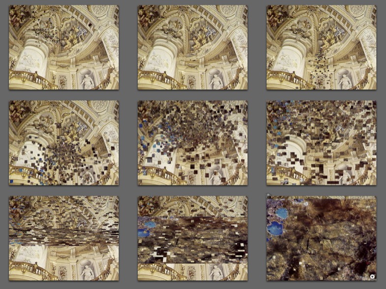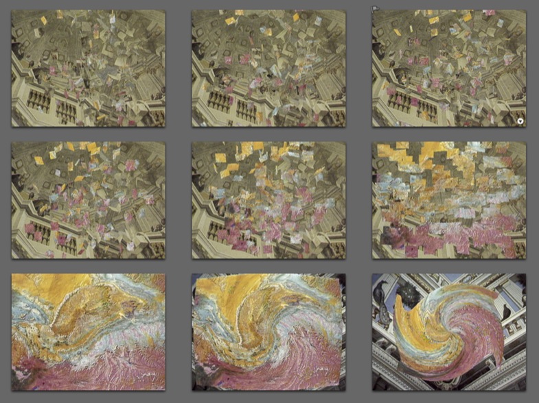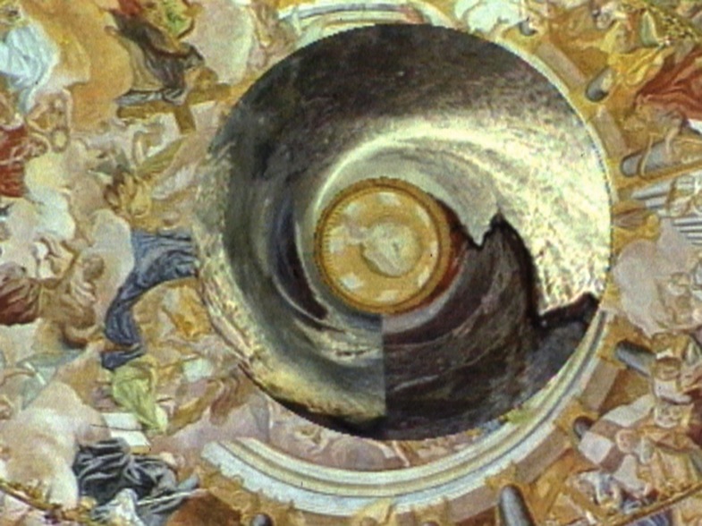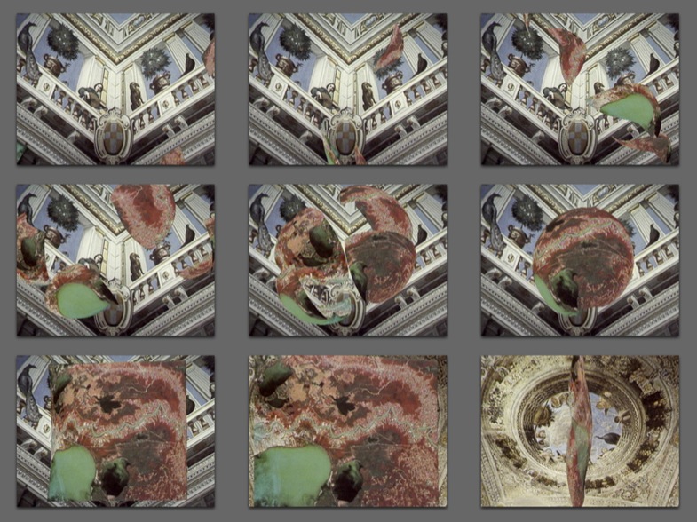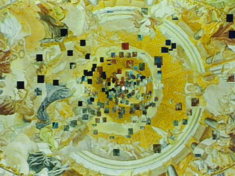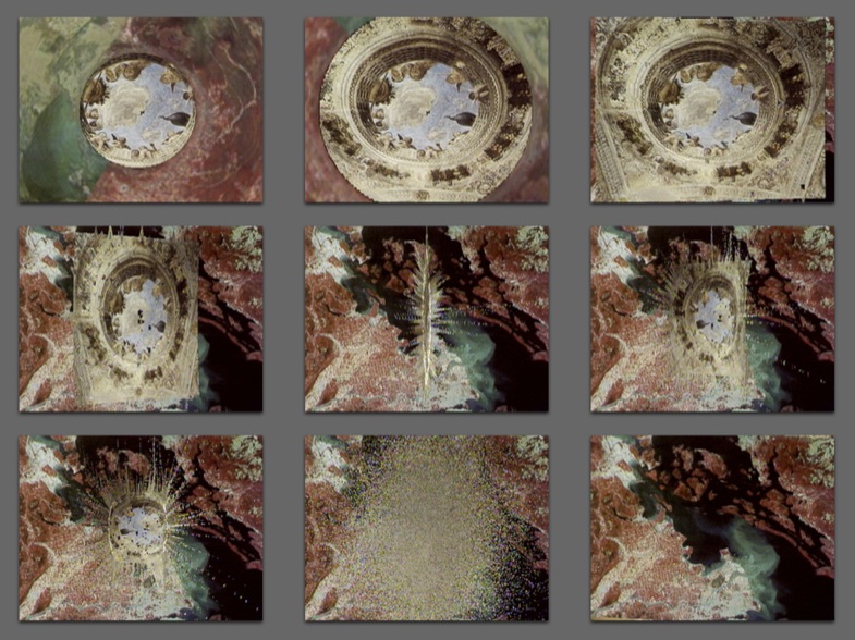 The conceptual and iconographic references in this work are largely derived from Baroque ceiling paintings and aerial/satellite pictures of the surface of Earth. These images alternate in a computer-processed morphology that deconstructs and manipulates the constituent pixels of the original images and then anamorphically reconfigures them in a virtual three-dimensional space. This digital tromp l'oeil interpolates the awesome contemporary view of planet Earth photographed from space with the ecstatic Baroque gaze up to the heavens, a dizzying axis between an above and below that has lost its qualitative distinction. Other iconographic references in this work further elucidate this vertiginous contraposition, such as the Futurists’ aerial point of view and the spatial apotheoses of El Greco and Piero Manzoni.