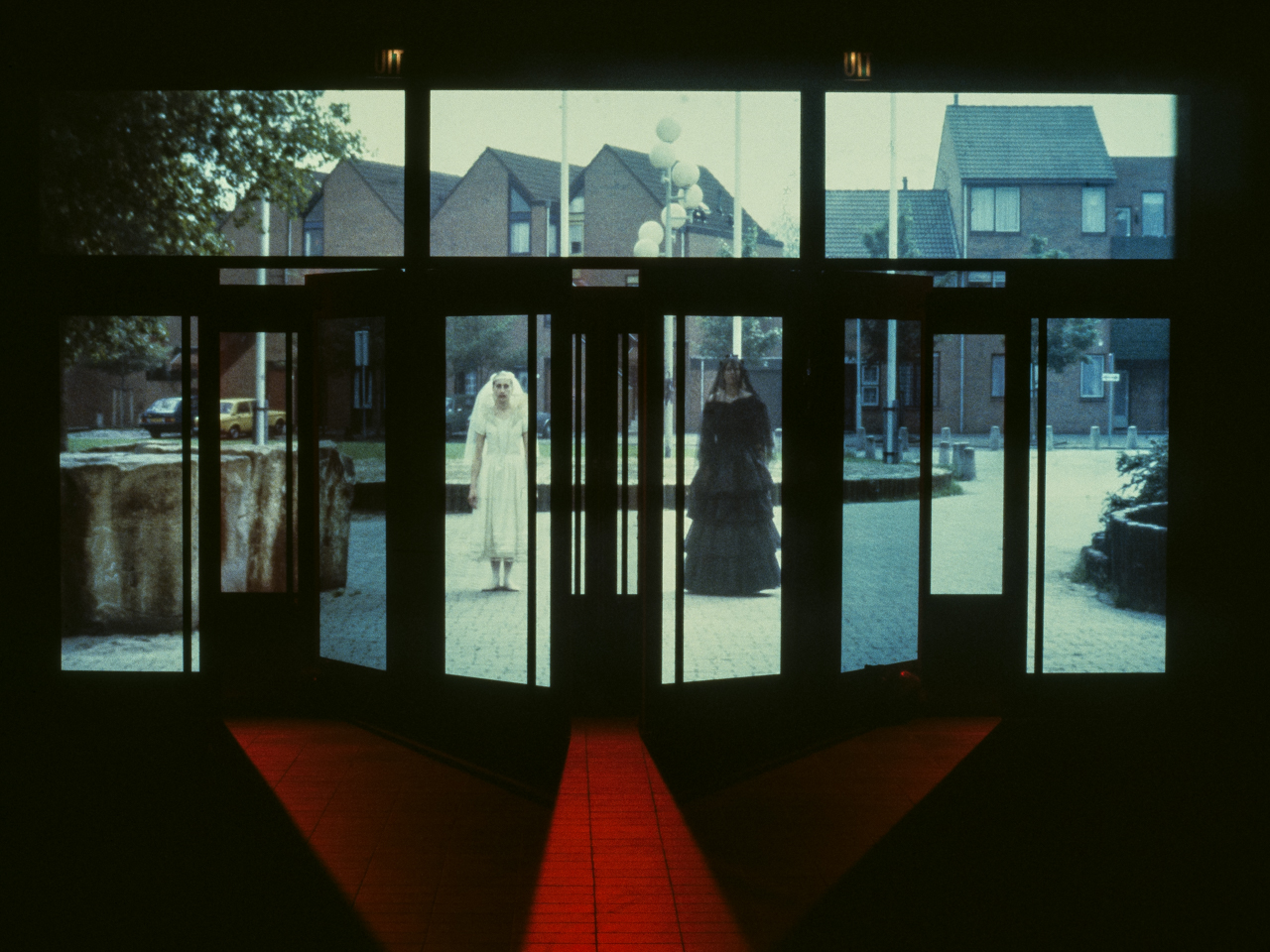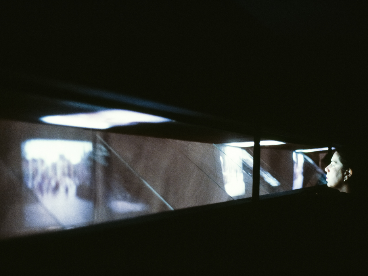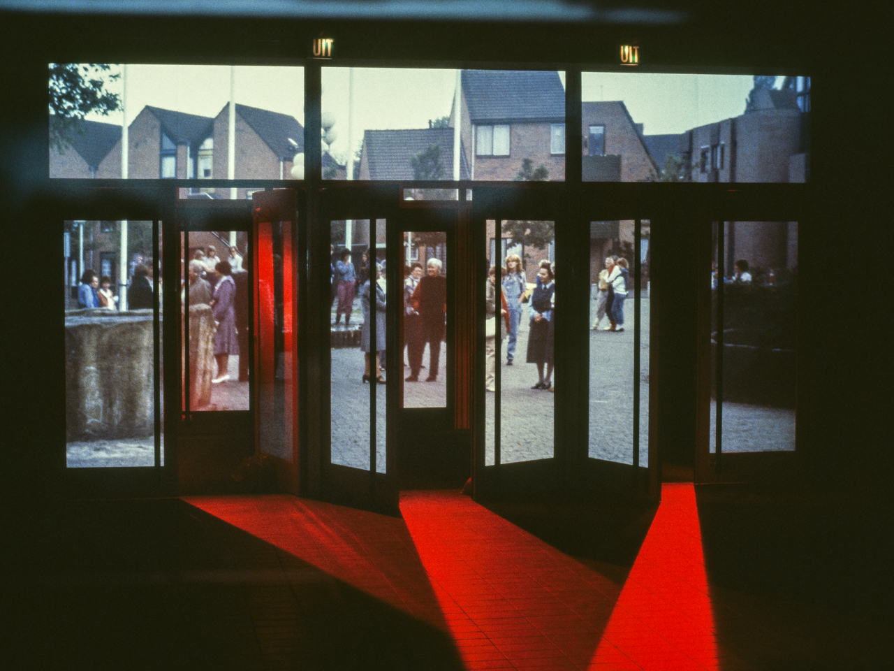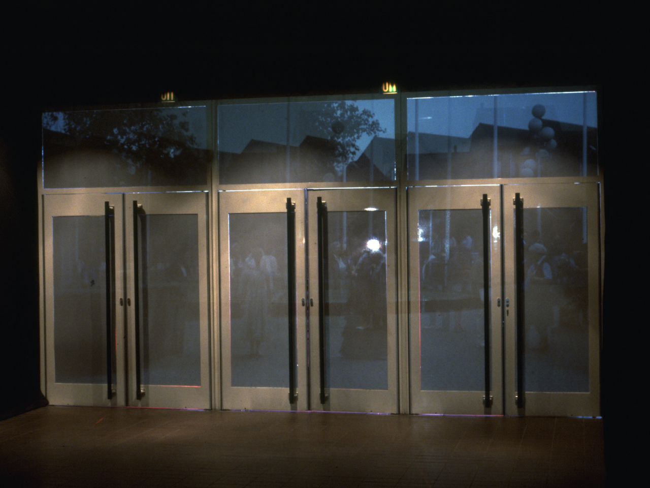 The installation used an augmented reality technique whereby slide projections on a row of four semitransparent mirrors permitted viewers to look through the mirrors and see projections on the glass panes of the main entrance doors to the theatre. These panes were covered with a special retro-reflective projection foil that created a convincing optical illusion wherein the viewers looked through these doors but saw the scenery of the real space outside. In this outdoor space, a number of fictional events had been performed and photographed, and these stills constituted a sequence of images as visitors walked down the corridor and moved from one mirrored projection to another.