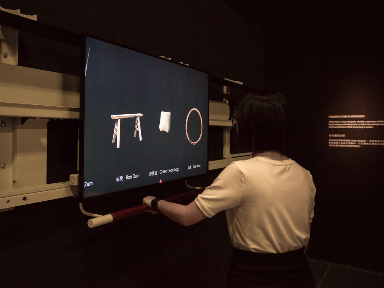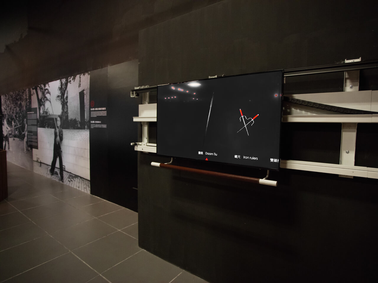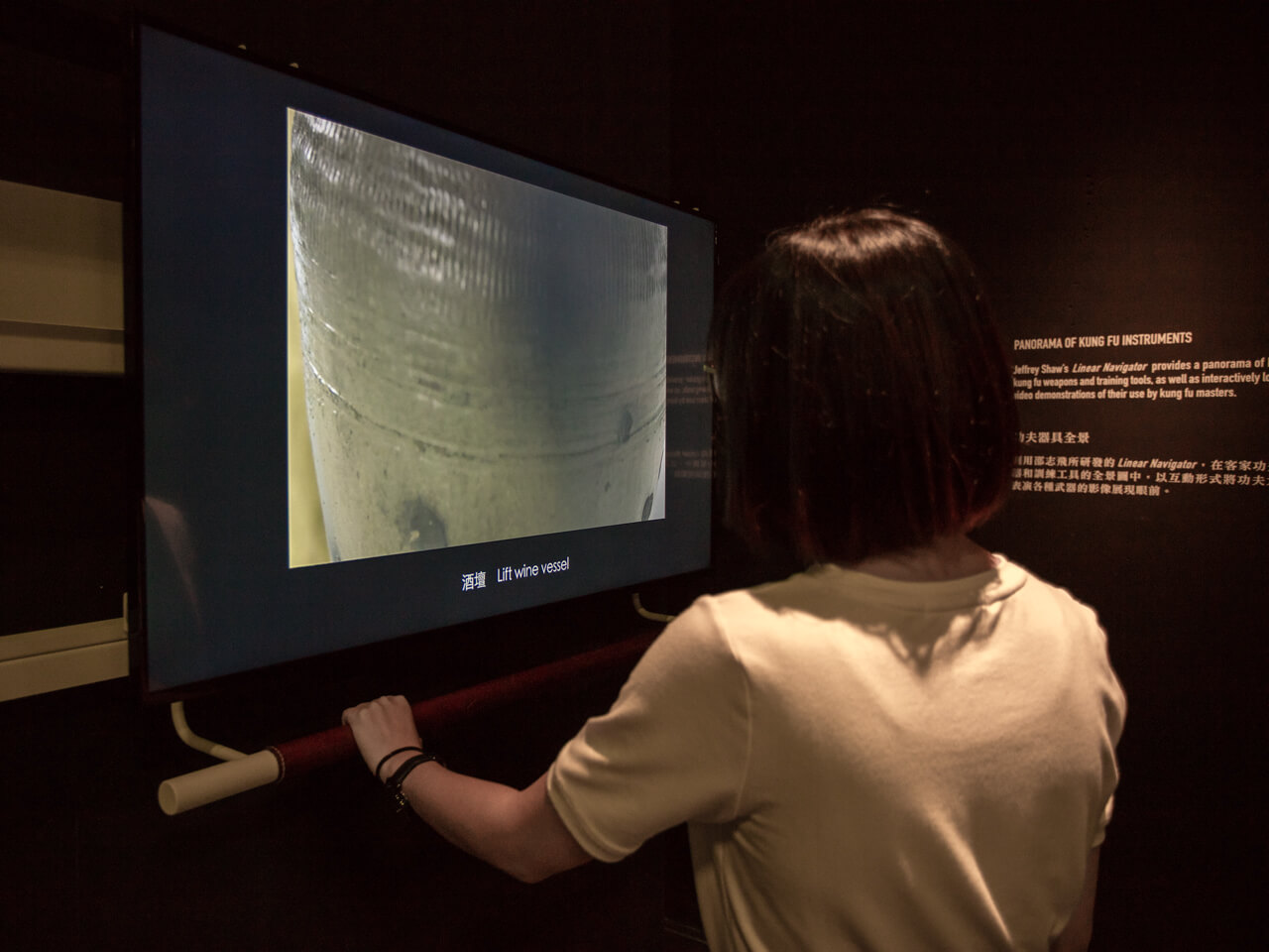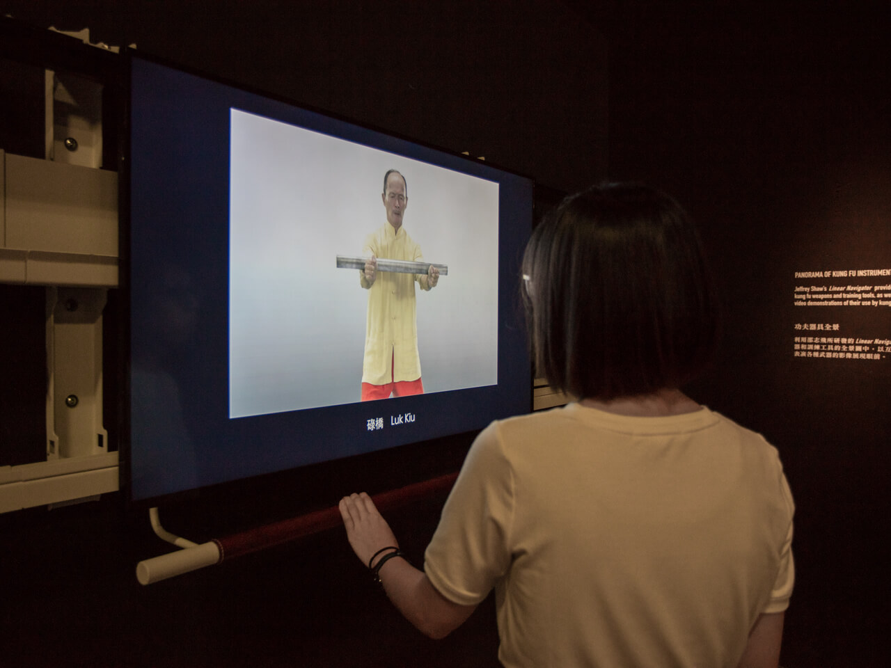 This iteration of Linear Navigator provides a panorama of Hakka kung fu weapons and training tools, as well as interactively located video demonstrations of their use by kung fu masters. Whenever the viewer positions the screen over one particular object, it triggers a short video clip showing the kung fu master’s handling of that respective weapon or training tool. Given that this exhibit is also in direct proximity to a display of actual objects of weaponry and training tools, it demonstrates the way in which such an interactive mediation of this corpus provides a cogent exhibition platform to explicate the intangible heritage aspect that is intrinsic to these artifacts.