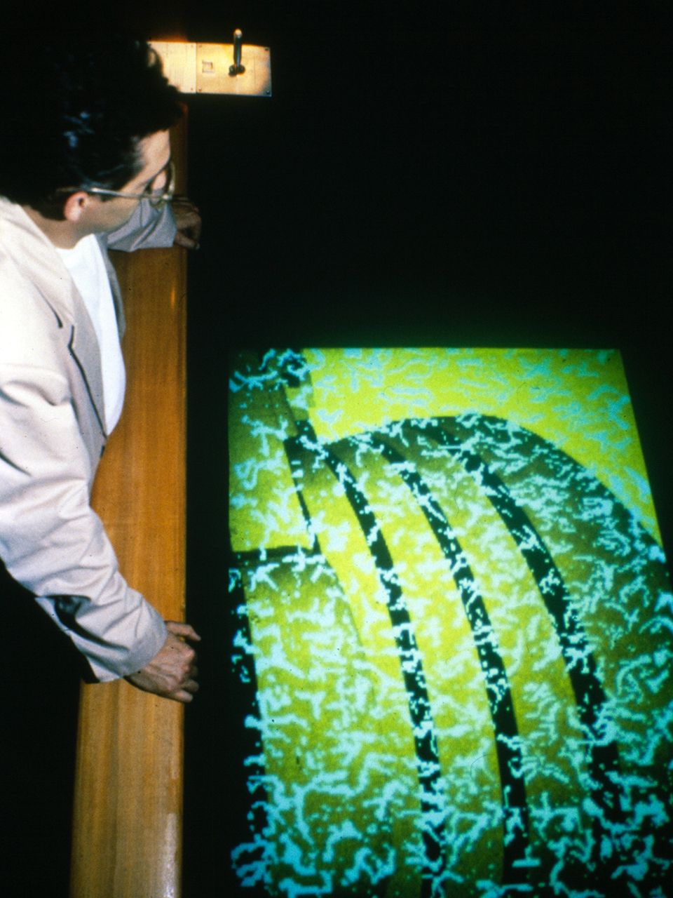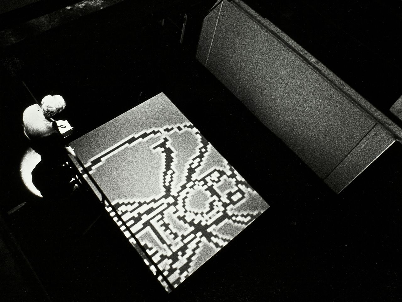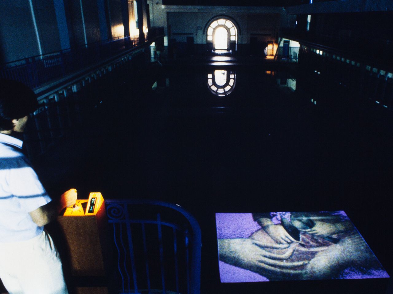 In the Narrative Landscape installation, images are projected onto a large screen lying flat on the floor of its exhibition space. The spectators stand on a surrounding balcony where a joystick enables any one of them to interactively operate the work. This is done by panning in any lateral direction over the surface of the images, and zooming in or out of a chosen part of an image. At the zoom extremes the application generates a digital transition from one image layer to another.