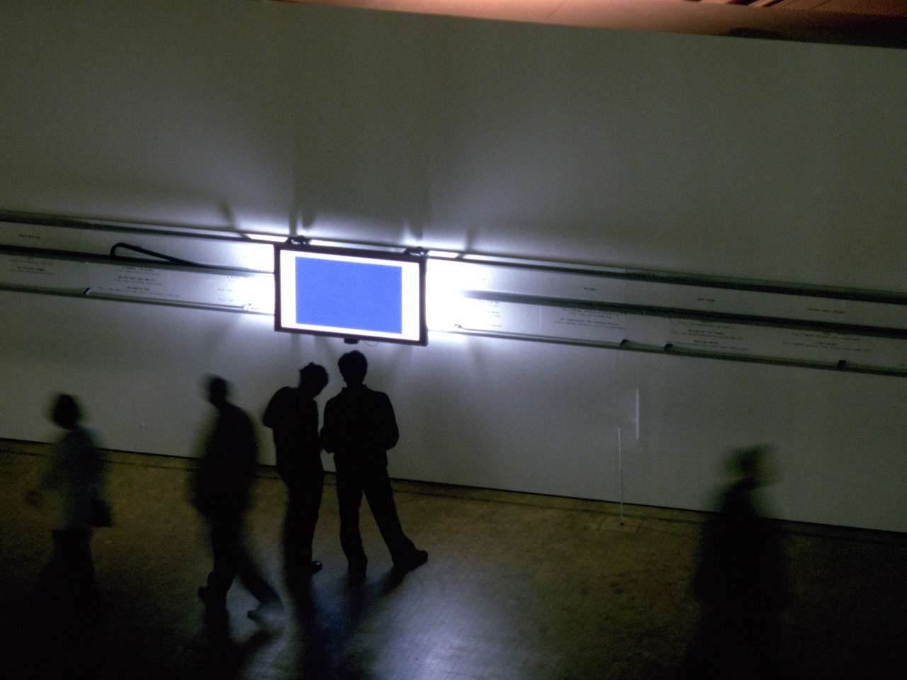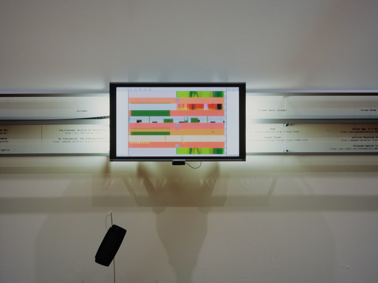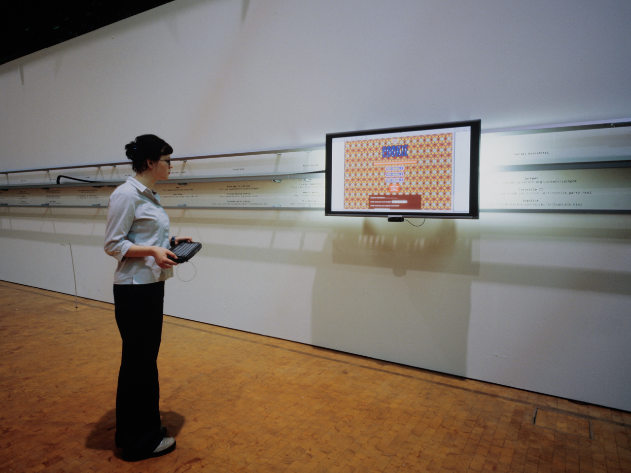 Its physical construction is a set of rails mounted on the wall, along which a motorized video monitor can travel to various positions that are marked with the names and URL’s of net artists. The curator Benjamin Weil selected these websites for this exhibition.