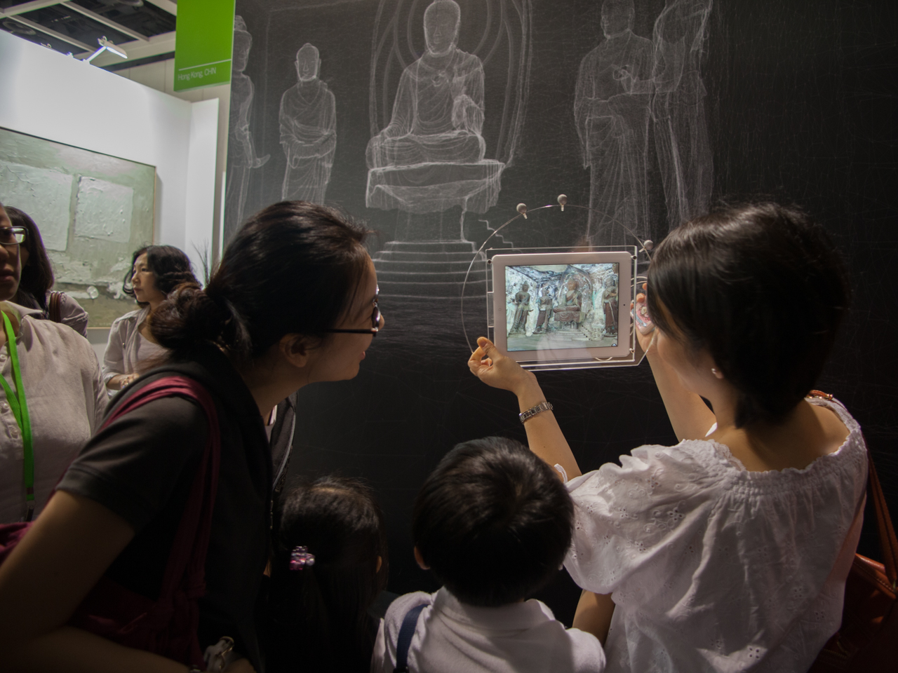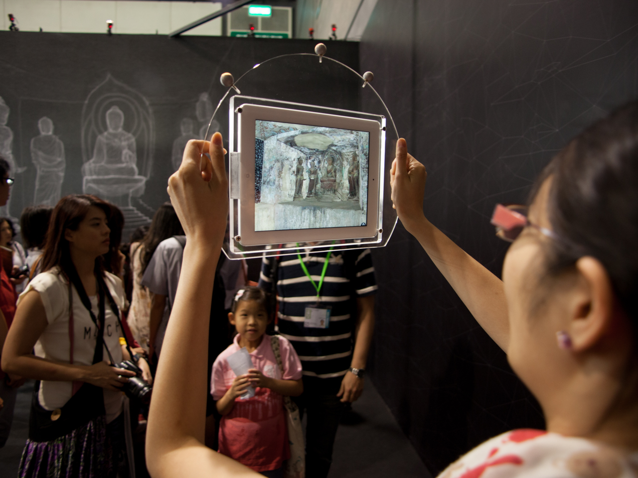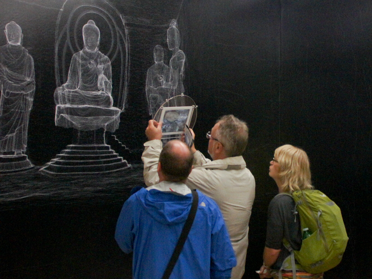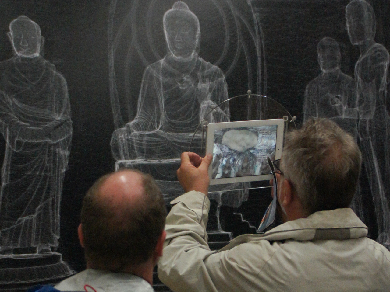 Pure Land AR demonstrates the future of mobile media and augmented reality as a means of virtually embodying 1:1 scale cultural heritage experiences. It creates a space for the conjunction between real and virtual formations that gives transacted aesthetic expression to Dunhuang’s Buddhist art treasury of mural paintings and sculptures. Visitors to Pure Land AR immediately grasp the functionality of the iPads, drawing them to walk around the room and explore the imagery of Cave 220. Furthermore, the experience generates spontaneous discussion among these visitors, as well as ‘virtual tourism’ as people enthusiastically photograph the imagery on the iPad with their own cameras.