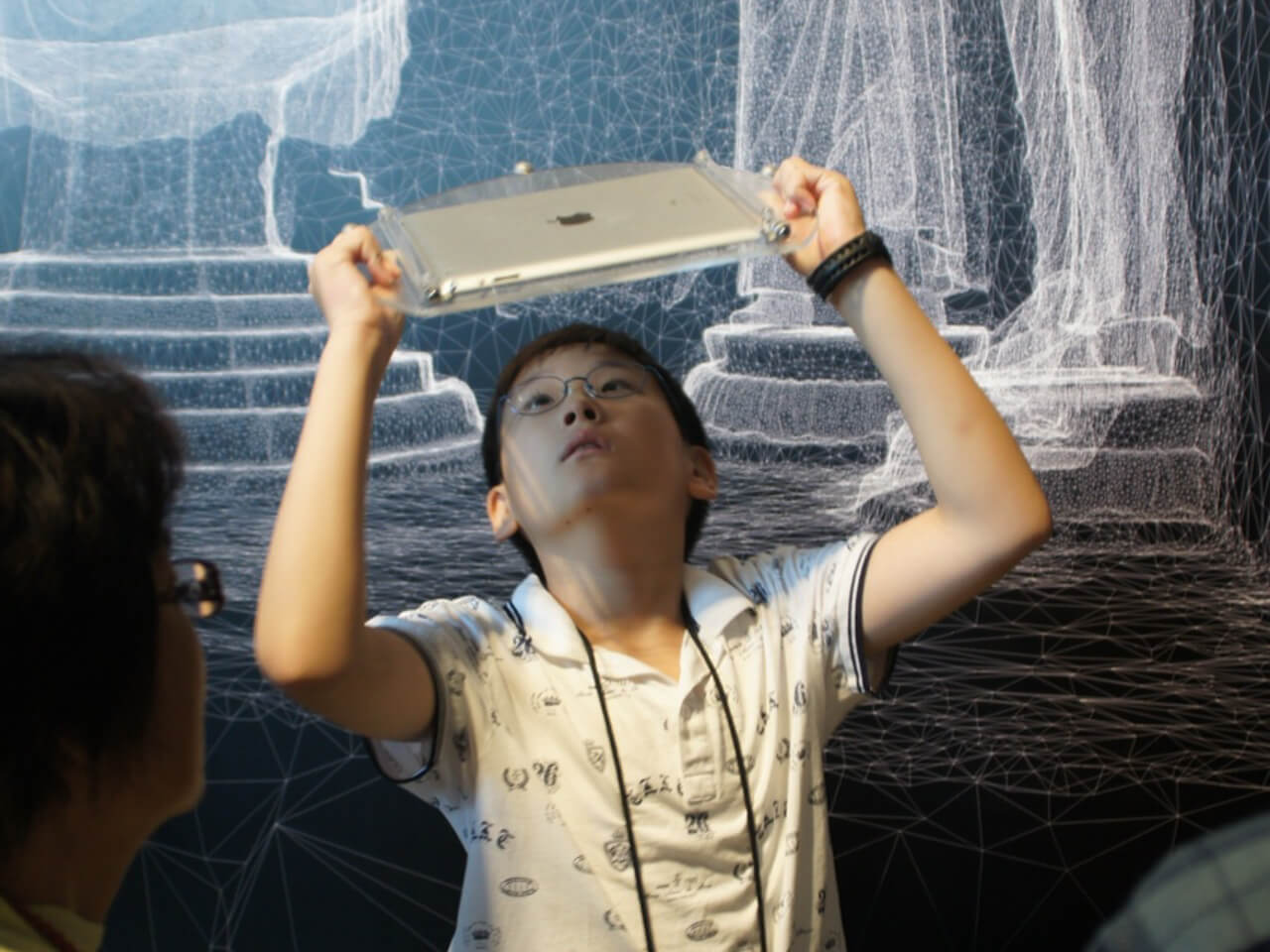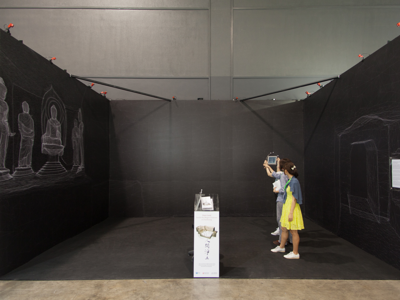 Pure Land AR employs iPad screens that visitors use as mobile viewing devices to explore the magnificent Buddhist wall paintings inside Cave 220, a cave dated to early Tang, from the Mogao Grottoes at Dunhuang in Gansu province, China. It is an innovative augmented-reality installation whereby the paintings and sculptures of the caves are rendered virtually within the architecture of a simply constructed rectangular room that shares same dimensions as those of Cave 220 itself.