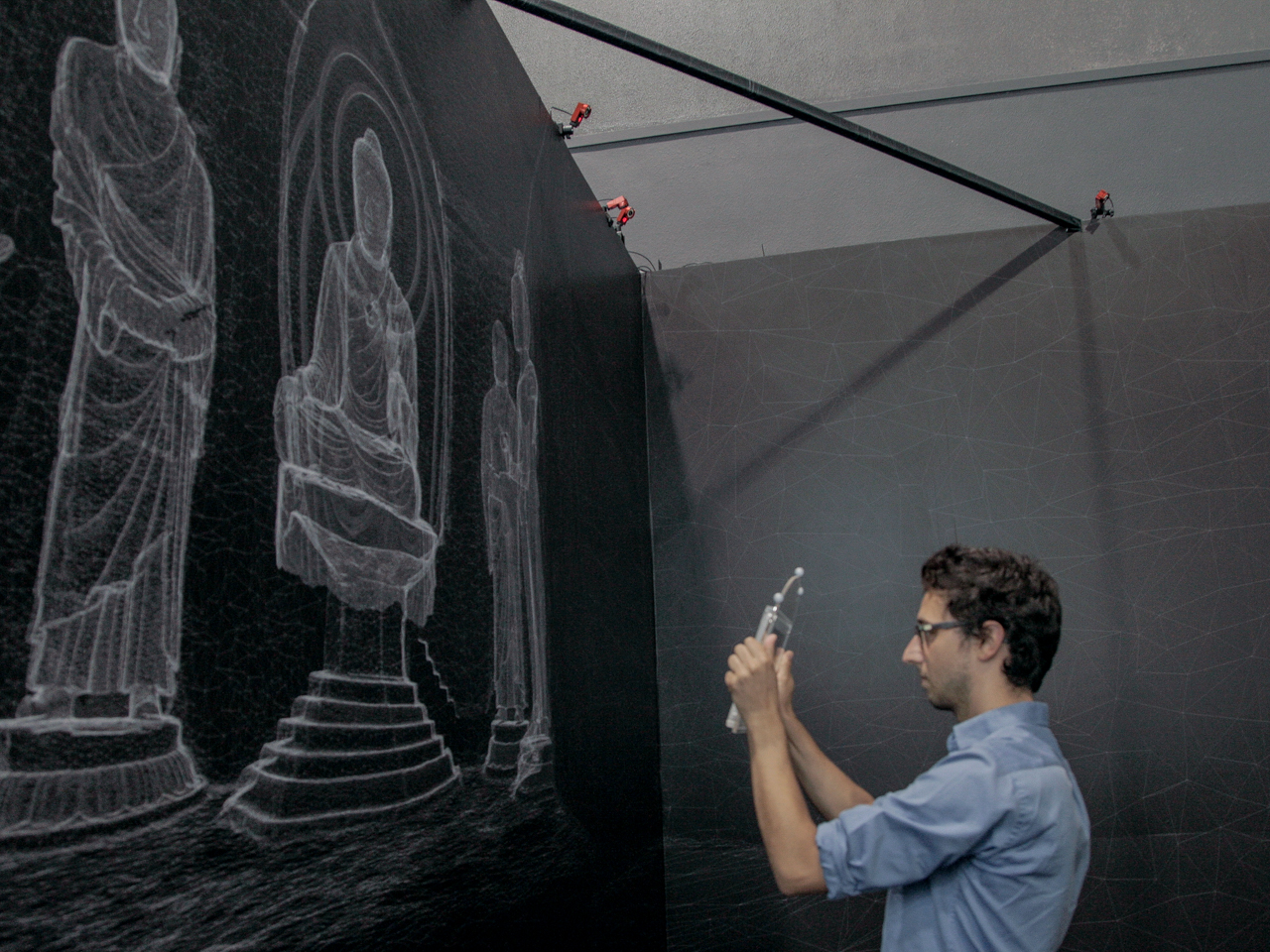 The walls of the booth are covered with full-scale photographic prints, made by the Dunhuang Academy, that show laser scans of the architecture of Cave 220. These provide a structural and aesthetic alignment between the space of the room and that of the cave. This is especially evident when a viewer places the iPad interface directly up against a wall, at which point its laser-scan background becomes augmented by a 1:1 scale rendition of its painted surface on the iPad screen.
