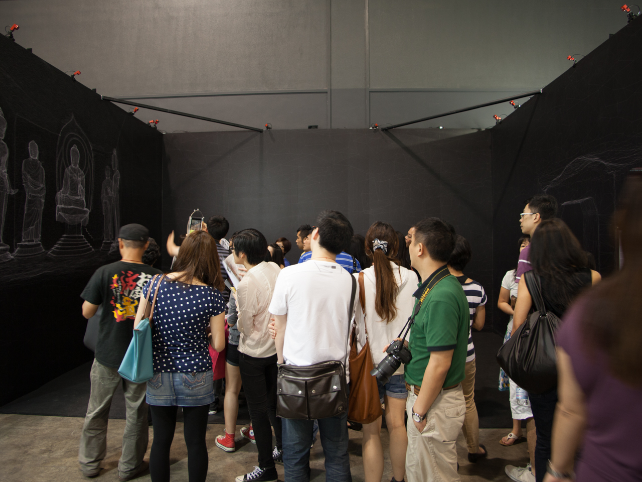 This new technical rendering of Pure Land (2012) is facilitated by the use of infrared cameras that accurately track the position and orientation of two iPads as they are being handled by the visitors. The cameras can detect these iPads because of small optical markers that are attached to their frames. Computers then create the appropriately rendered views of the actual Dunhuang cave, which are transmitted to the iPads via a Wi-Fi connection.