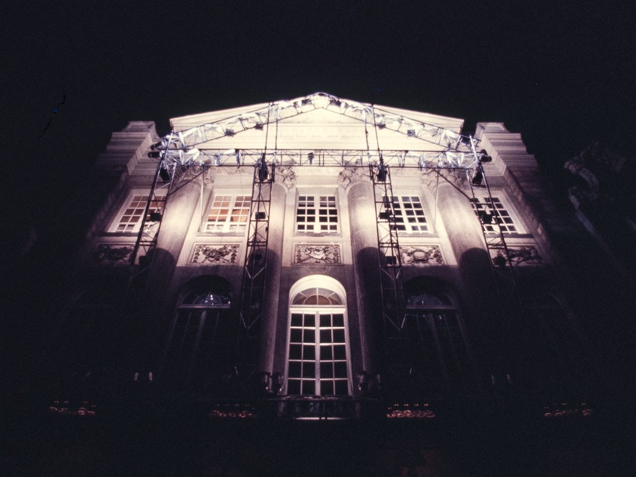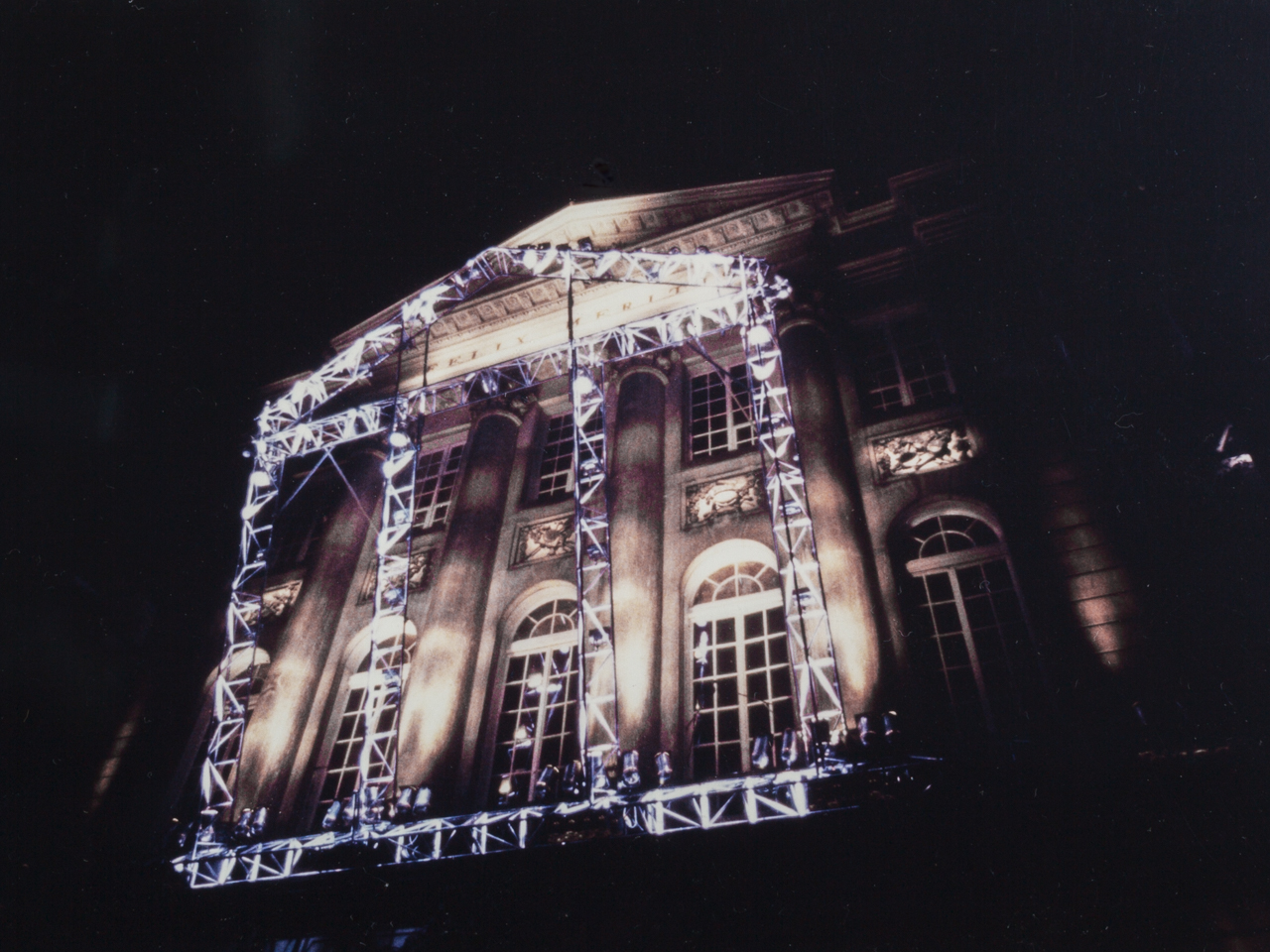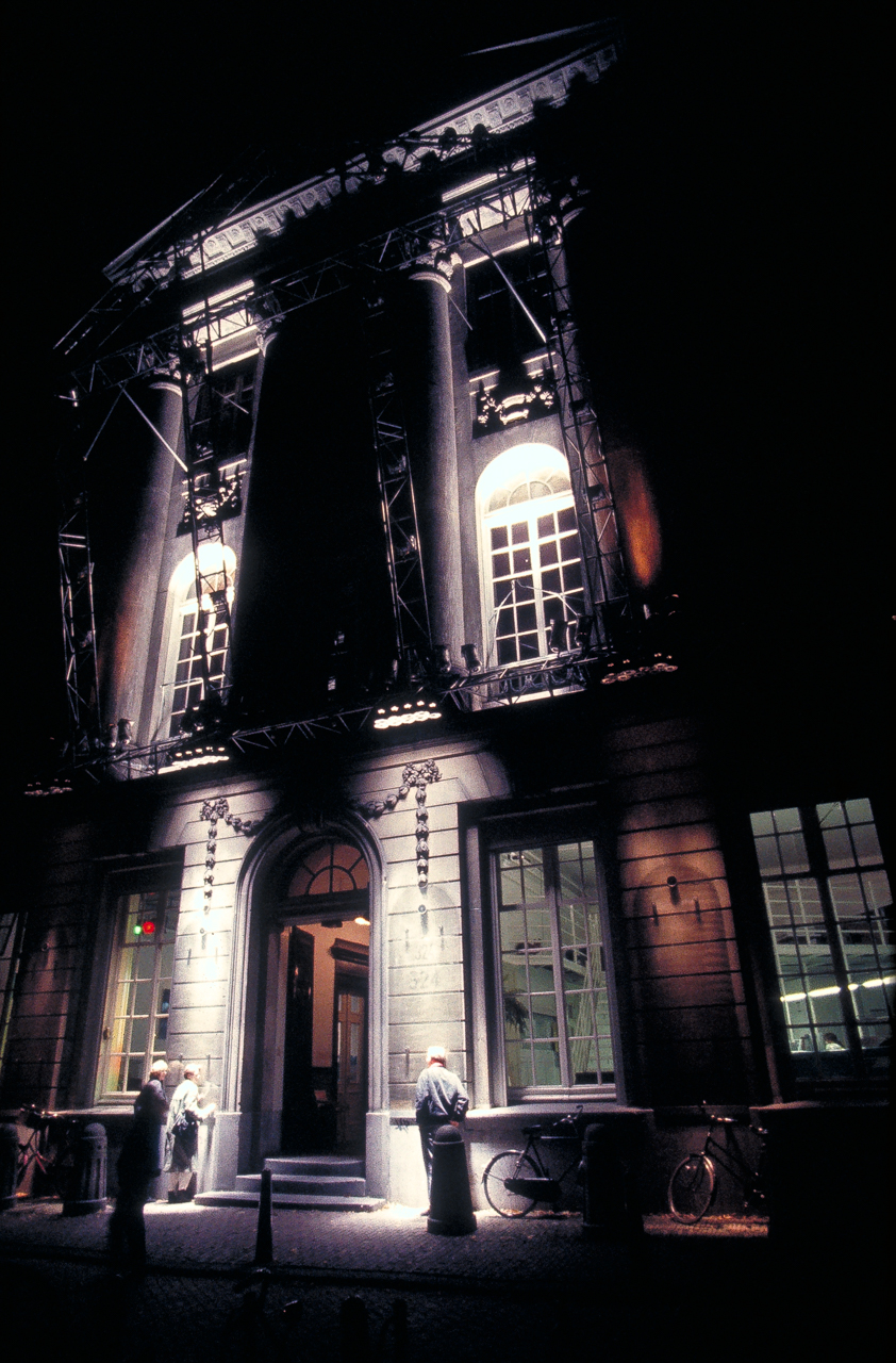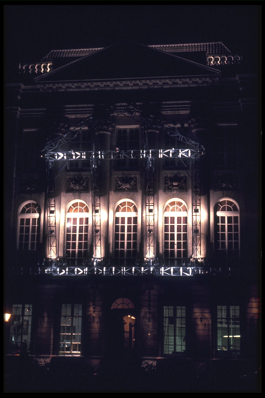 Sonus Lux was commissioned on the occasion of the 200th anniversary of the Felix Meritis building, in Amsterdam. In this ‘son et lumière’ performance, computer-programmed lighting dynamically articulated the elegant neo-classical features of the Felix Meritis facade. The lighting fixtures were mounted on a truss sculpture that cantilevered out from the building, and whose shape echoed the architectural design of its facade. The conceptual intention was for this structure to create an architectonic reflection that would light the building. Music composed specially for this occasion by Harry de Wit accompanied the light performance.