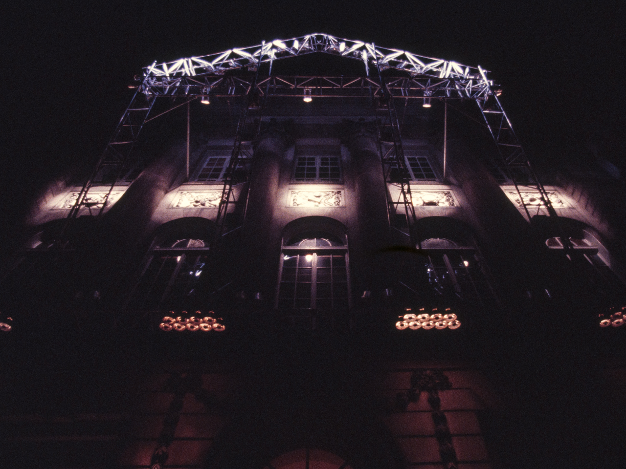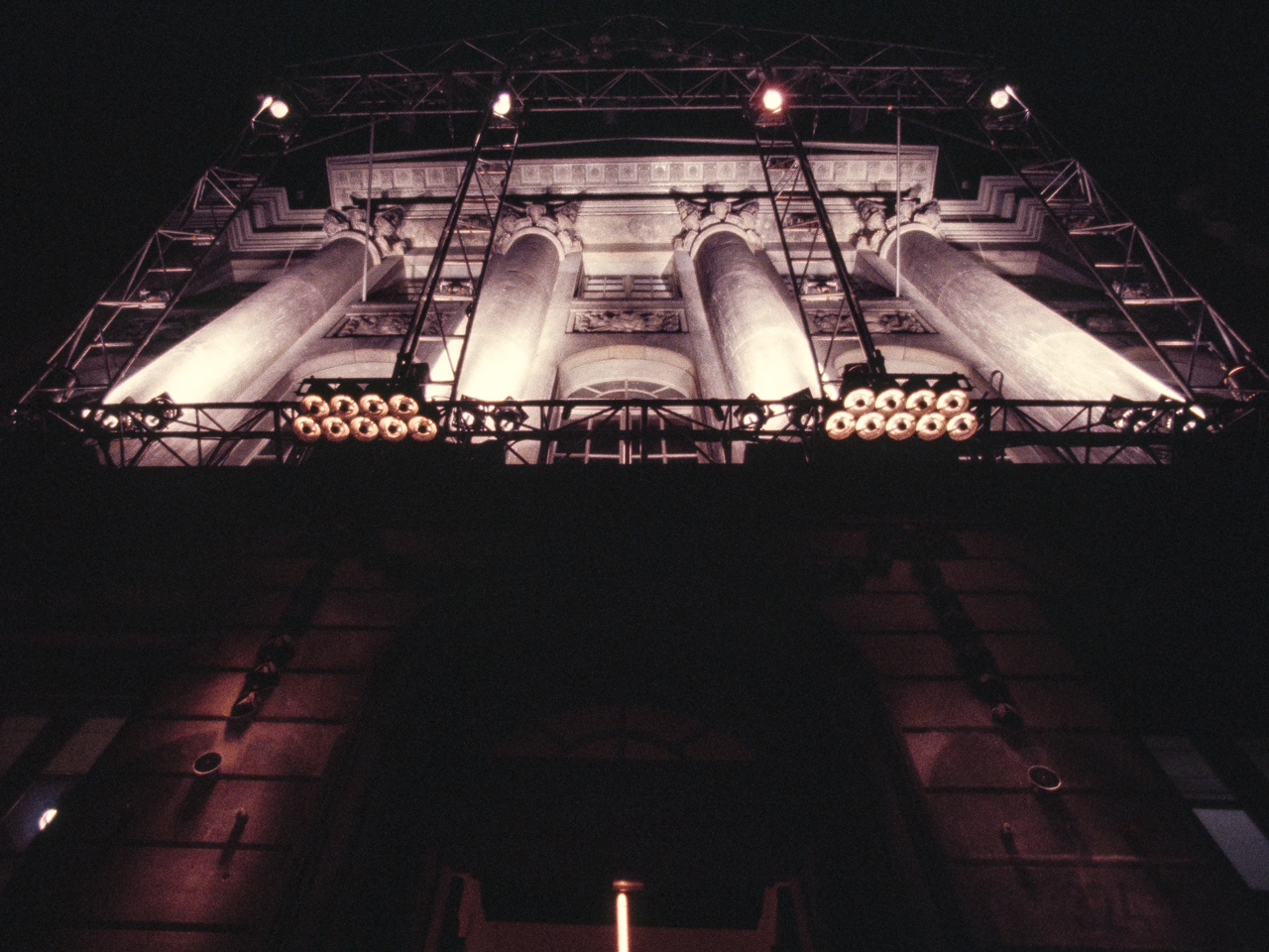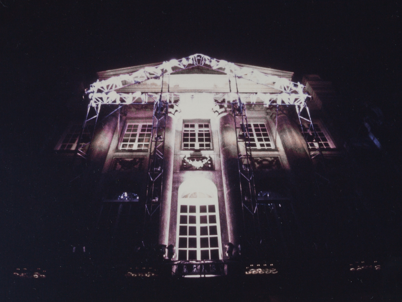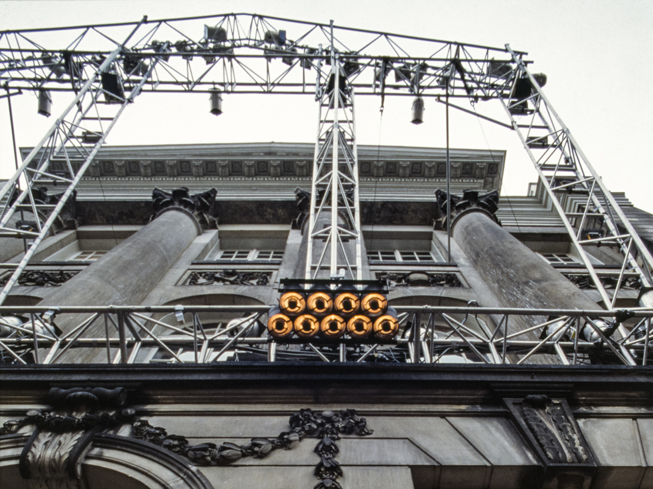 Sonus Lux was commissioned on the occasion of the 200th anniversary of the Felix Meritis building, in Amsterdam. In this ‘son et lumière’ performance, computer-programmed lighting dynamically articulated the elegant neo-classical features of the Felix Meritis facade. The lighting fixtures were mounted on a truss sculpture that cantilevered out from the building, and whose shape echoed the architectural design of its facade. The conceptual intention was for this structure to create an architectonic reflection that would light the building. Music composed specially for this occasion by Harry de Wit accompanied the light performance.
