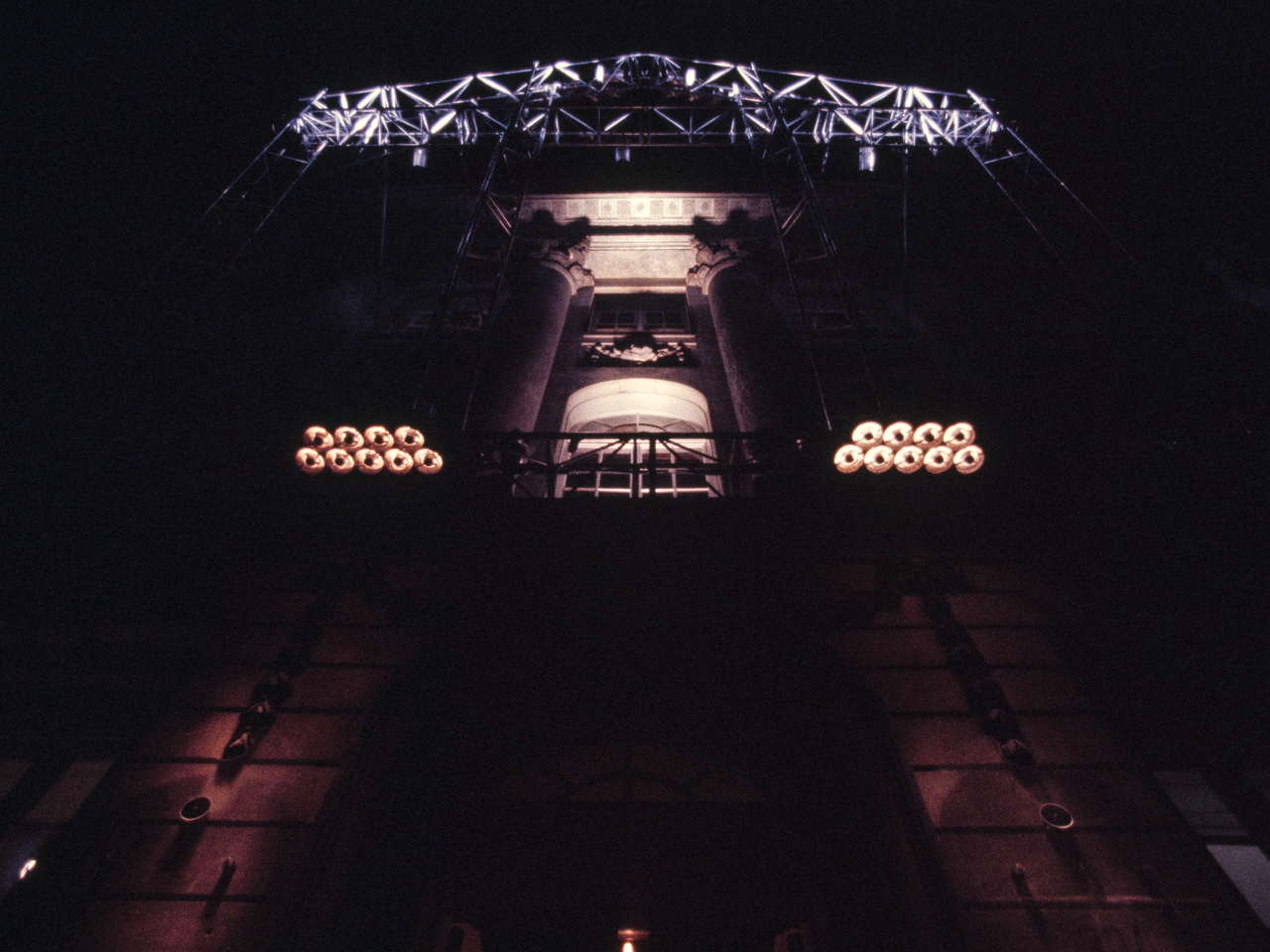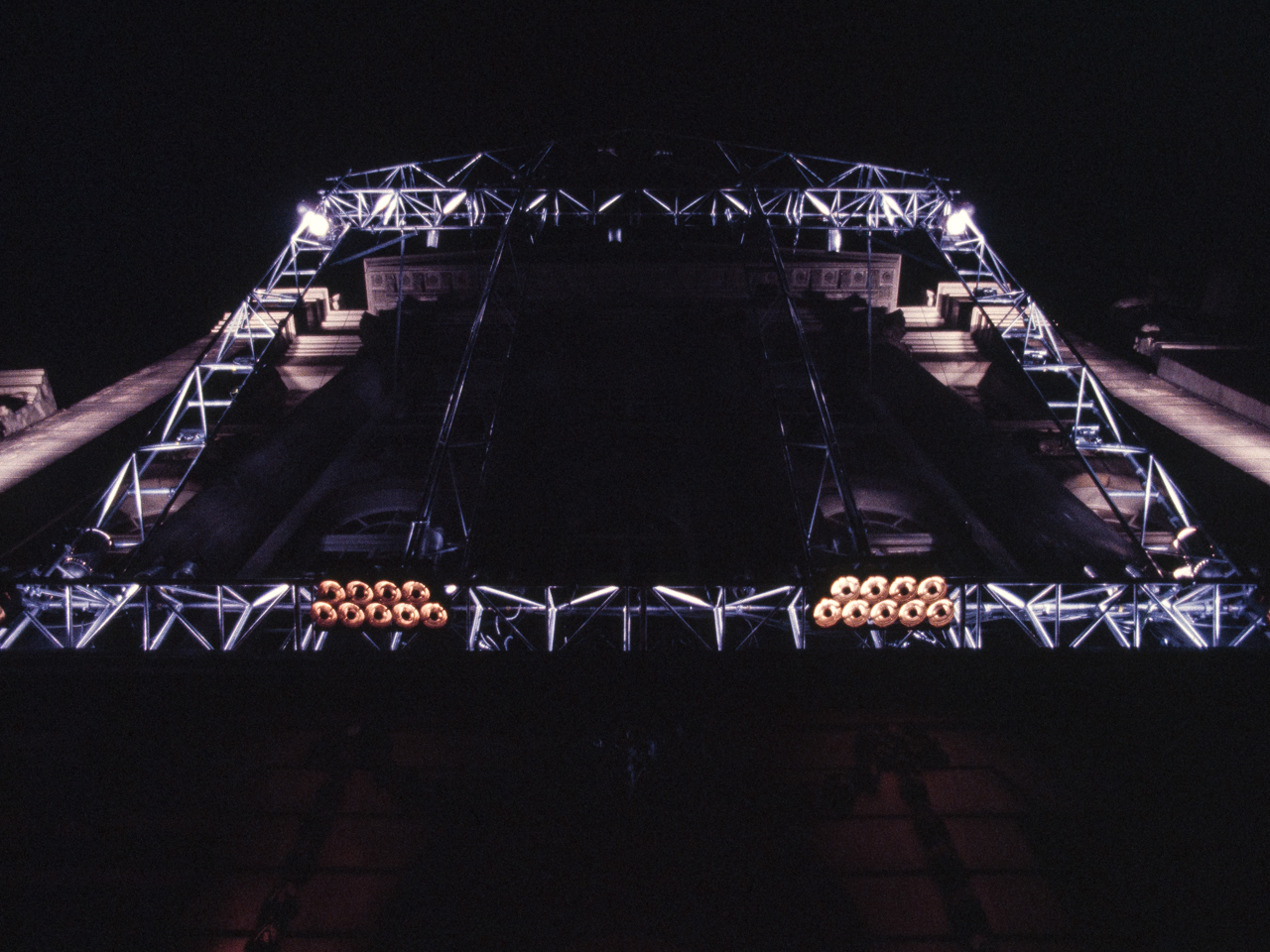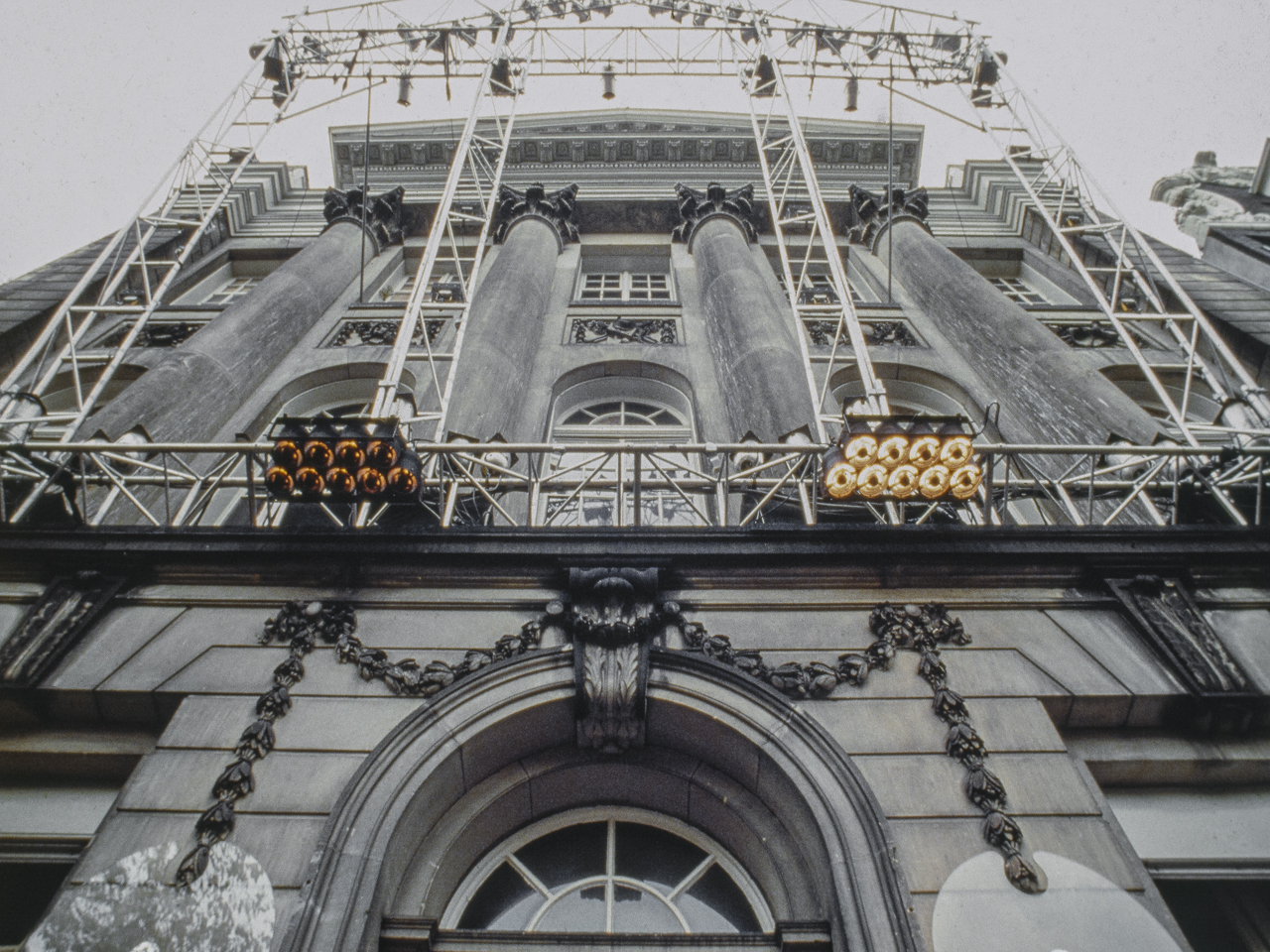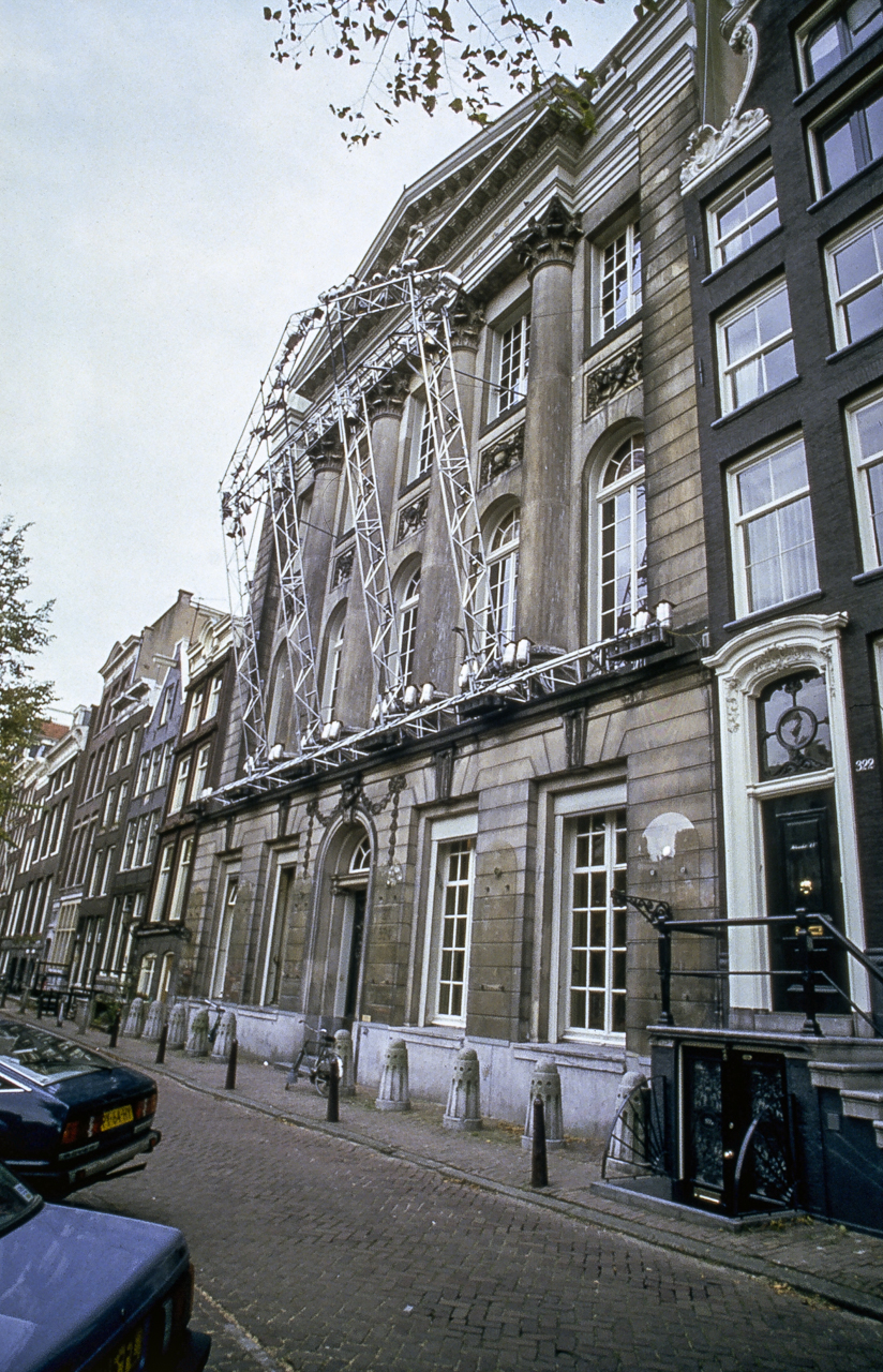 Sonus Lux was commissioned on the occasion of the 200th anniversary of the Felix Meritis building, in Amsterdam. In this ‘son et lumière’ performance, computer-programmed lighting dynamically articulated the elegant neo-classical features of the Felix Meritis facade. The lighting fixtures were mounted on a truss sculpture that cantilevered out from the building, and whose shape echoed the architectural design of its facade. The conceptual intention was for this structure to create an architectonic reflection that would light the building. Music composed specially for this occasion by Harry de Wit accompanied the light performance.