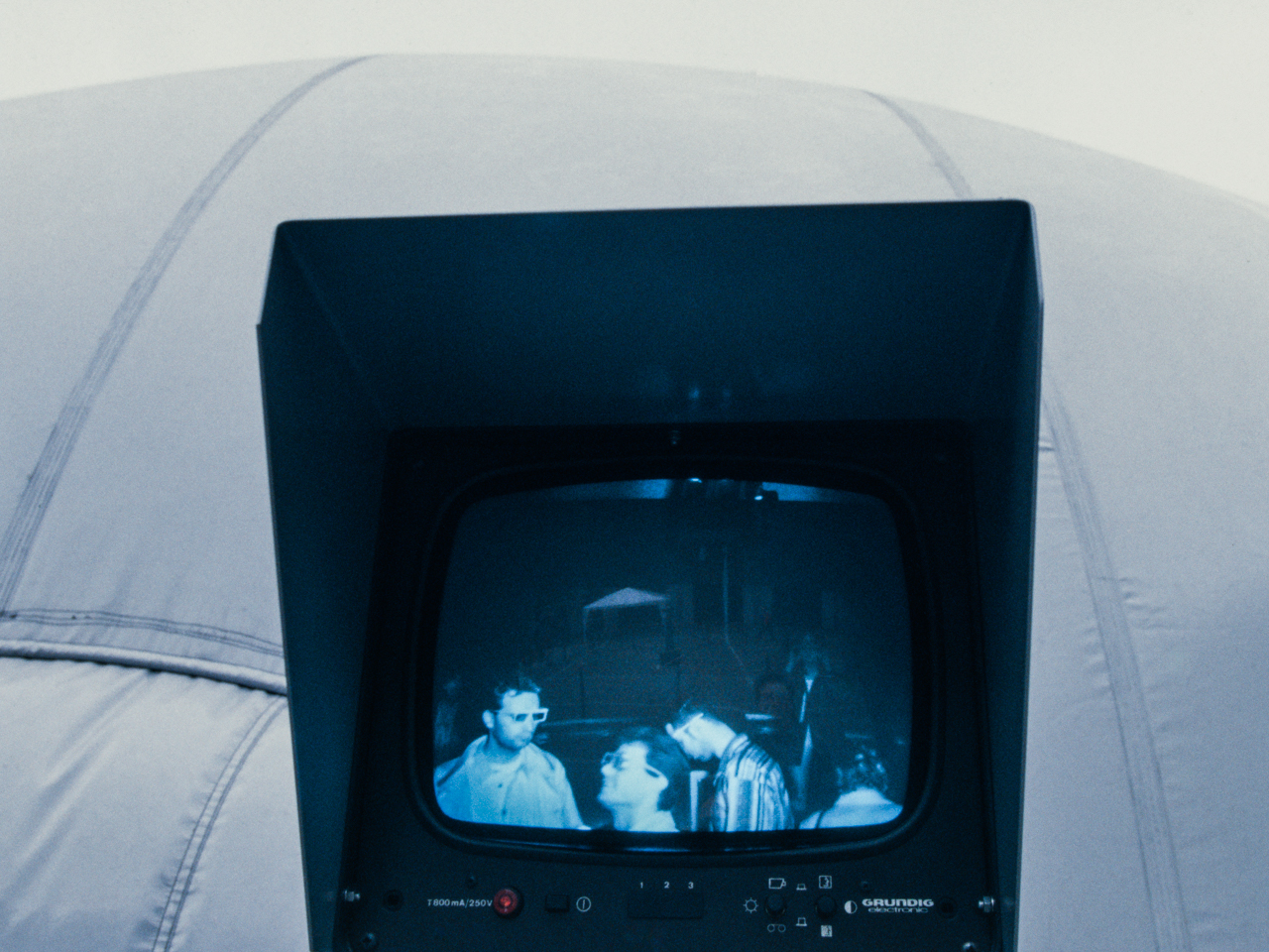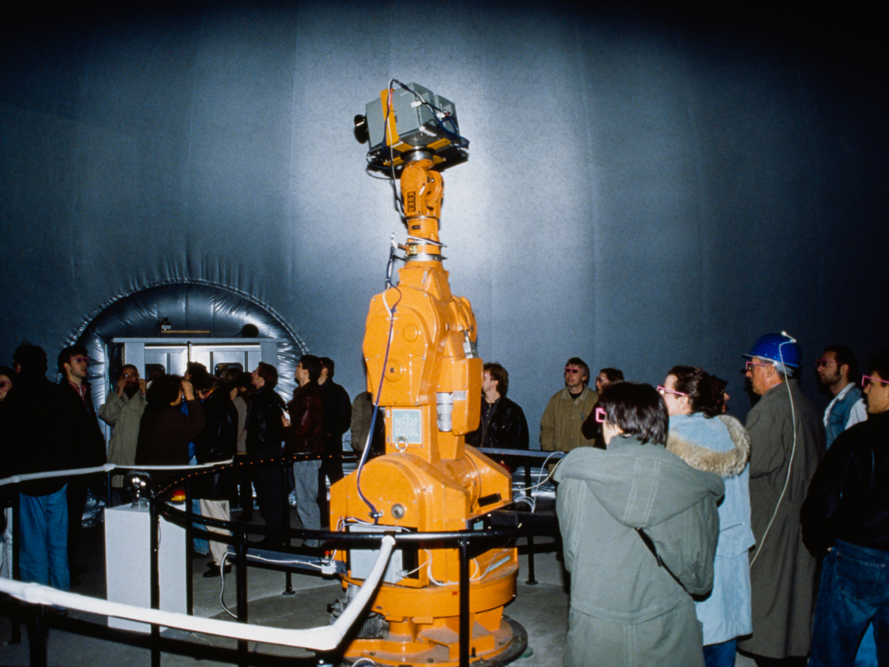 The Telepresent Onlookers utilizes the EVE (1993) visualization system. In the centre of a large inflatable dome, two video projectors are mounted on a motorised pan/tilt device which can move the projected image anywhere over the inside surface of the dome. The two video projectors present a stereo pair of images and viewers wearing polarising spectacles can see the projected imagery in three dimensions.