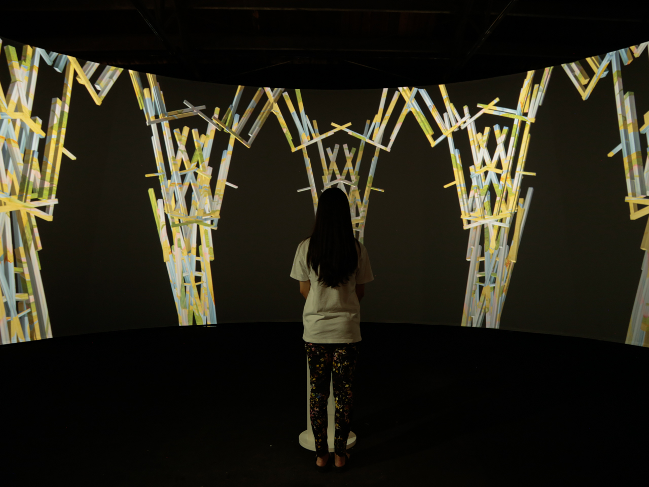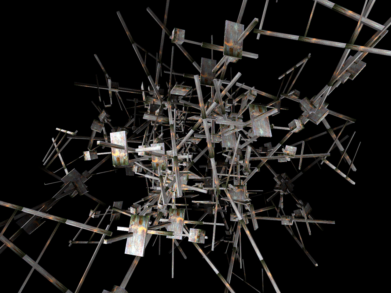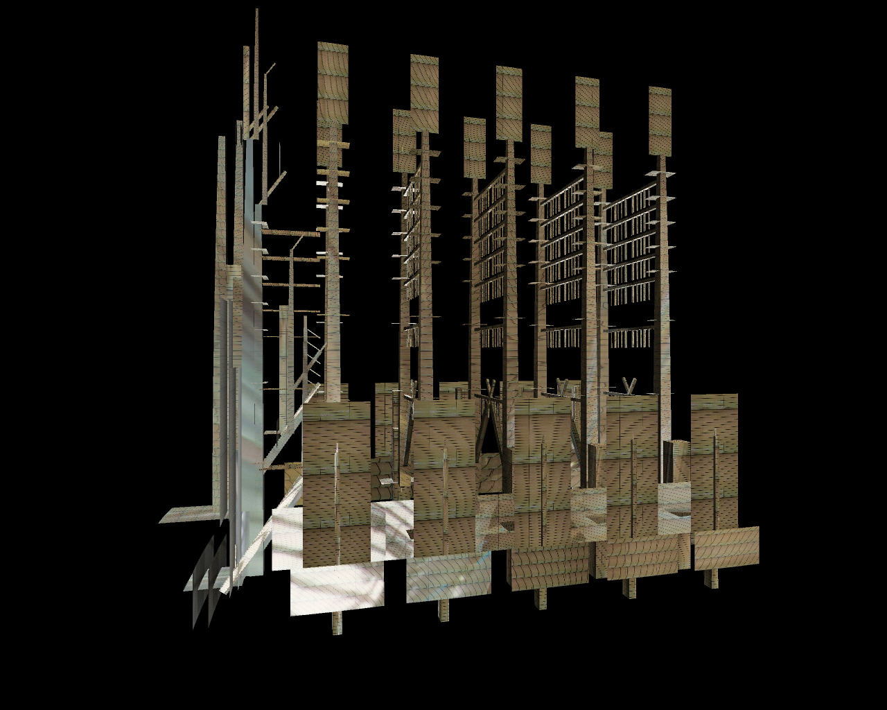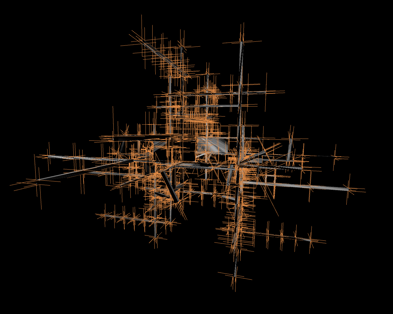 In its later iterations it became an interactive 3-D computer-graphic installation that provides an evolving and elucidating visualization of the polyphonic music of the Renaissance. Custom software randomly selects from a vocabulary of architectonic forms that are added, removed and transfigured to create the artwork’s dynamically developing visual compositions. Comprising a variety of iconographic frameworks for spectators to select from, these metaphoric and synesthetic structures reach out to engage the viewer as they unfold in a seemingly organic manner.