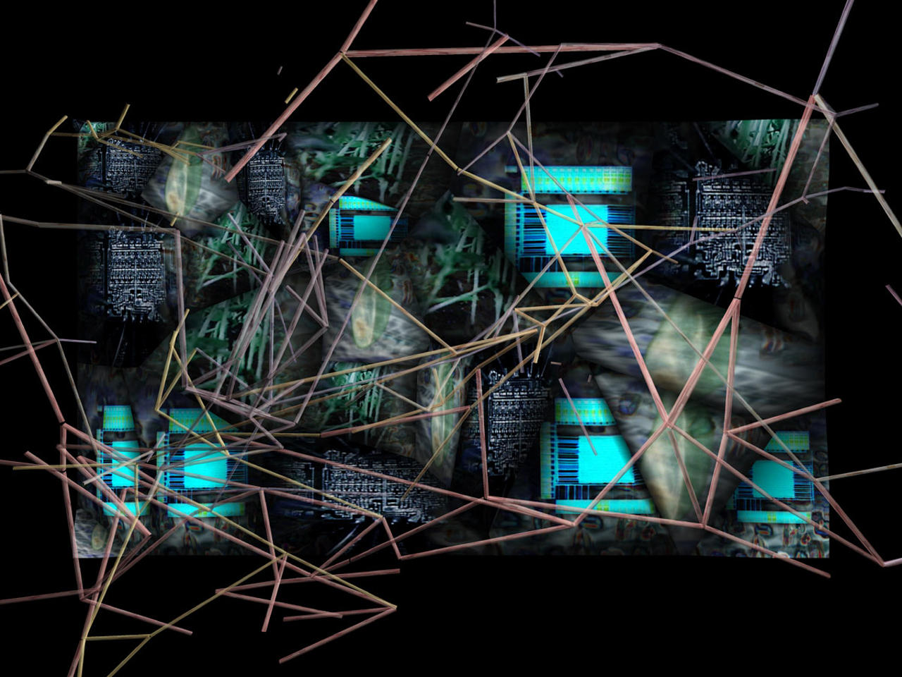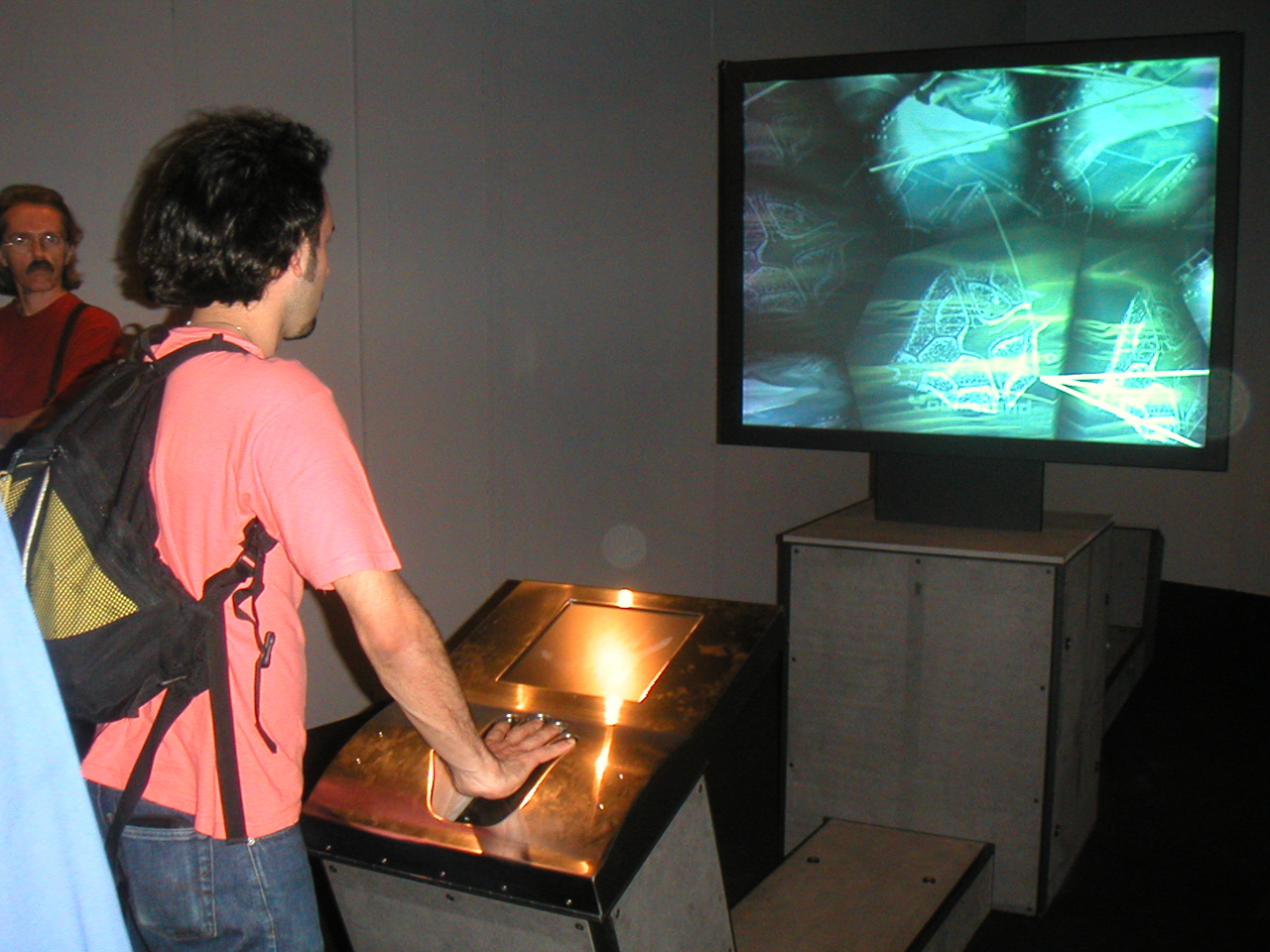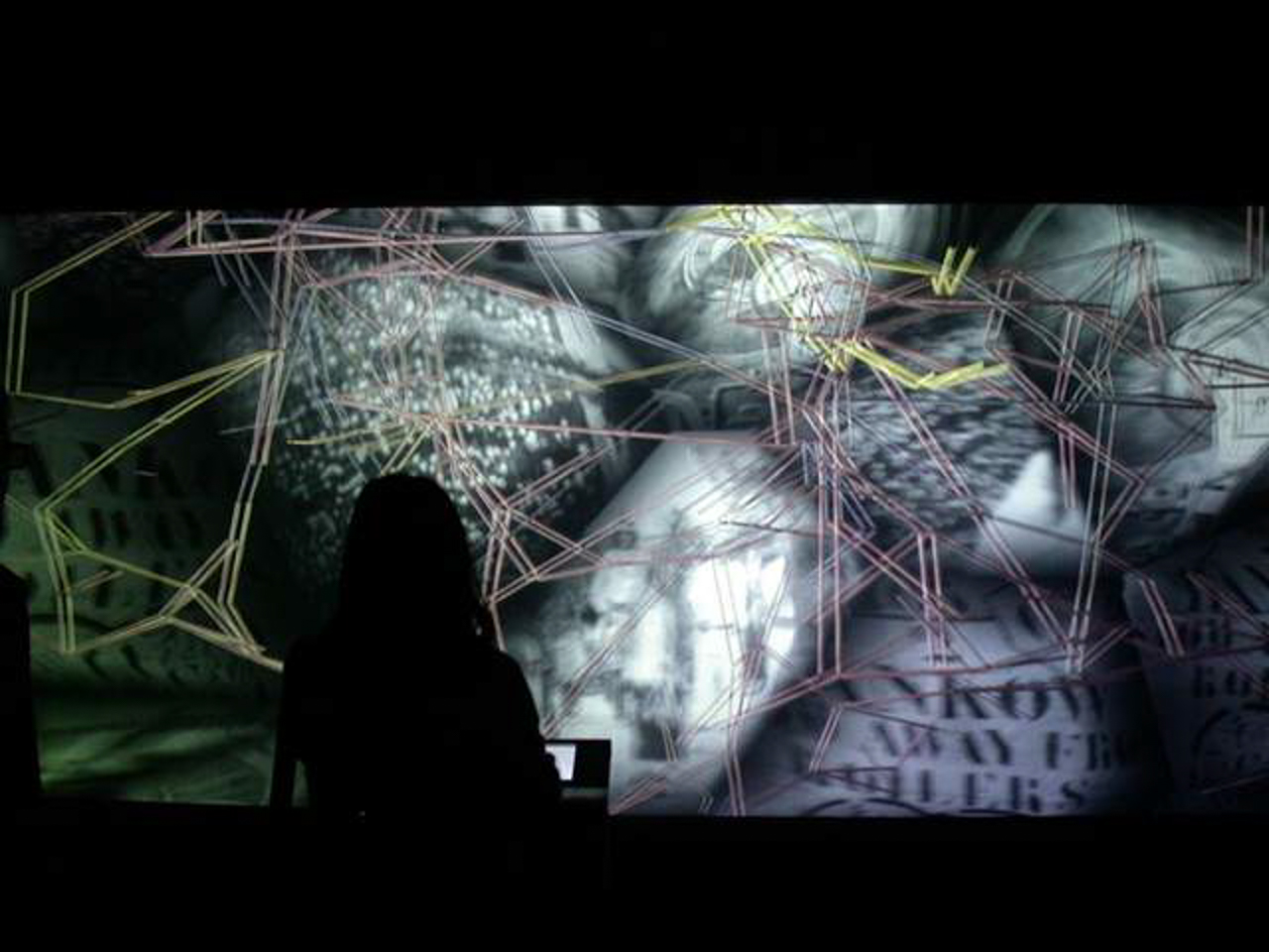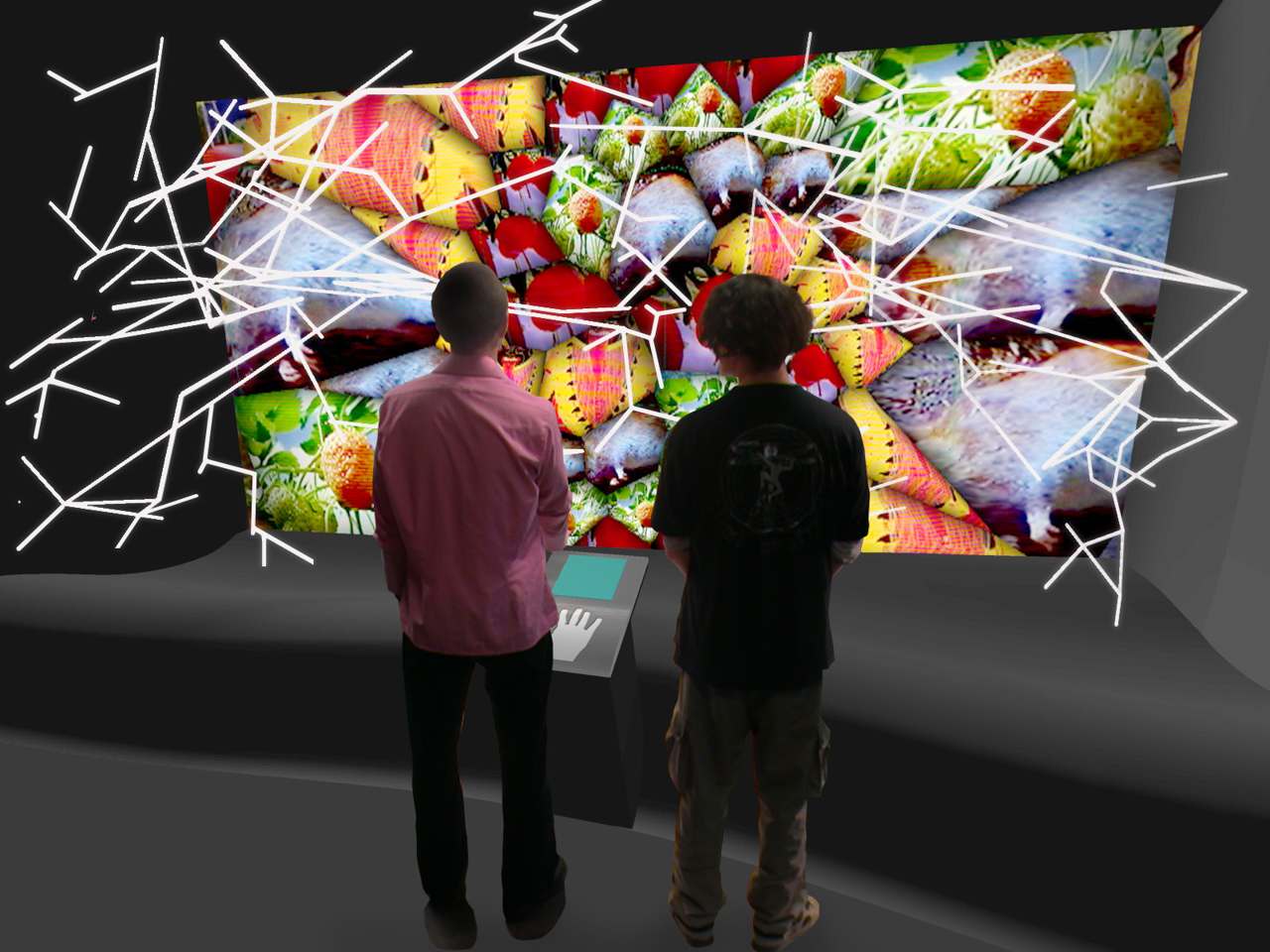 The projected panoramic 3-D imagery computes in real time and continually creates manifold structures and patterns that evoke an organic network of pictorial and thematic relations. This cellular lattice integrates processed video clips that are dynamically selected from a large database of archival footage, illustrating various types of networks: the urban lattice of streets, the tracery of a printed circuit board, the fan of waterways at a river delta, or the filigree of arteries in the human body, etc.. Custom software, based on the concept of the network, provides a coded environment in which the visual network acts as a self-organizing system, utilizing biology-derived metaphors such as neuronal growth. And by scanning their palm lines, participants contribute an attribute of their identities to its changing artistically constituted formations.