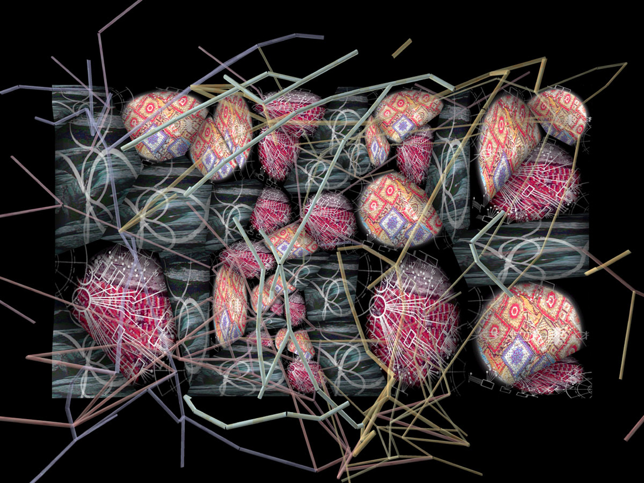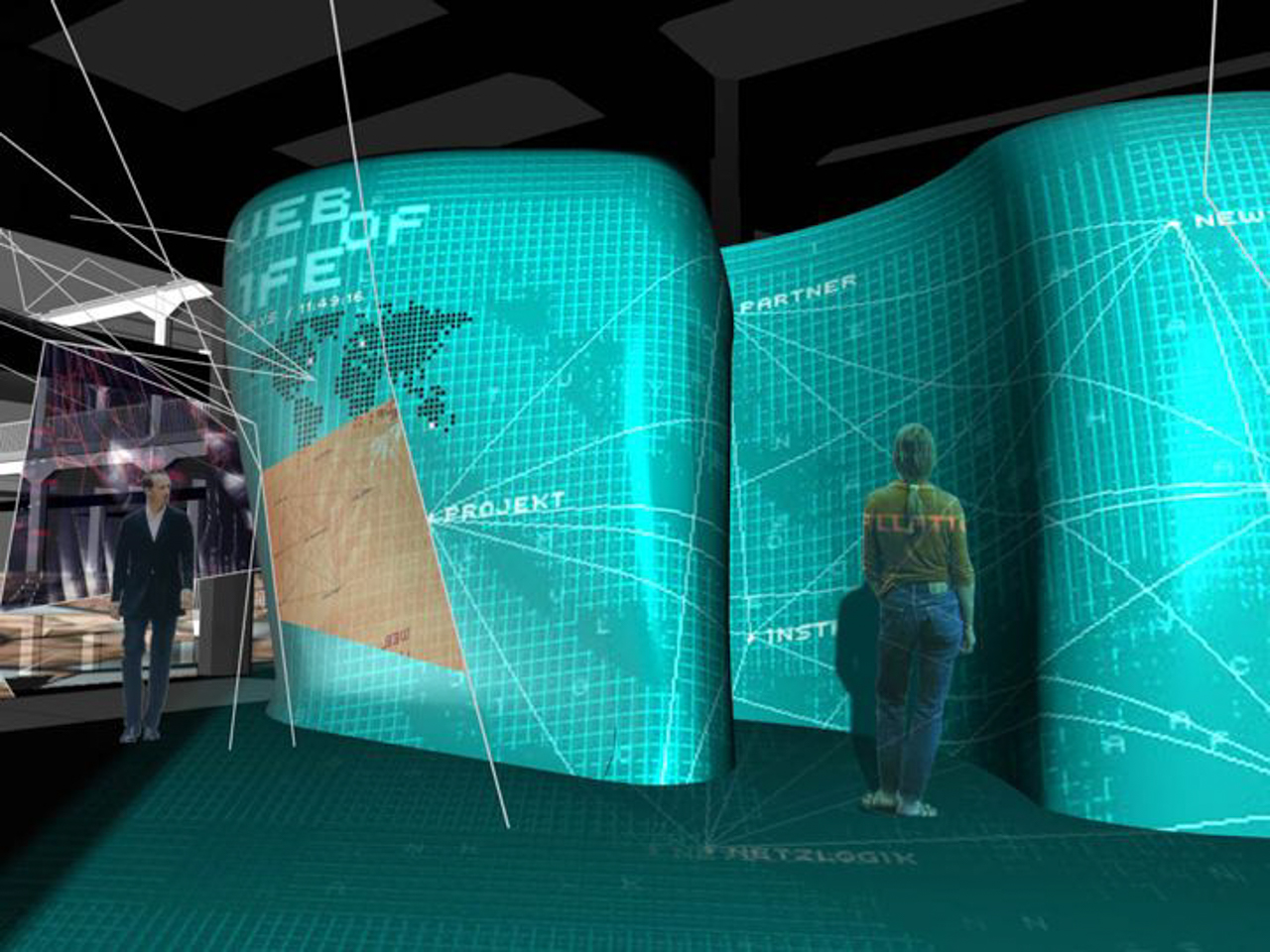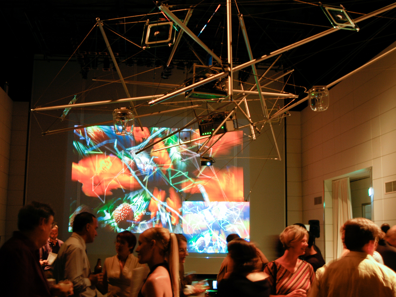 The projected panoramic 3-D imagery computes in real time and continually creates manifold structures and patterns that evoke an organic network of pictorial and thematic relations. This cellular lattice integrates processed video clips that are dynamically selected from a large database of archival footage, illustrating various types of networks: the urban lattice of streets, the tracery of a printed circuit board, the fan of waterways at a river delta, or the filigree of arteries in the human body, etc.. Custom software, based on the concept of the network, provides a coded environment in which the visual network acts as a self-organizing system, utilizing biology-derived metaphors such as neuronal growth. And by scanning their palm lines, participants contribute an attribute of their identities to its changing artistically constituted formations.