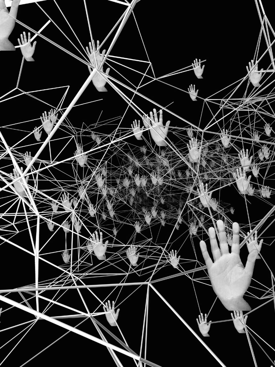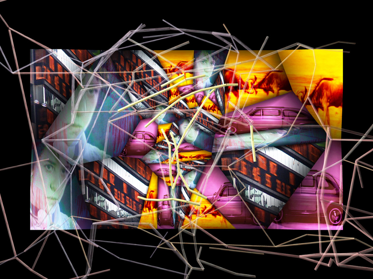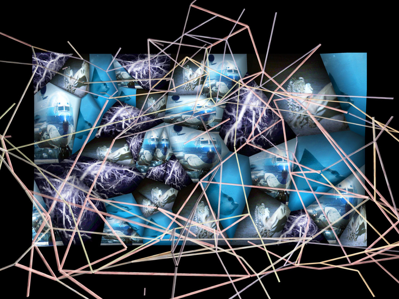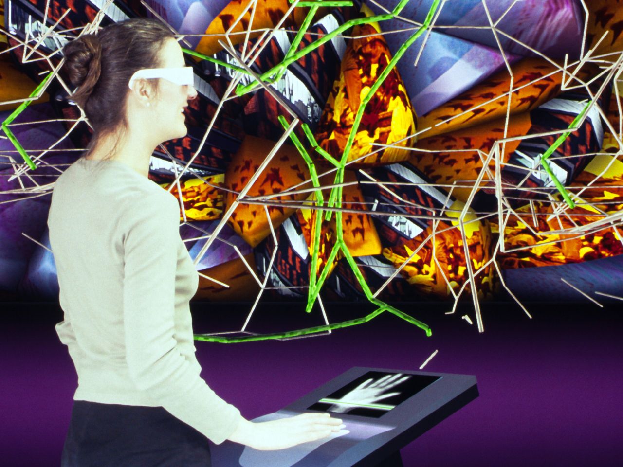 The projected panoramic 3-D imagery computes in real time and continually creates manifold structures and patterns that evoke an organic network of pictorial and thematic relations. This cellular lattice integrates processed video clips that are dynamically selected from a large database of archival footage, illustrating various types of networks: the urban lattice of streets, the tracery of a printed circuit board, the fan of waterways at a river delta, or the filigree of arteries in the human body, etc.. Custom software, based on the concept of the network, provides a coded environment in which the visual network acts as a self-organizing system, utilizing biology-derived metaphors such as neuronal growth. And by scanning their palm lines, participants contribute an attribute of their identities to its changing artistically constituted formations.
