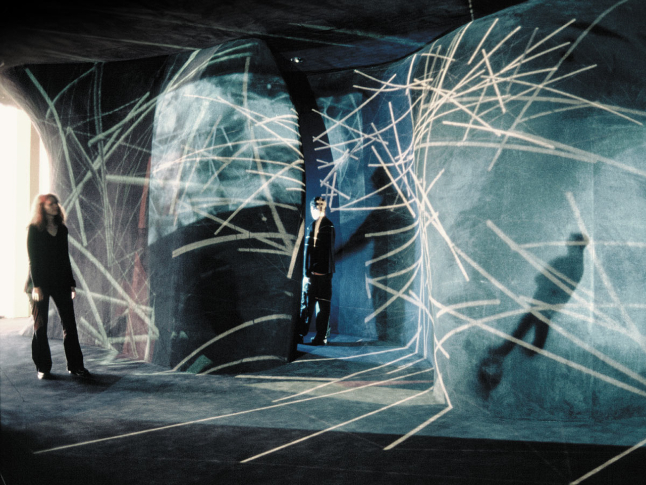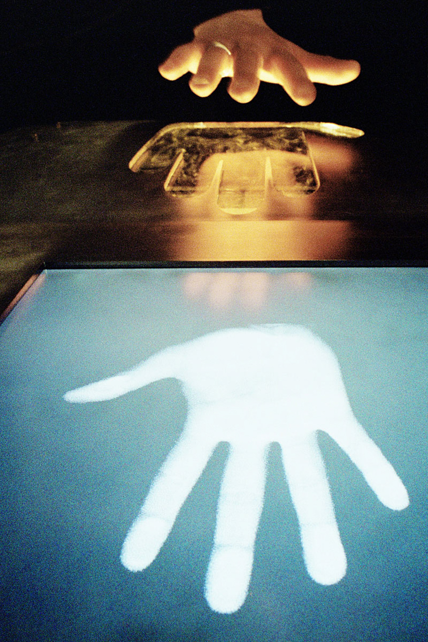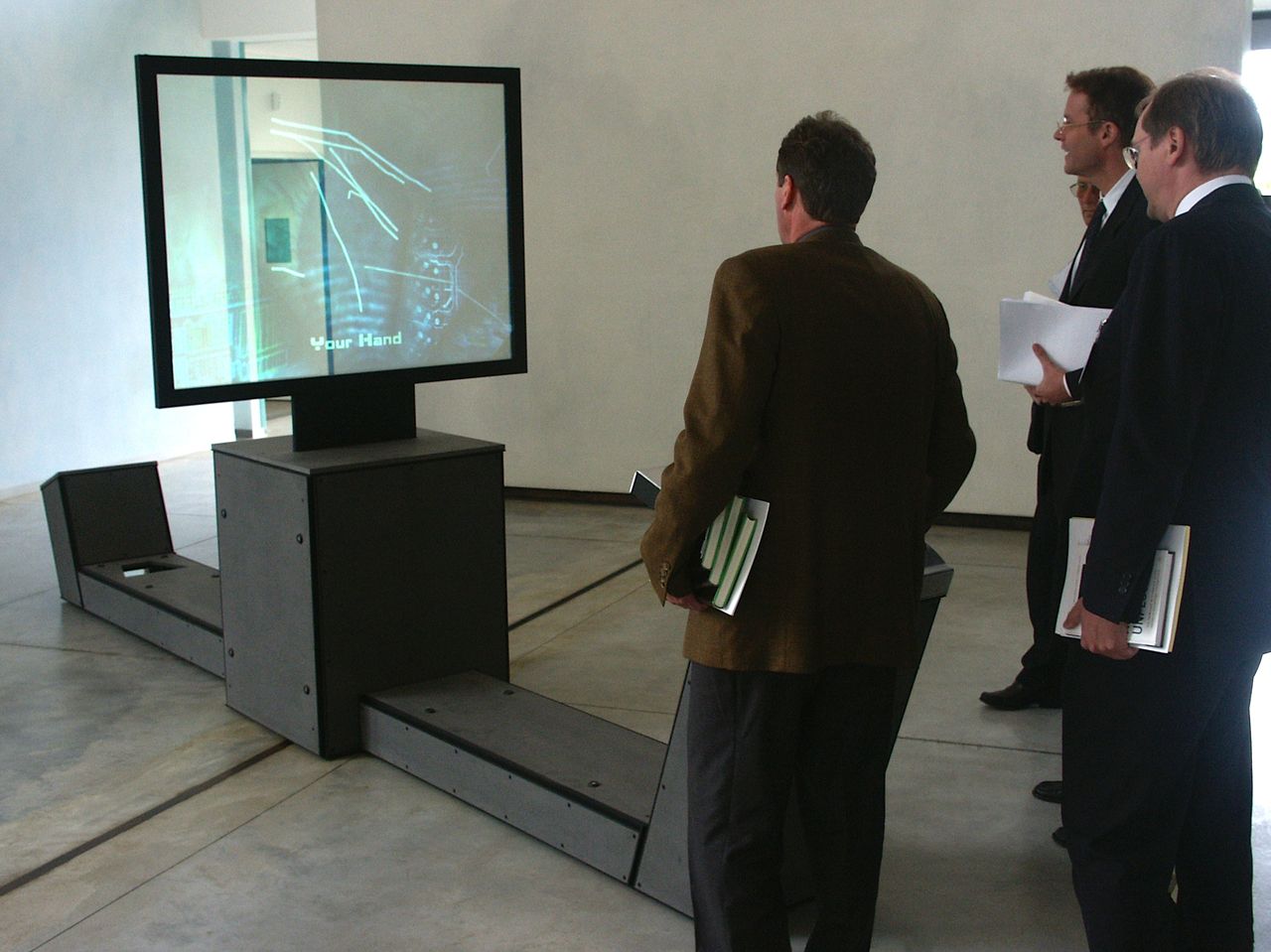 Manfred Wolff-Plottegg’s design of the ZKM installation is a curvilinear black cavity where the usually planar and orthogonal surfaces of walls, floor, and ceiling are substituted by an amorphous environment in which the the Web of Life’s 3-D projected formations emerge into foreground of the visitors’ experience. Entering the space, the viewers face a large 3.35m x 7m screen, onto which two high-resolution video projectors present a dynamic flow of sterescopic images. At the center of this room is the user input device, which offers the visitor a defined surface to put their hand where it is photographed through a glass plate. On an adjacent monitor, the video image of this hand is shown and digitally processed to reveal the main palm lines. These lines then appear on the large projection screen where they have a direct effect on the behavior and contents of the projected imagery, as well as on the sound environment.