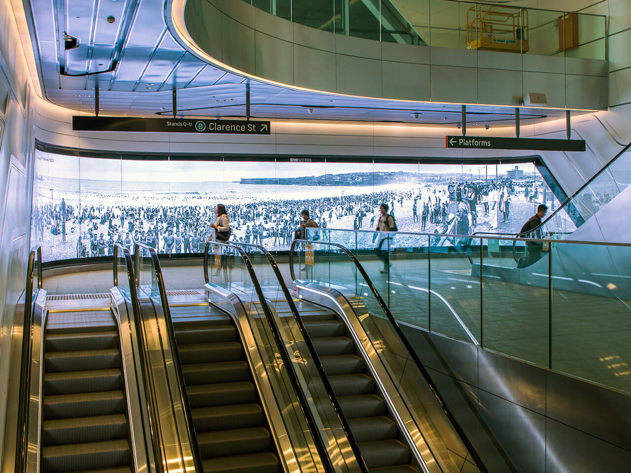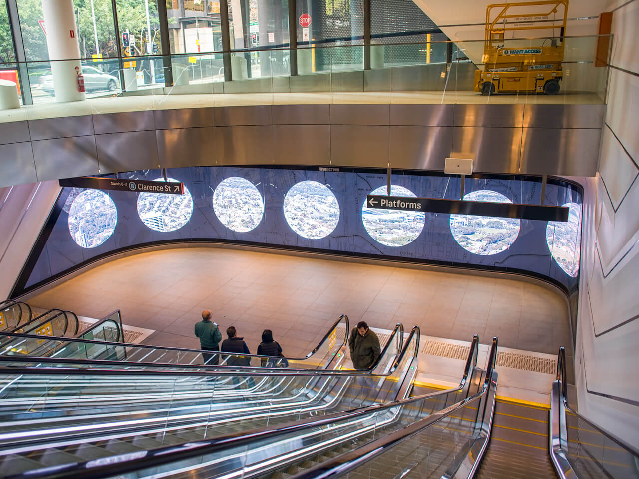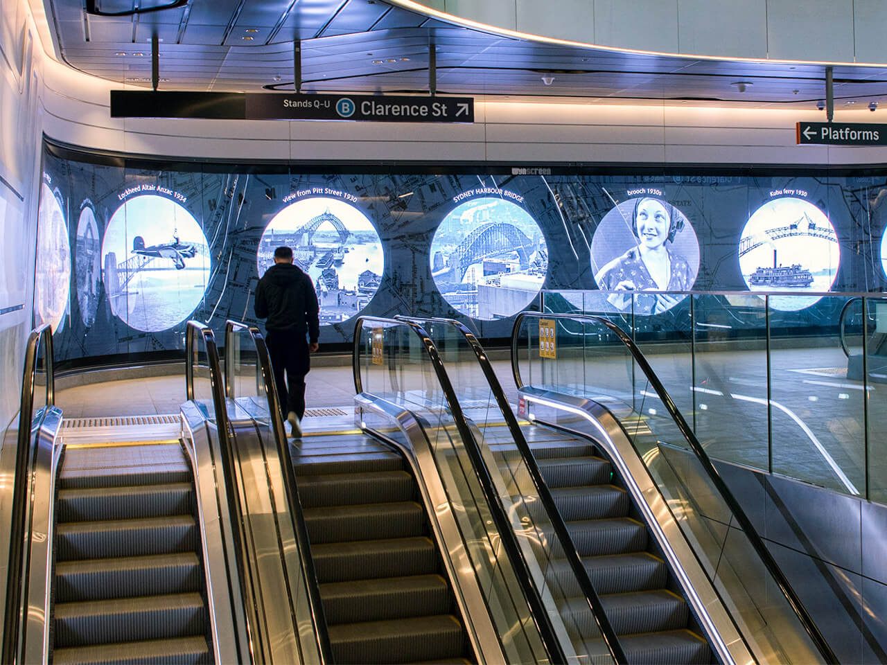 Through Zooming Sydney, the travellers within Wynyard station voyage outside into Sydney’s spectacular expanse as journeyers from place to place, engaging with the rich urban memory and cultural history that is inscribed in its material fabric and its imaginary. The conjunction of cinematic flow and narrative texture make this artwork perfectly matched to the peripatetic modes of looking and experiencing shared by commuters across Sydney. It’s for people who are on the move, creating a confluence of their travels with the projected movement of Zooming Sydney’s virtual camera as it goes about its own circumlocutory journeys to various destinations - an existential adventure constituted by Sydney’s natural, architectonic and cultural identity.